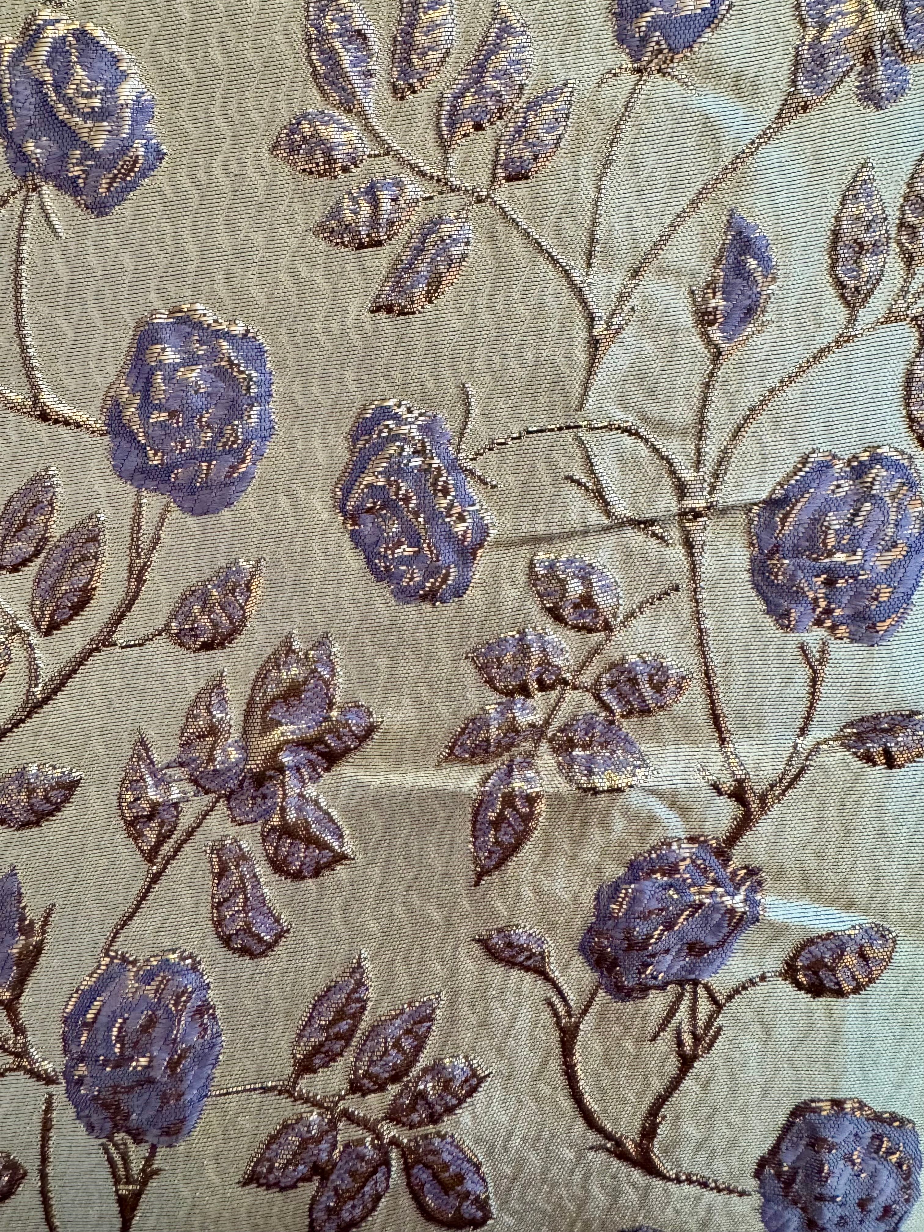 Priced per yard. Gorgeous, palest rose-gold with lilac small flower designs on one side, lilac base with silvery flower design on other side, reversible brocade. 56/57-inches wide.