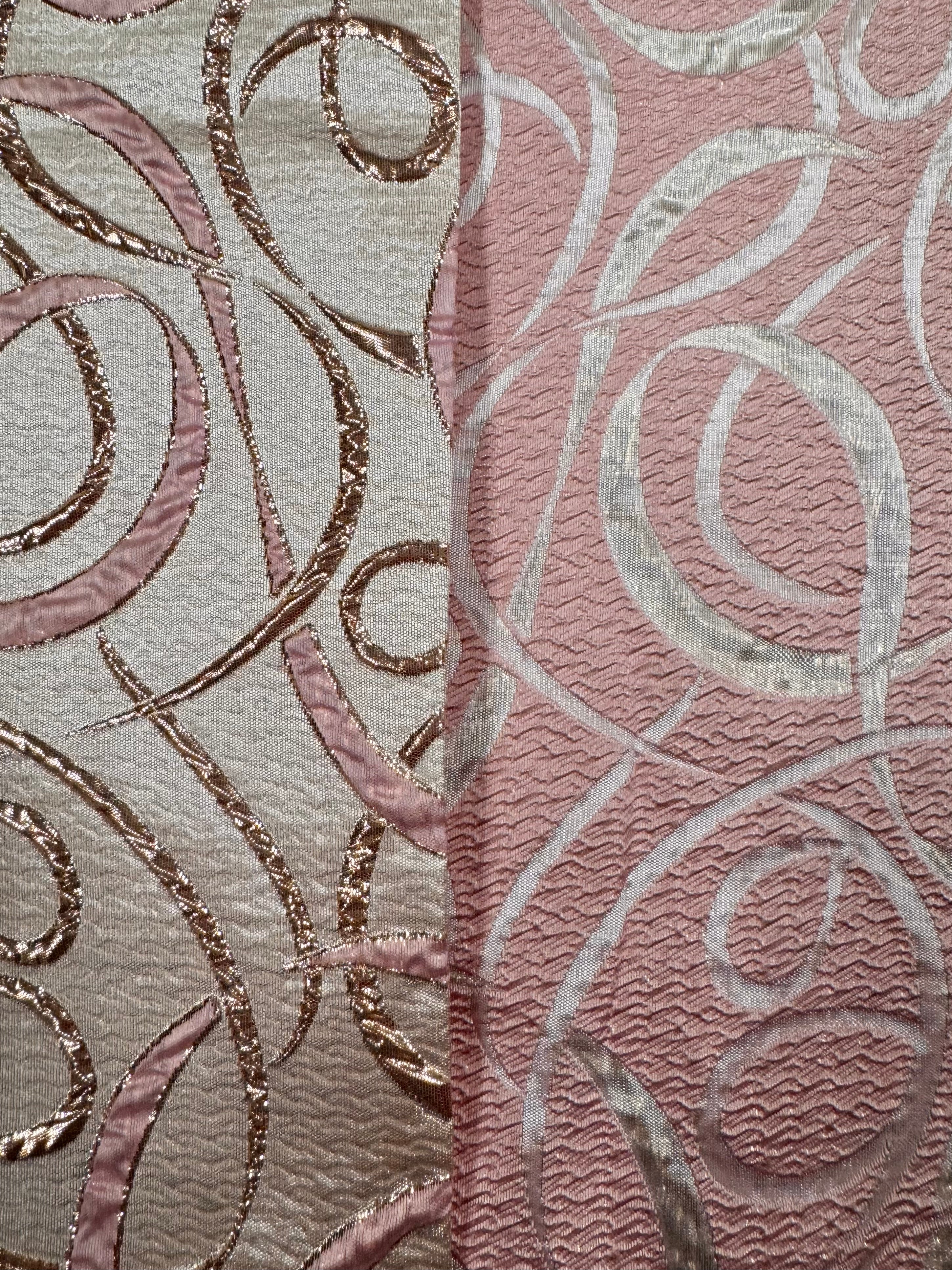 Pictured here: First picture is both sides of the fabric. Second picture is side with both pink and gold swirls. Third picture is side showing light pink background.