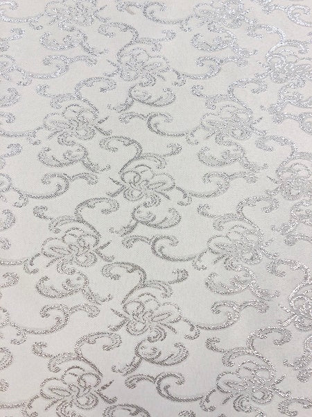 Priced per yard. White and silver design brocade, 57-inches wide.
