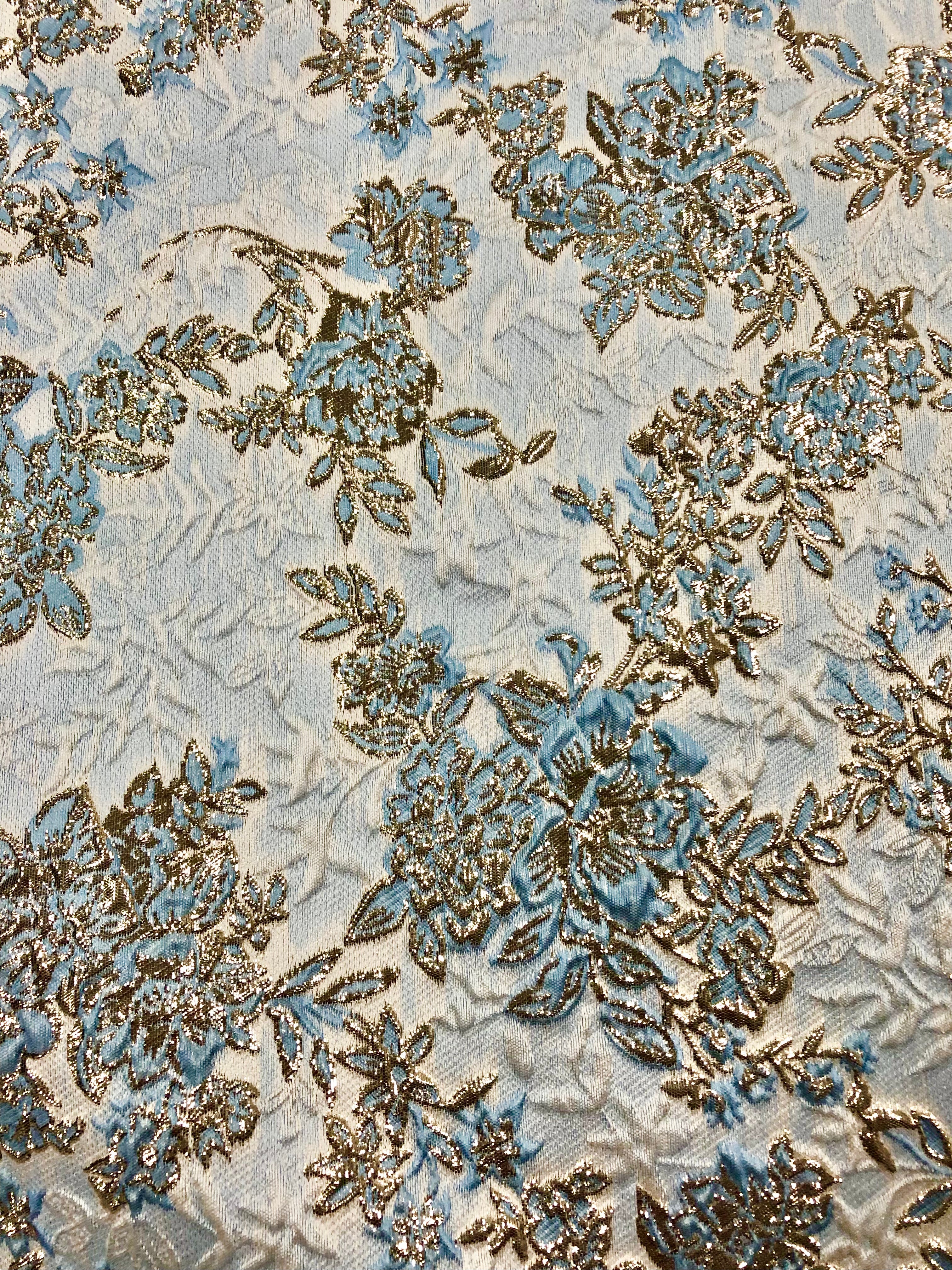 Priced per yard. Gorgeous, palest gold with blue and winter white, reversible brocade. 58-inches wide. One of our most popular brocades!
