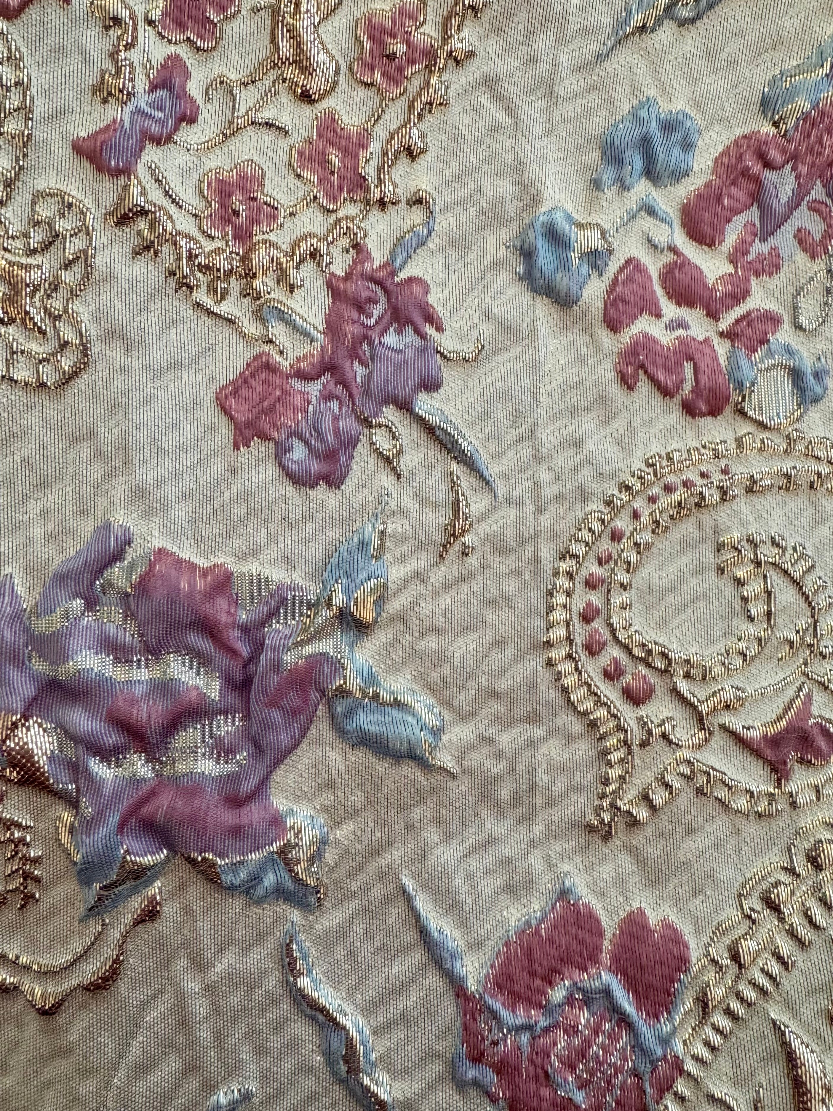 Priced per yard. Gorgeous, palest rose-gold with periwinkle blue, and mauve pink designs on one side, lilac base on other side, reversible brocade. 58-inches wide.