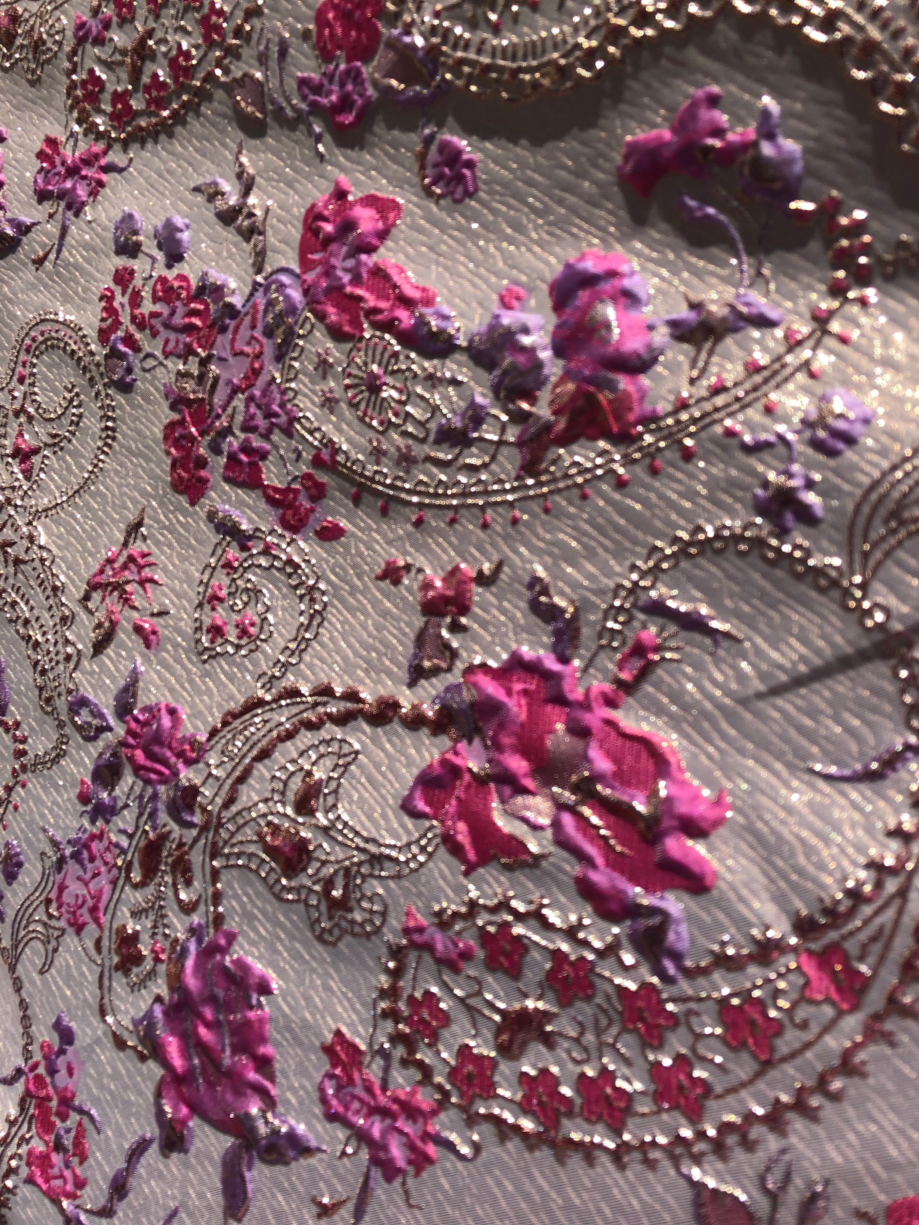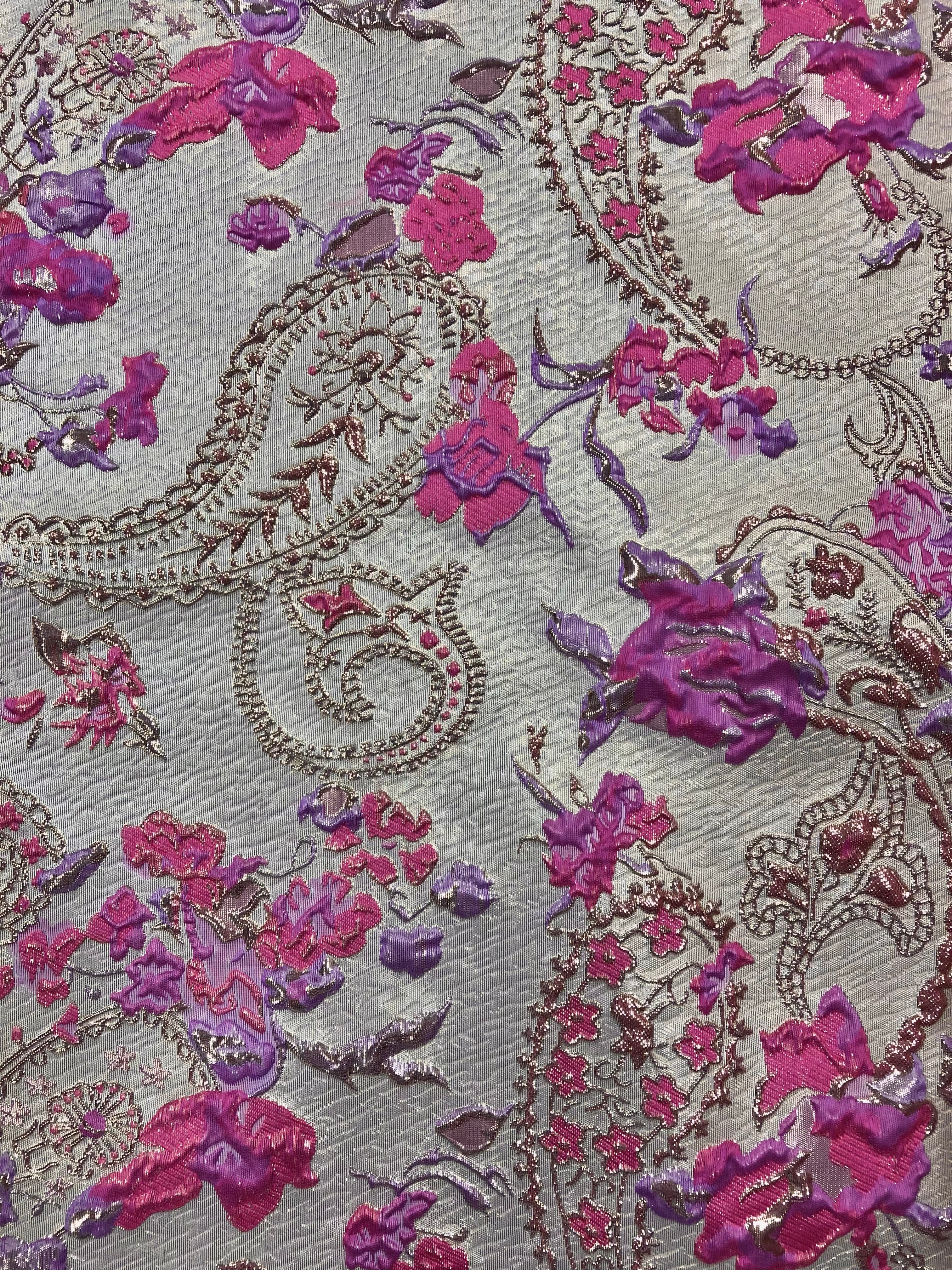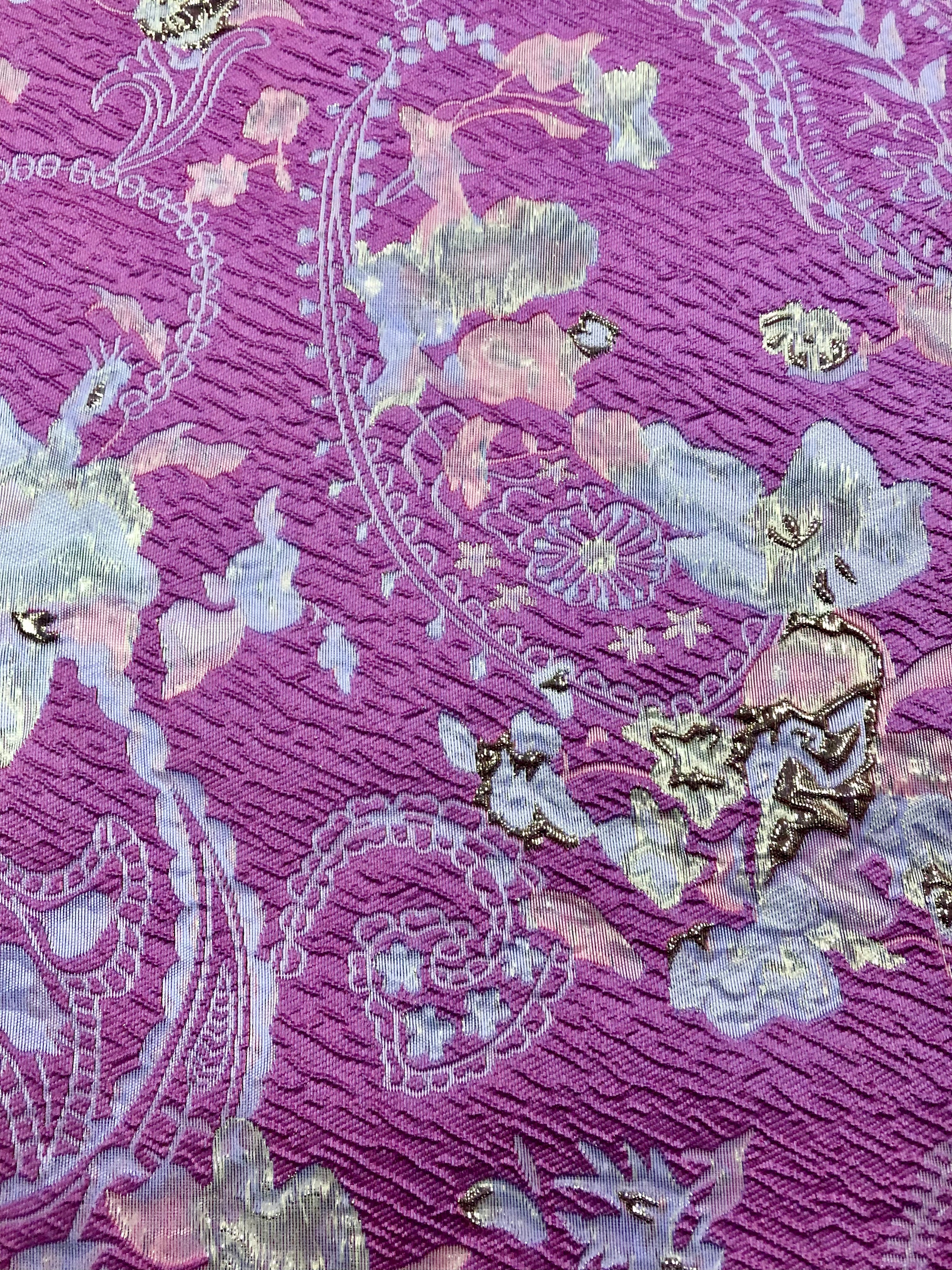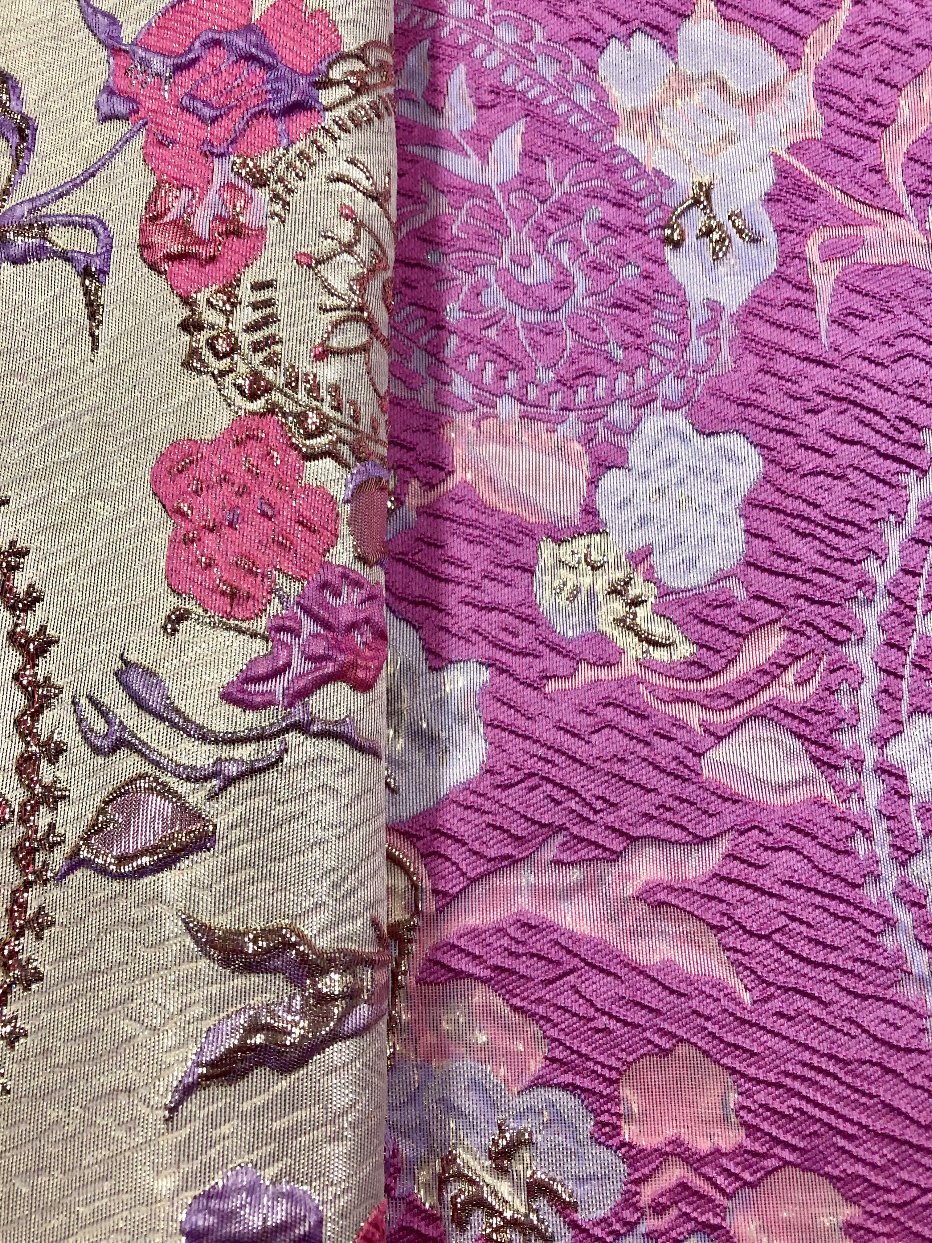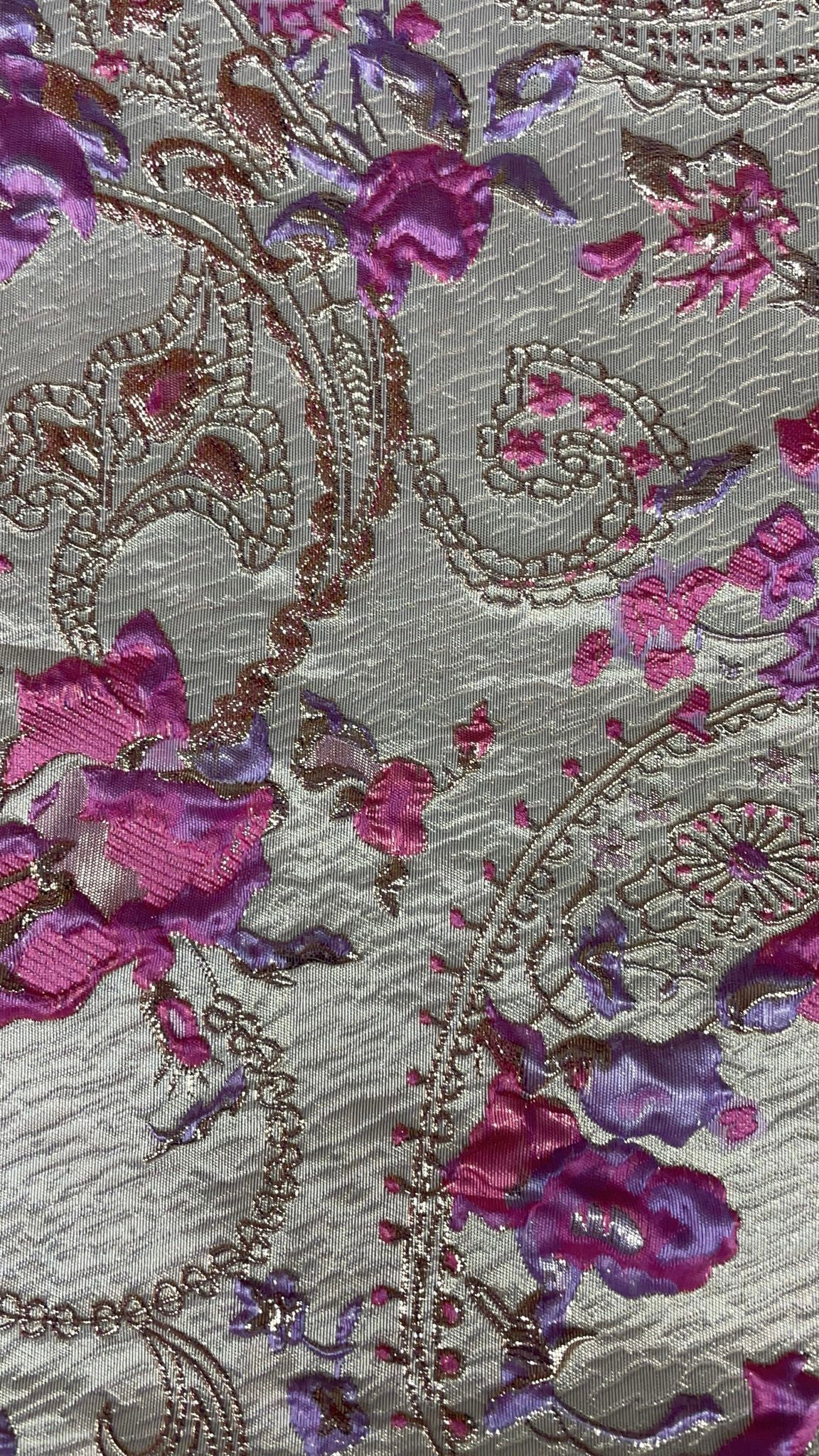 Priced per yard. Gorgeous, palest rose gold with fuchsia and lilac reversible brocade. 58-inches wide.