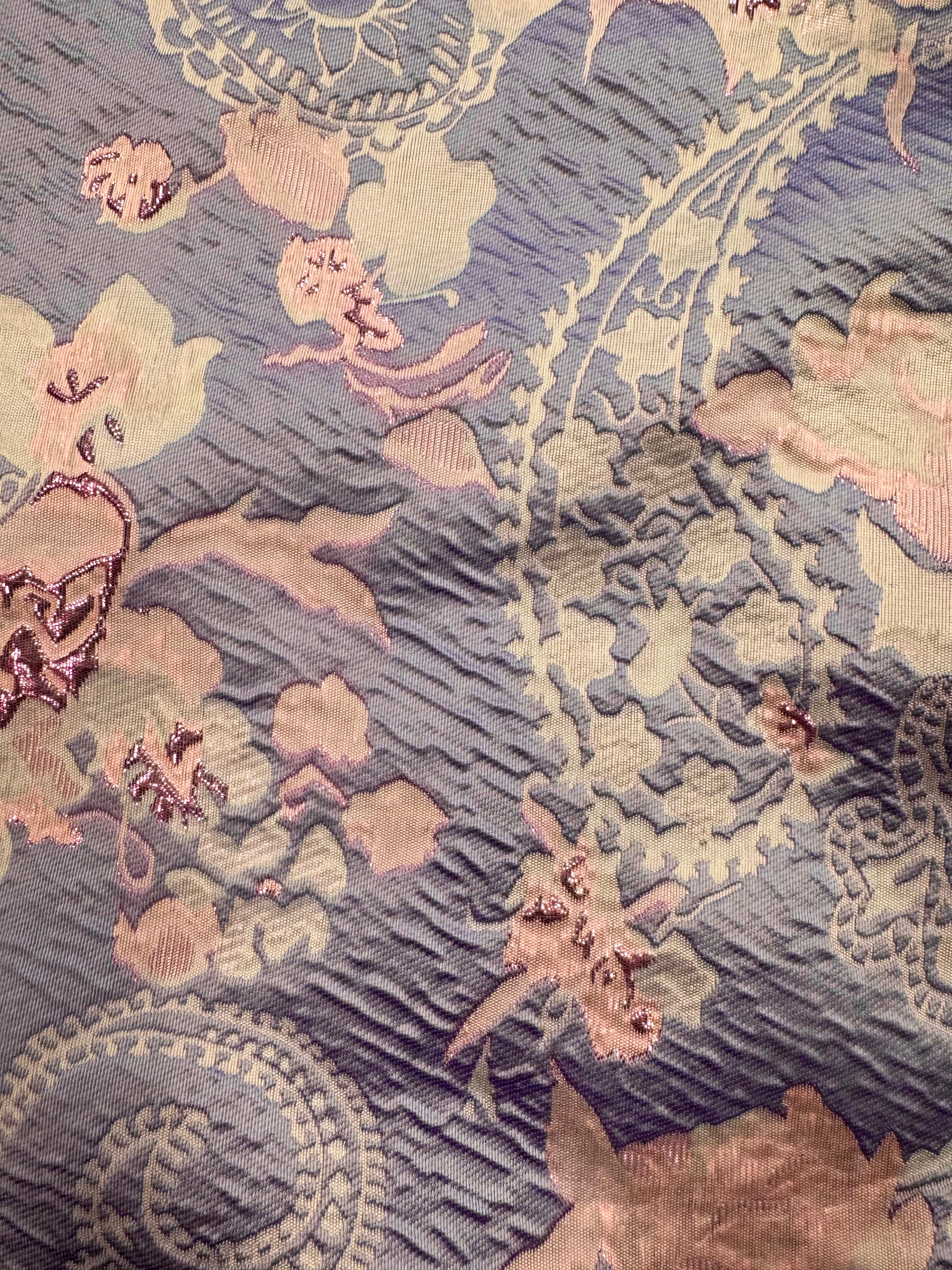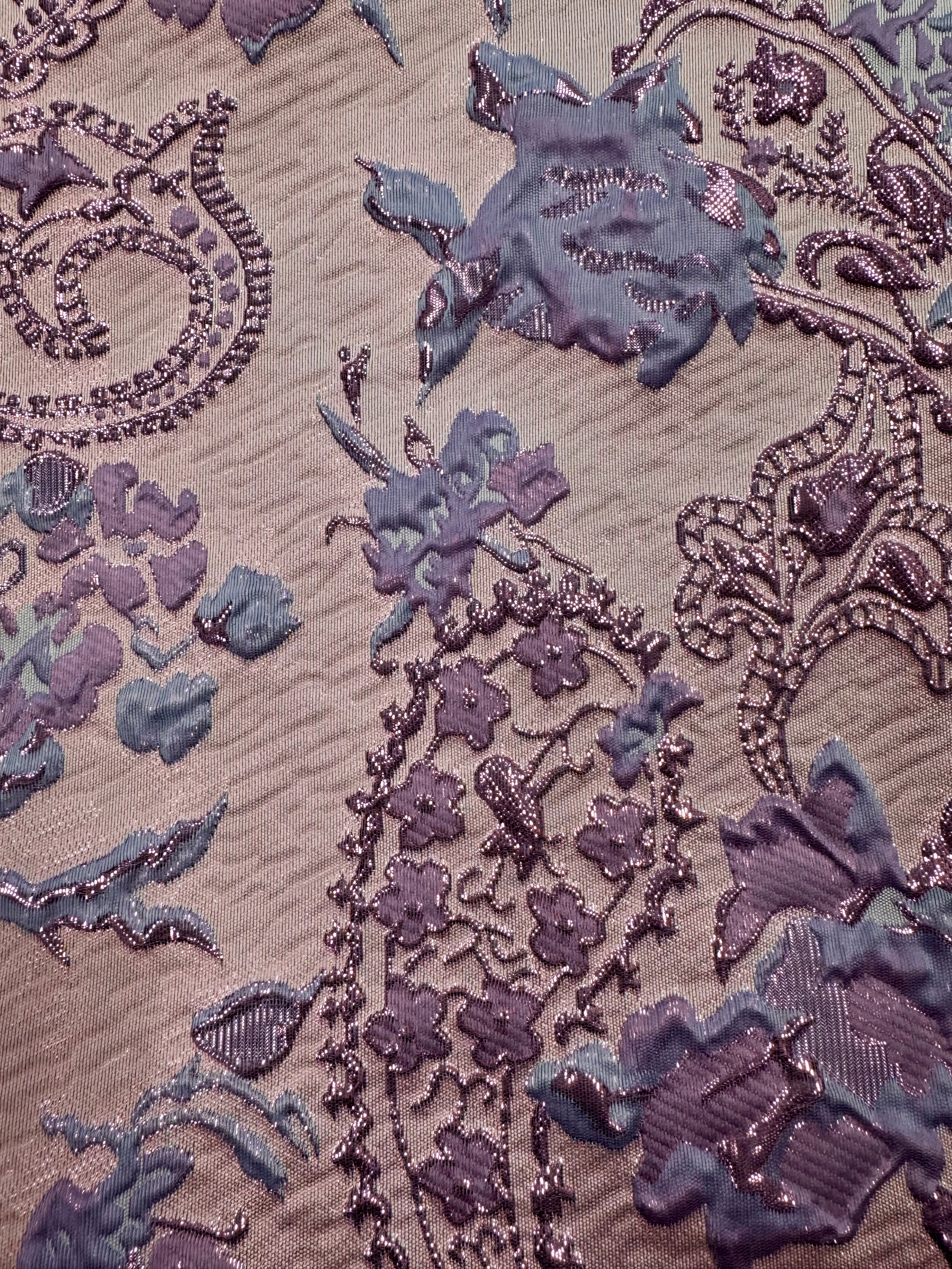 Priced per yard. Gorgeous, palest lilac with periwinkle blue, and lavender designs reversible brocade. 58-inches wide.