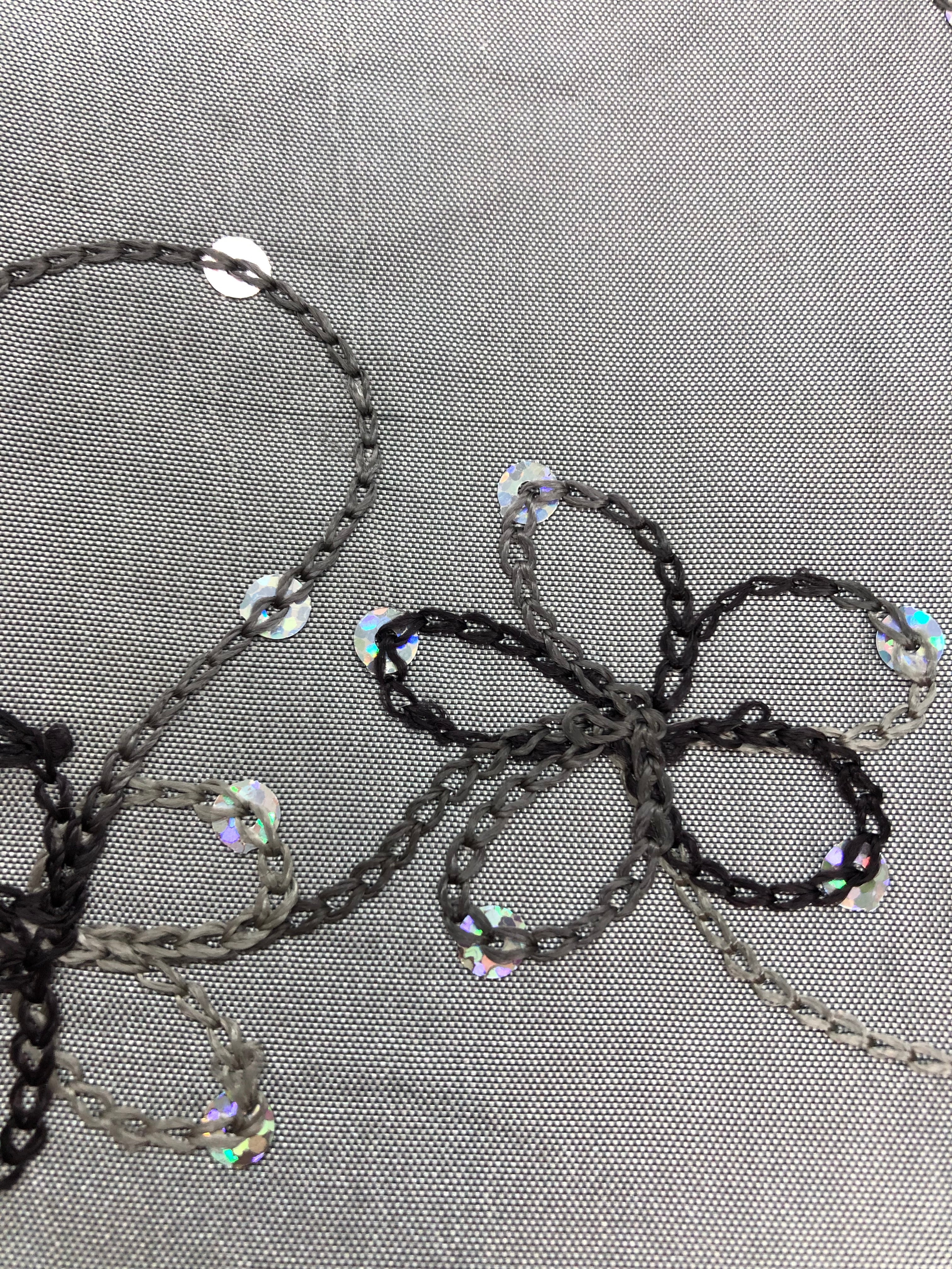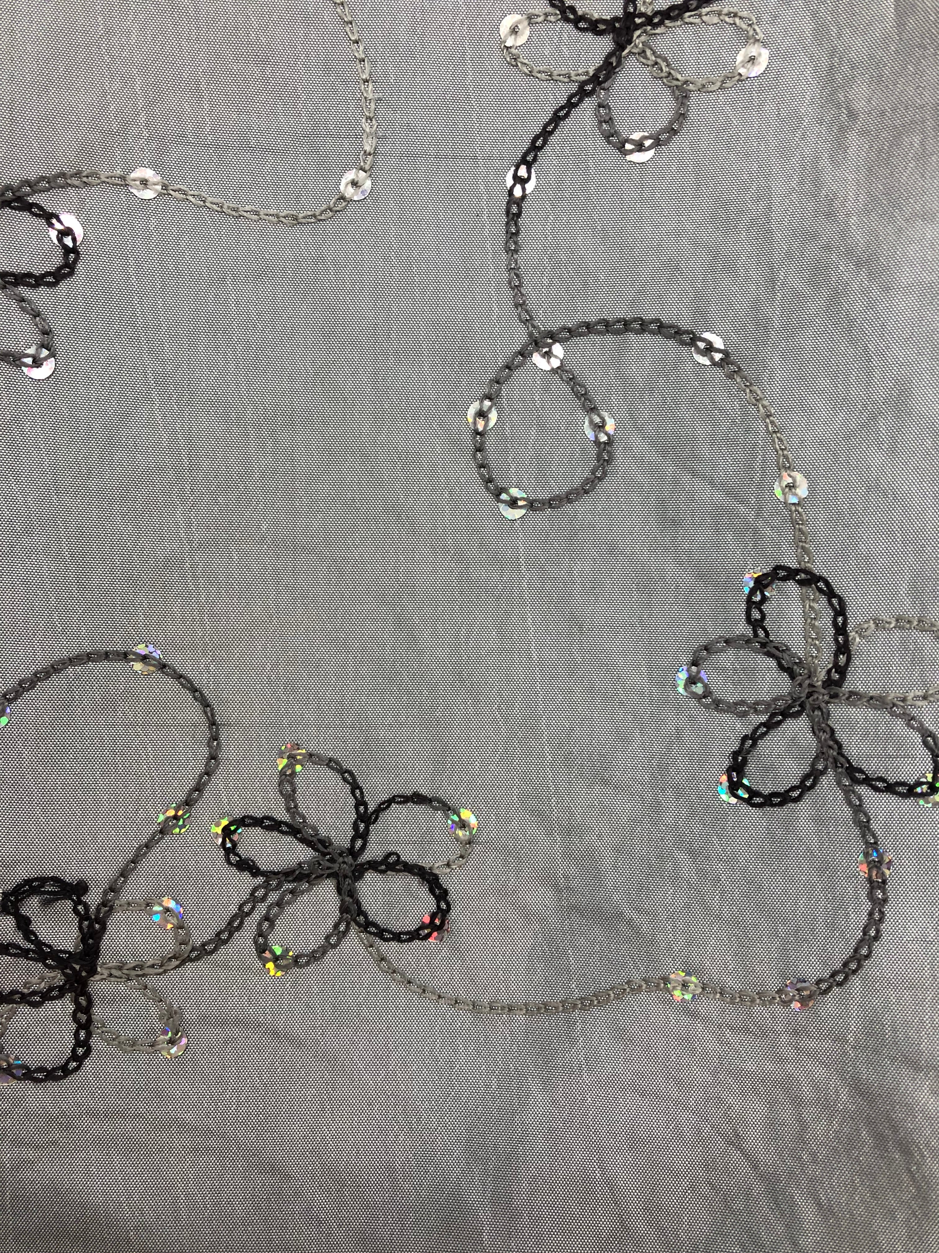 Priced per 1-yard piece. Beautiful embroidered silver-grey taffeta with sequins. 59-inches wide.