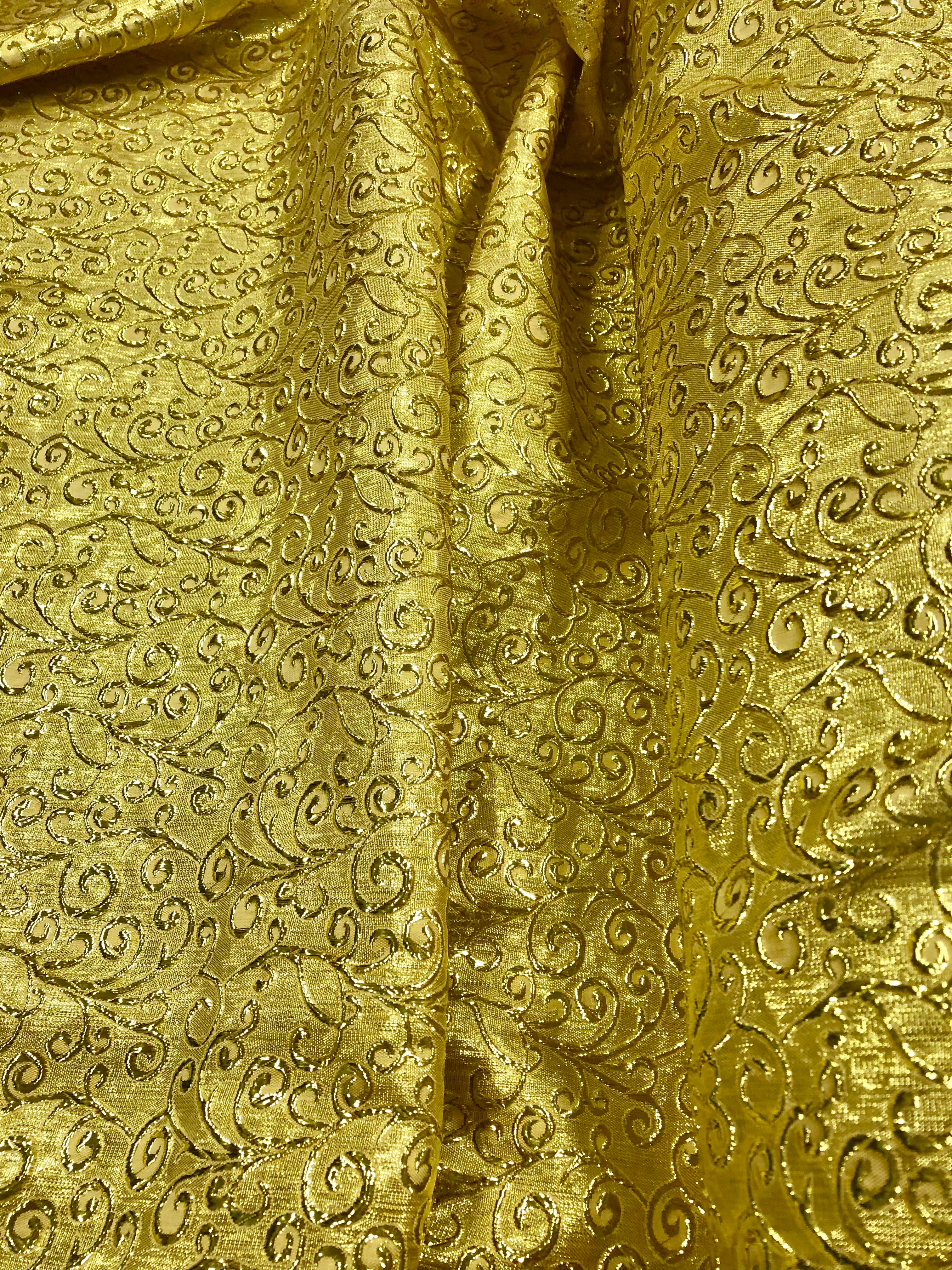 Priced per yard. Bright gold swirl brocade. 59-inches wide. Perfect for a classical tutu bodice, and many other uses. Lightweight.