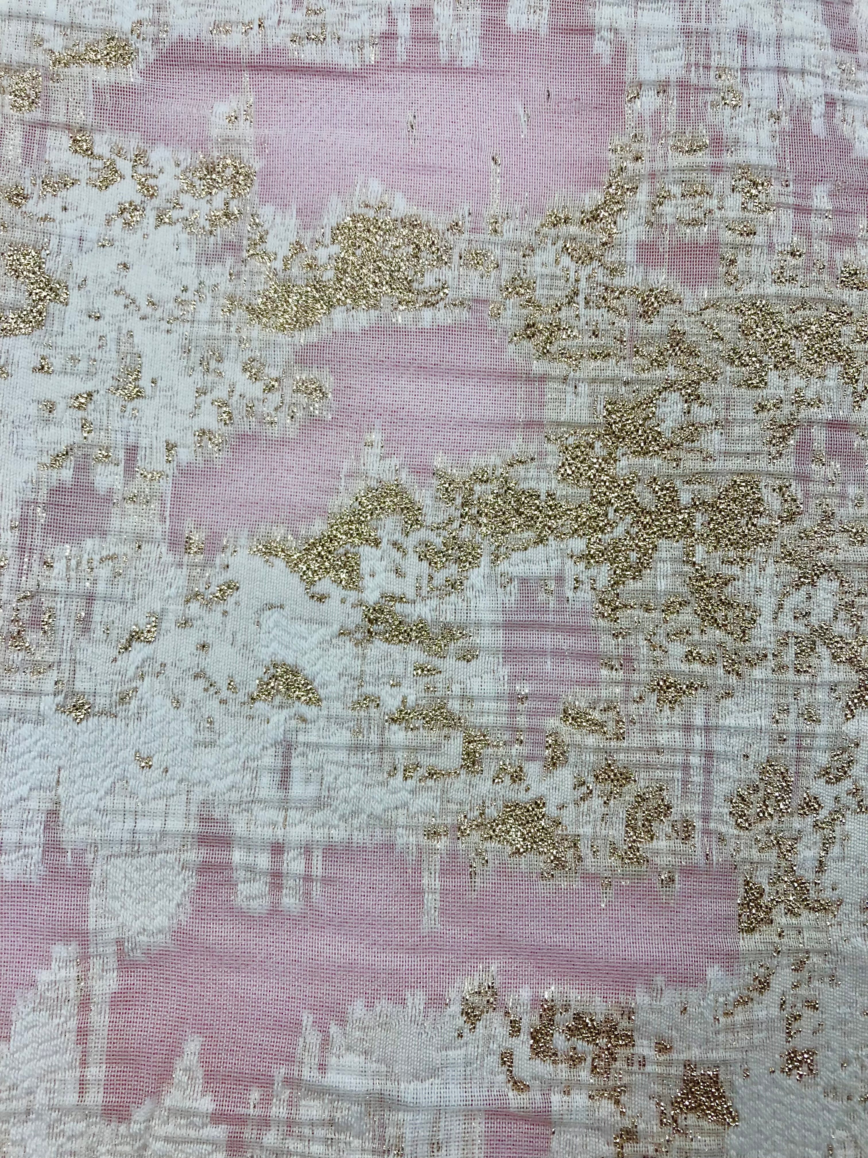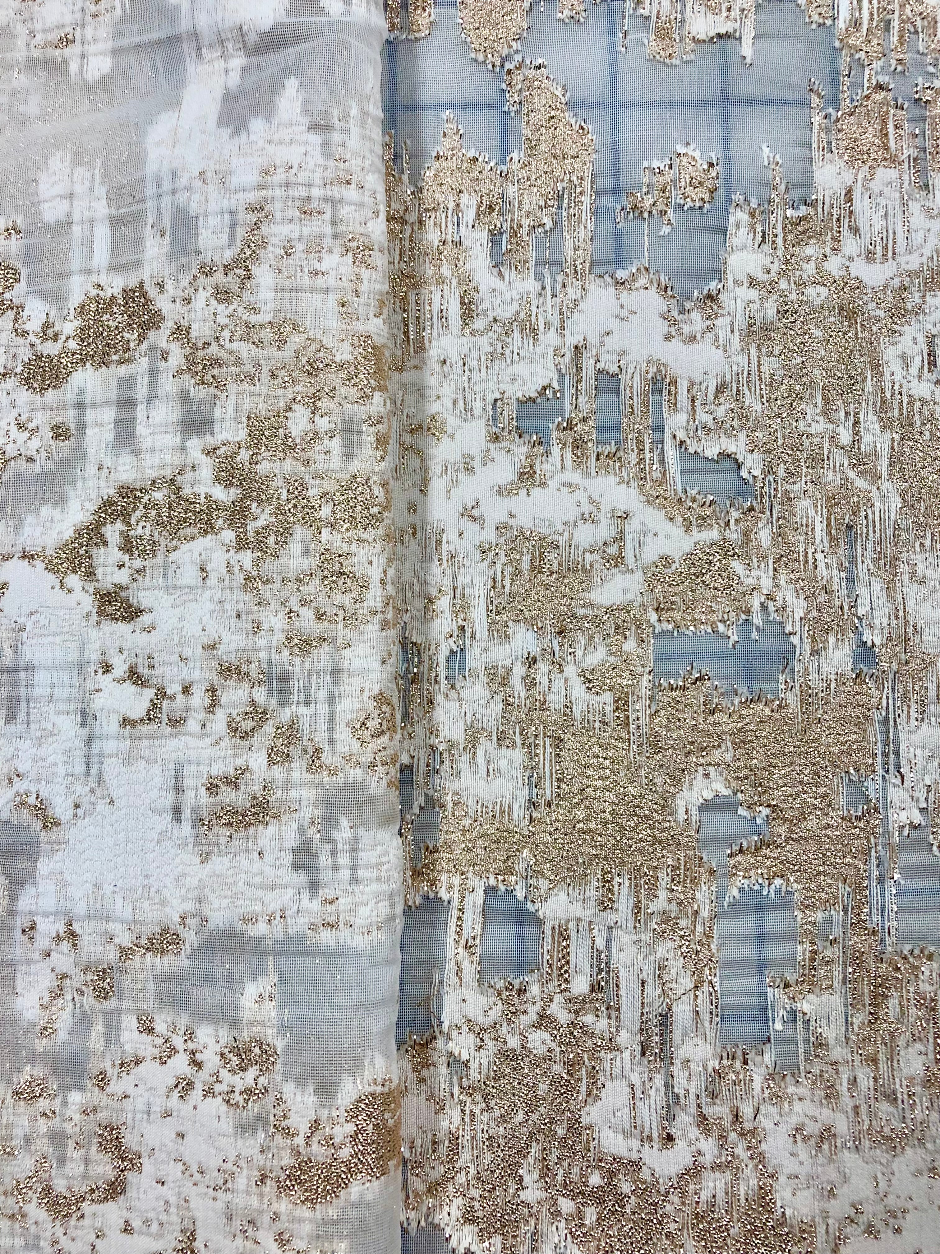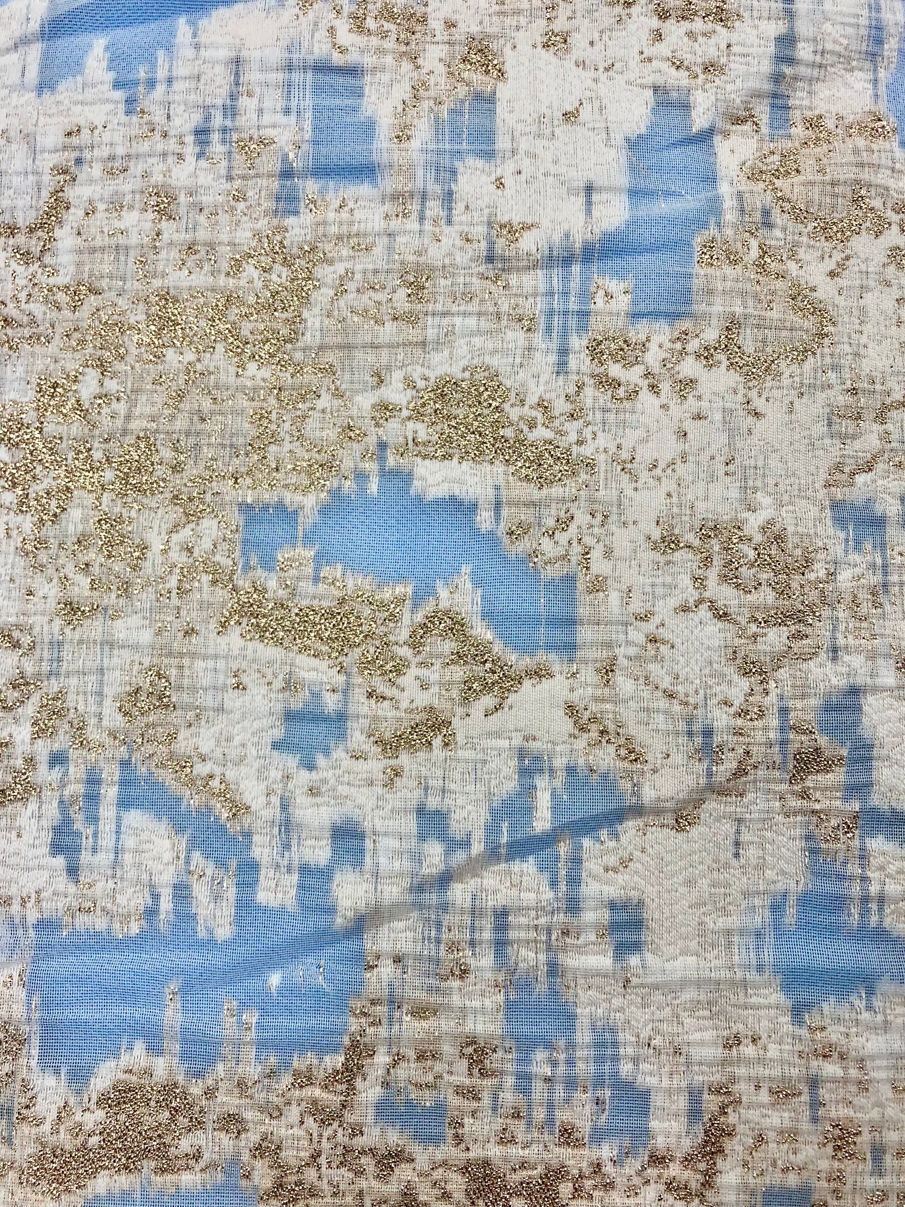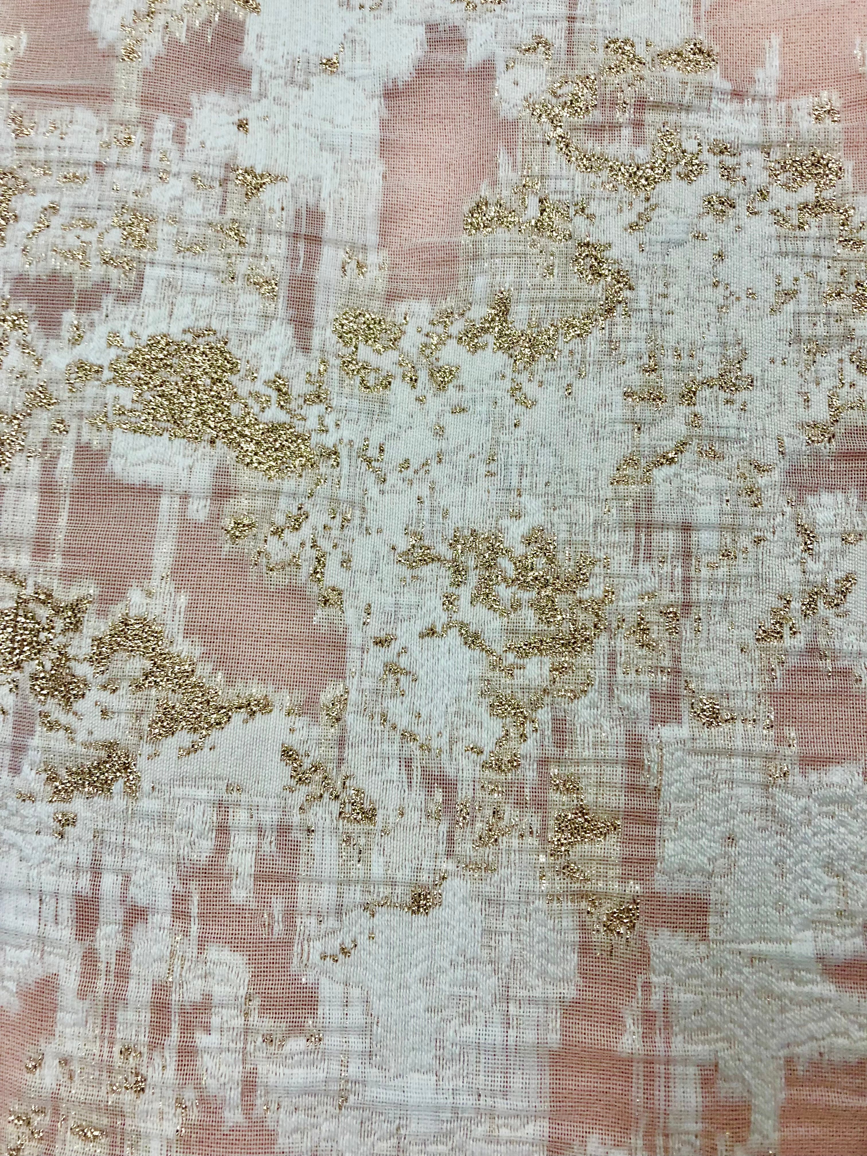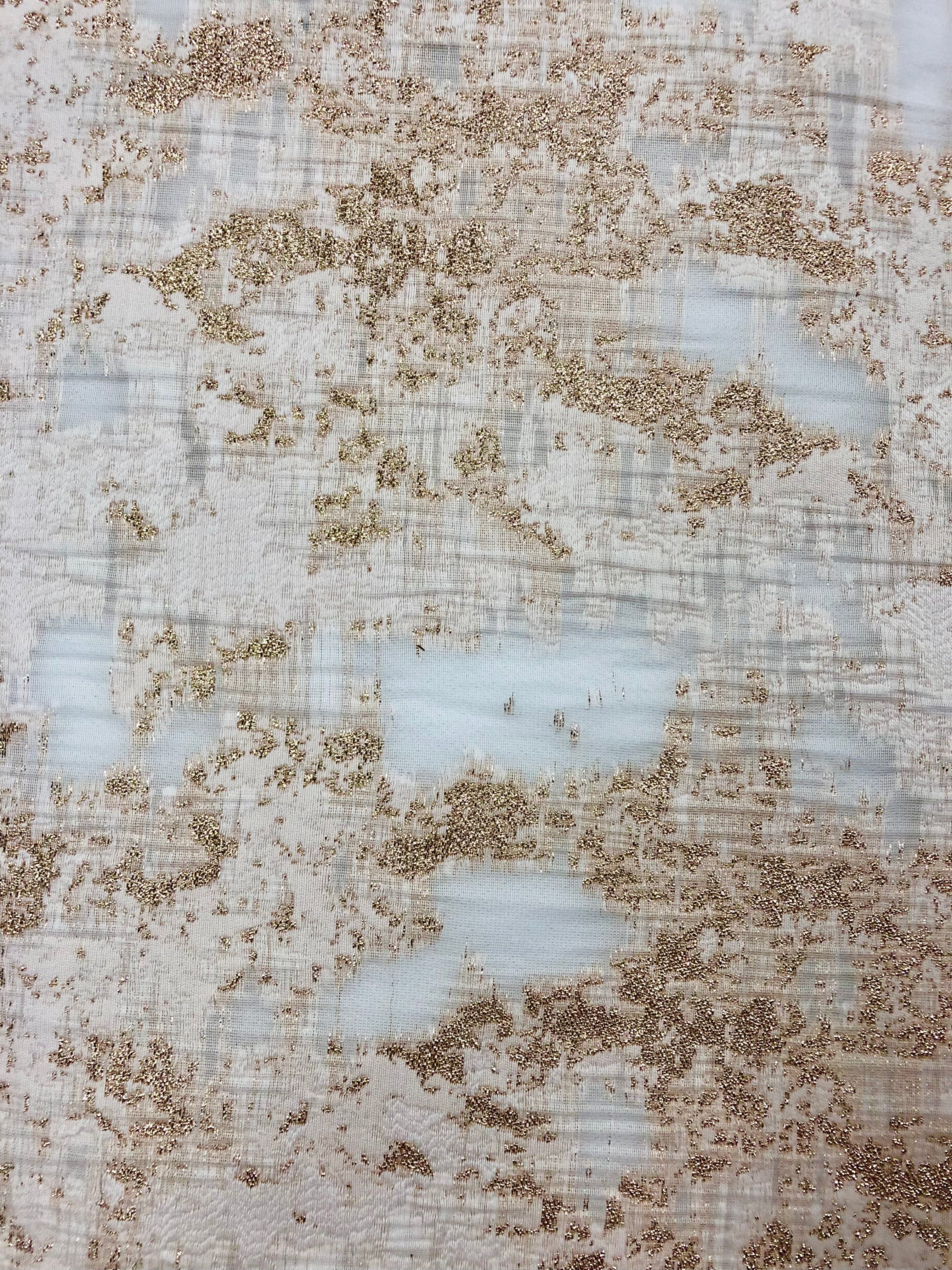 Priced per yard. Gorgeous, light ivory with palest metallic gold organza brocade. 60-inches wide.