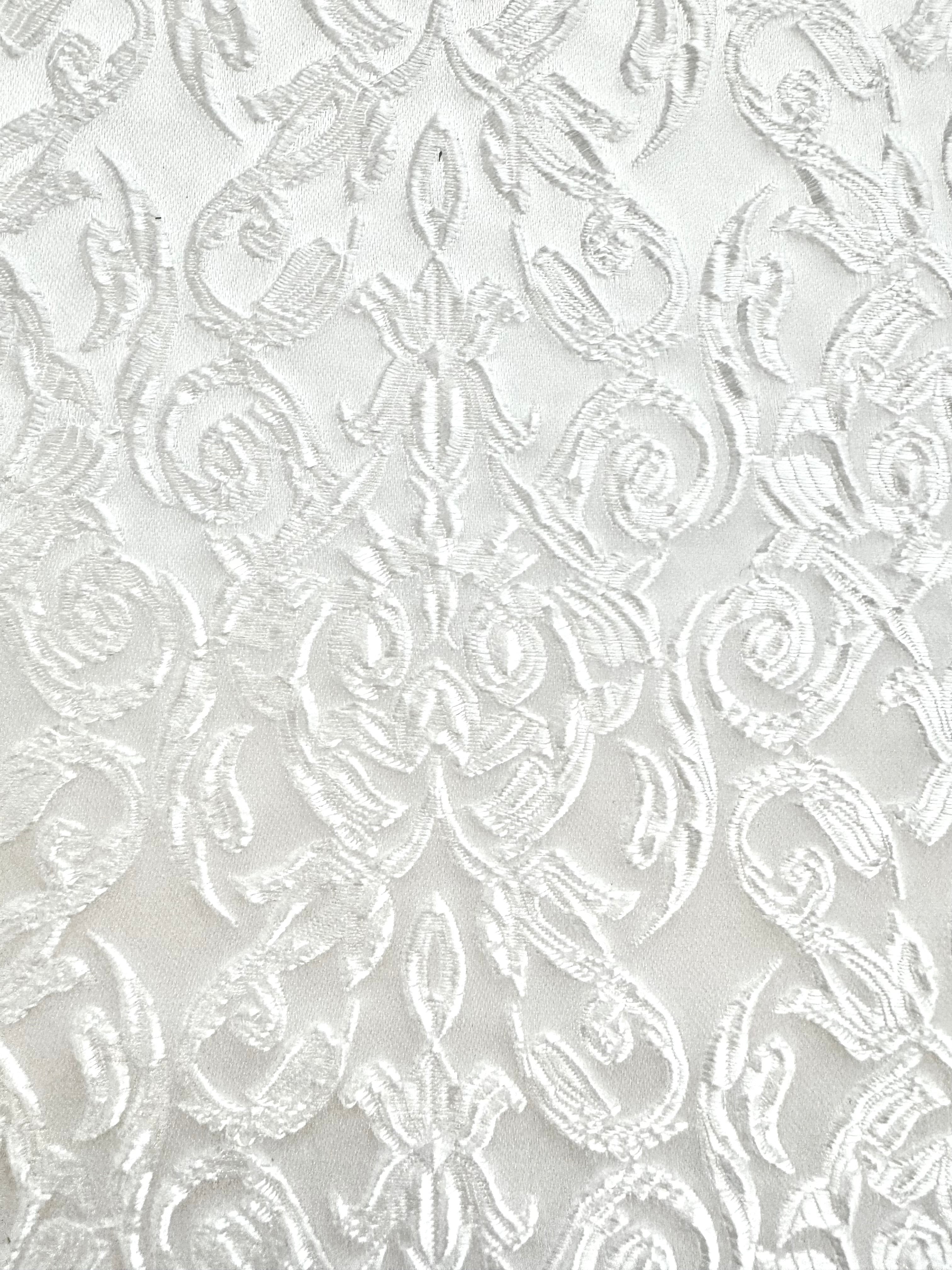 Priced per yard. Gorgeous, white satin brocade.Reversible - one side has a beautiful, small, raised design. The other side has a flat design. 60-inches wide.