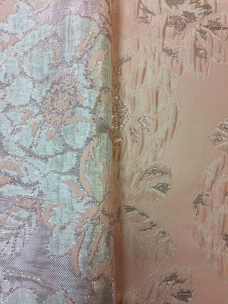 Priced per yard. Beautiful metallic pink coral brocade. 60-inches wide. Can be used on either side. Smallest length sold online: one-yard.
