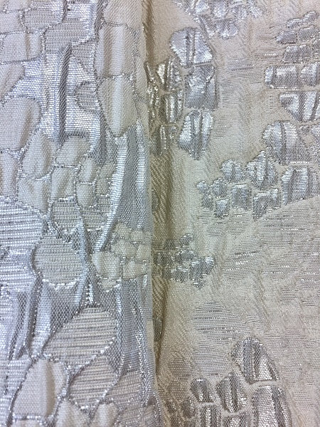Priced per yard. Beautiful silver and cream metallic reversible brocade. 60-inches wide. Can be used on either side. Smallest length sold online: one-yard.