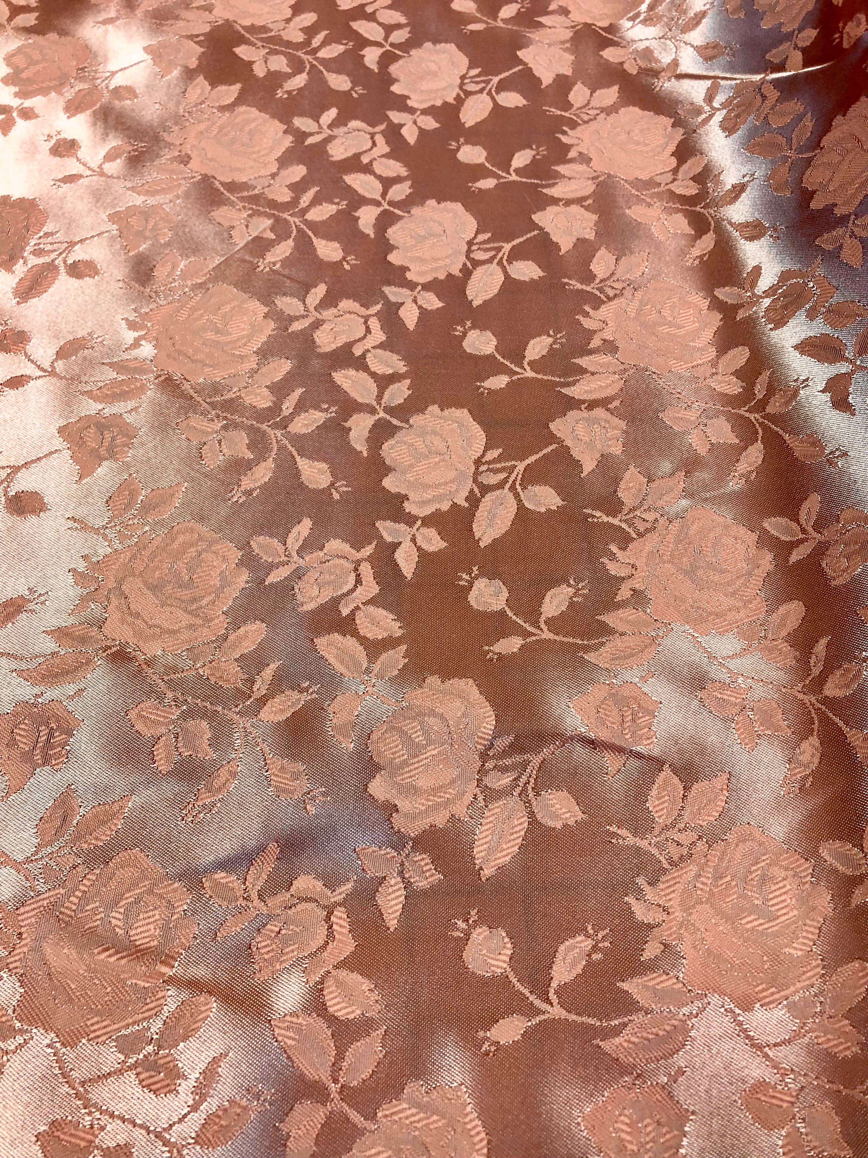 Priced per yard. Peach satin Jacquard. 60-inches wide. Great weight for ballet bodices and men's tunics/jackets. Can be used on the shiney or the matte side.