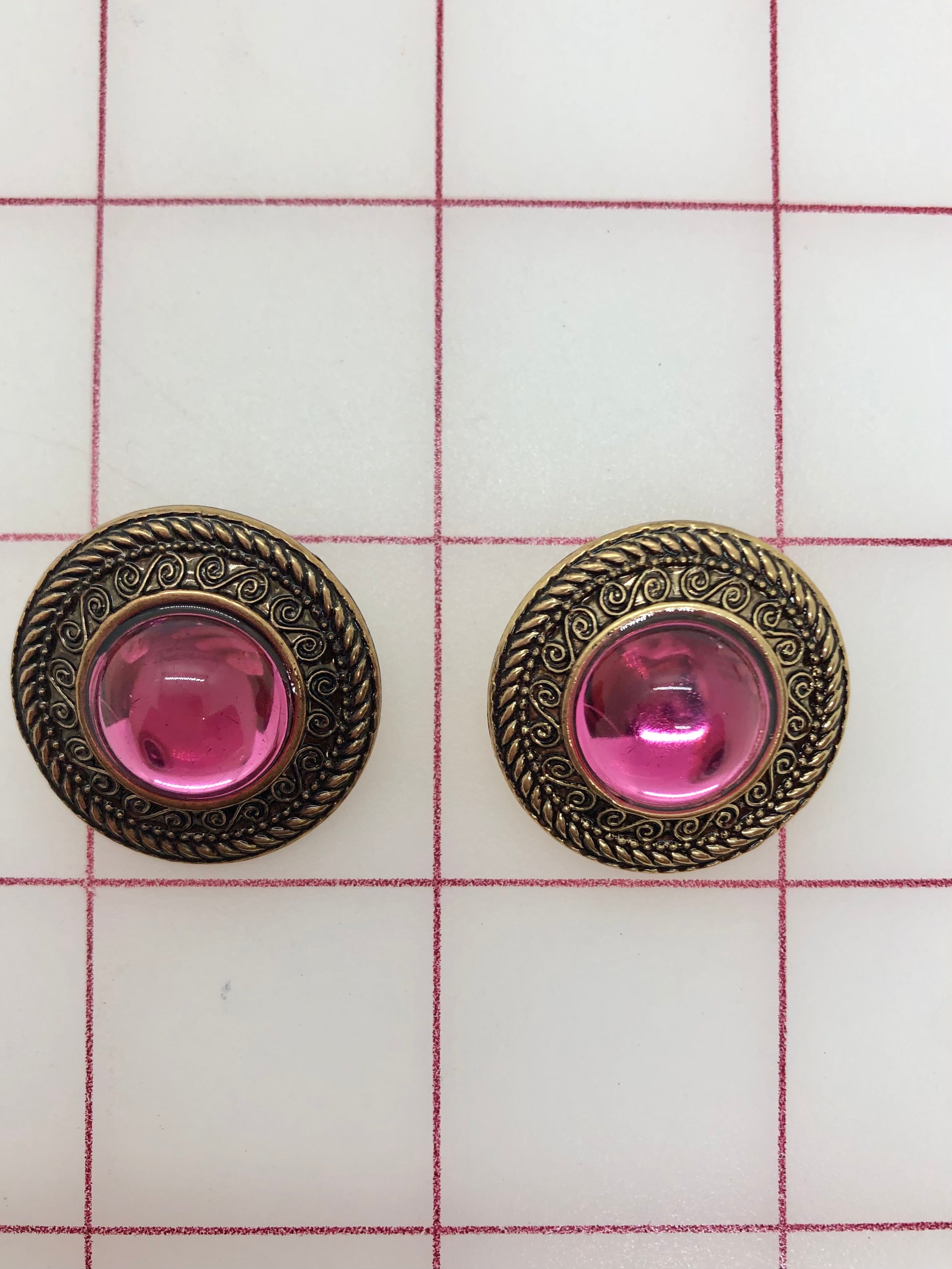 Priced per 2-pack. Pink acrylic rhinestone in antique gold metallic plastic button. Gorgeous! Can be used as a finishing touch on costumes, tiaras and other headpieces. Perfect for a center piece on a tiara. Lightweight.
