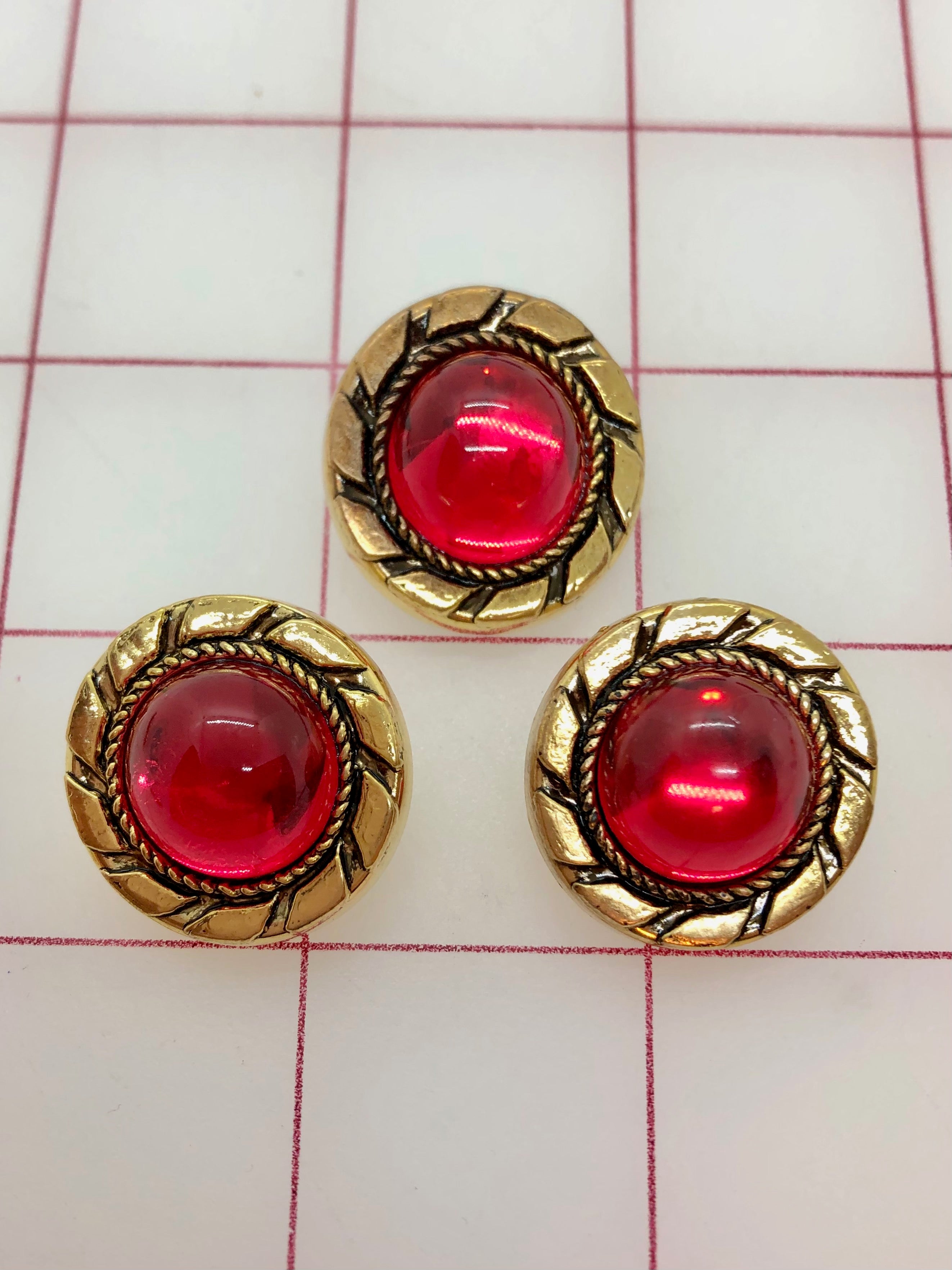 Priced per 3-pack. Candy Apple Red acrylic rhinestone in round gold metallic plastic button. Gorgeous! Can be used as a finishing touch on costumes, tiaras and other headpieces. Perfect for a center piece on a tiara. Lightweight.
