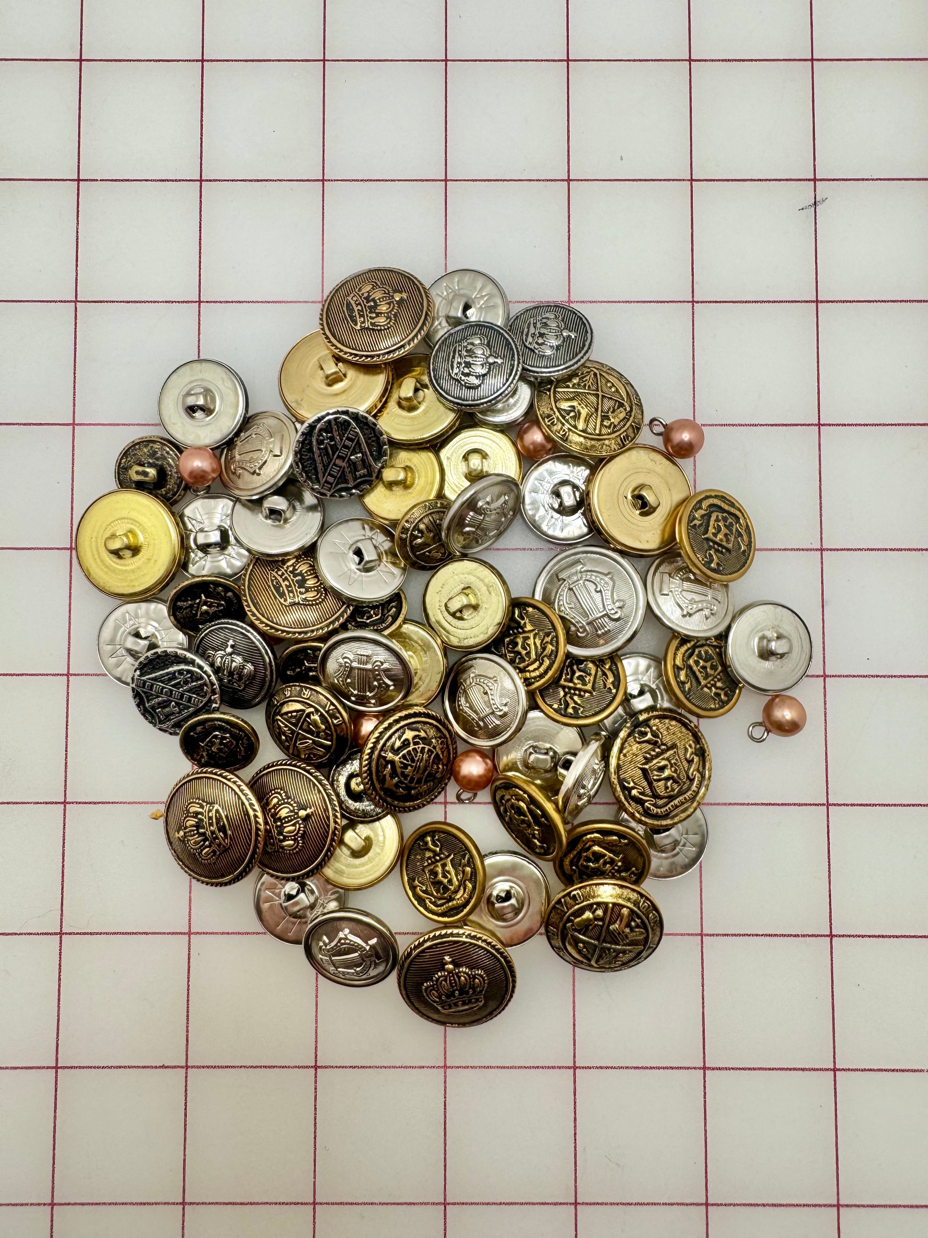 Priced per 69 buttons. Top quality, assorted metallic, buttons. Assorted sizes and designs.