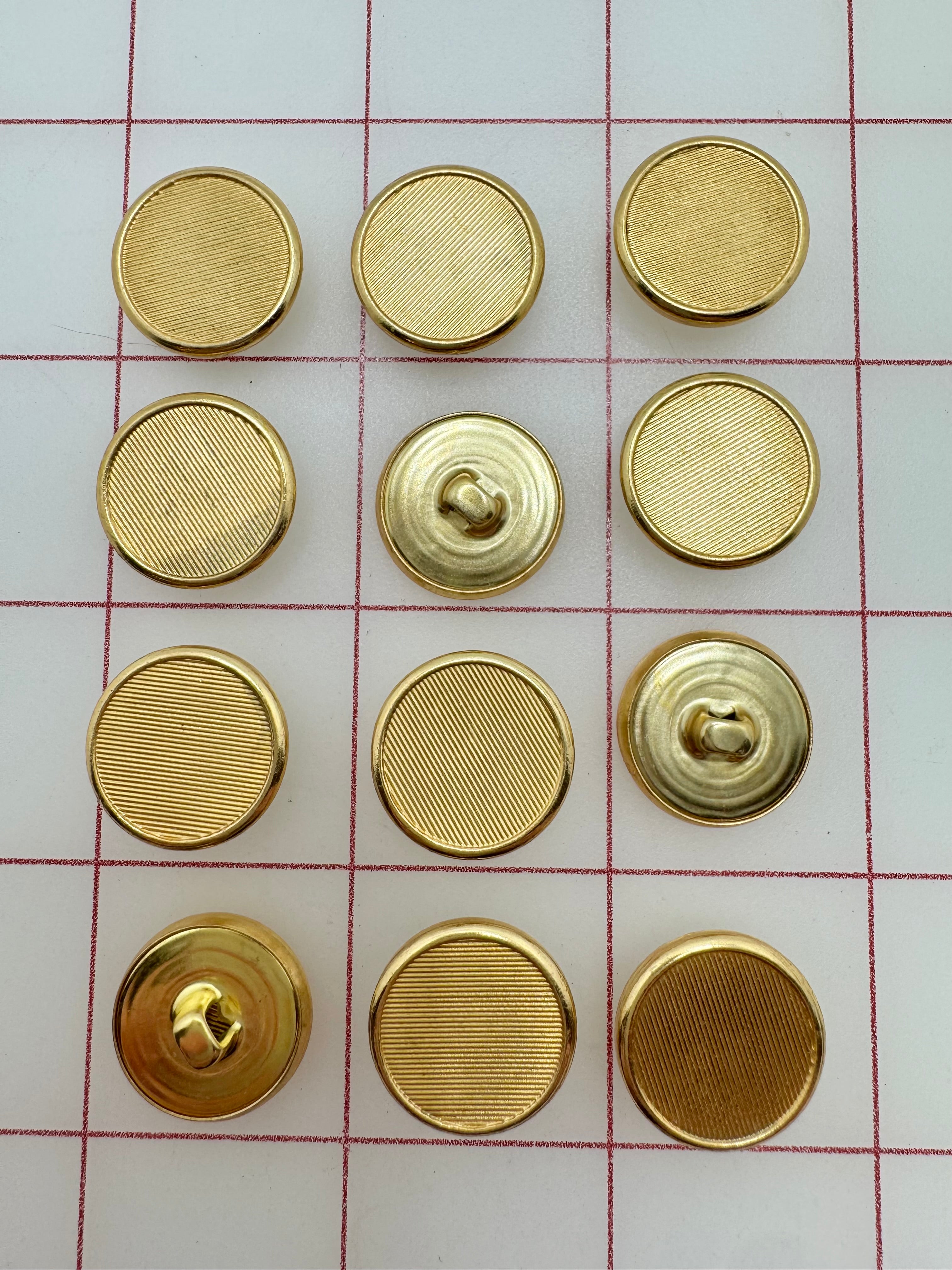Priced per dozen. Top quality, bright metallic-gold, imported Italian buttons. Size 30L = 19mm, 3/4-inch.