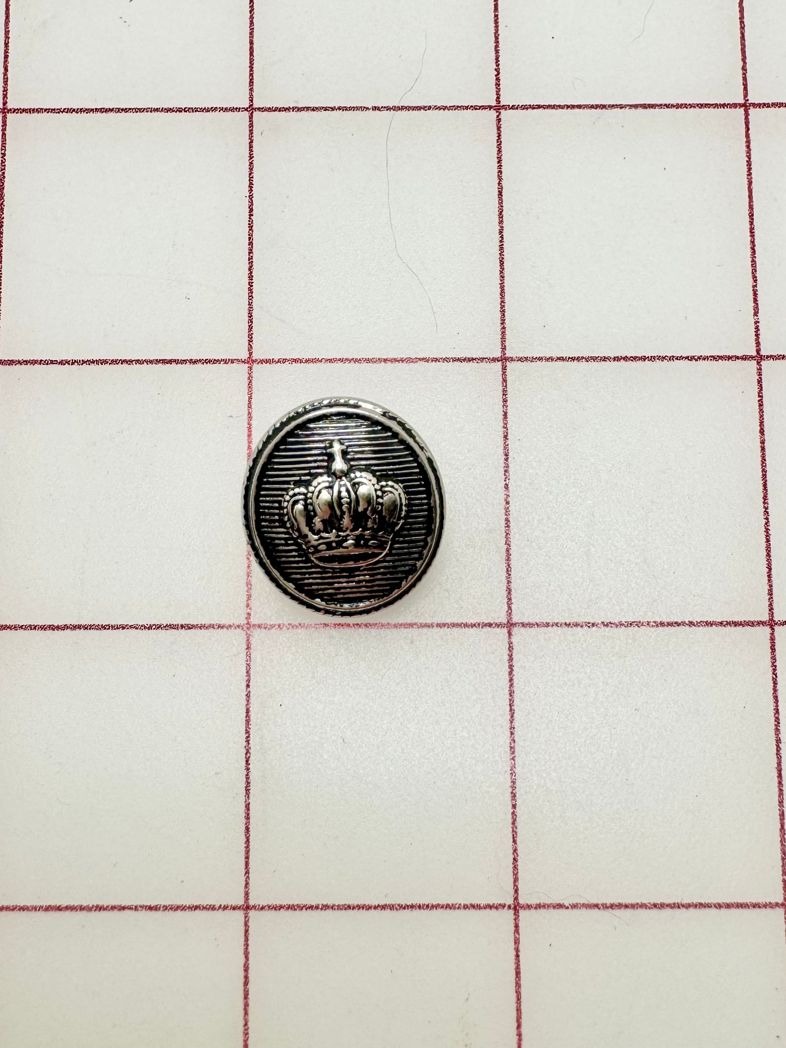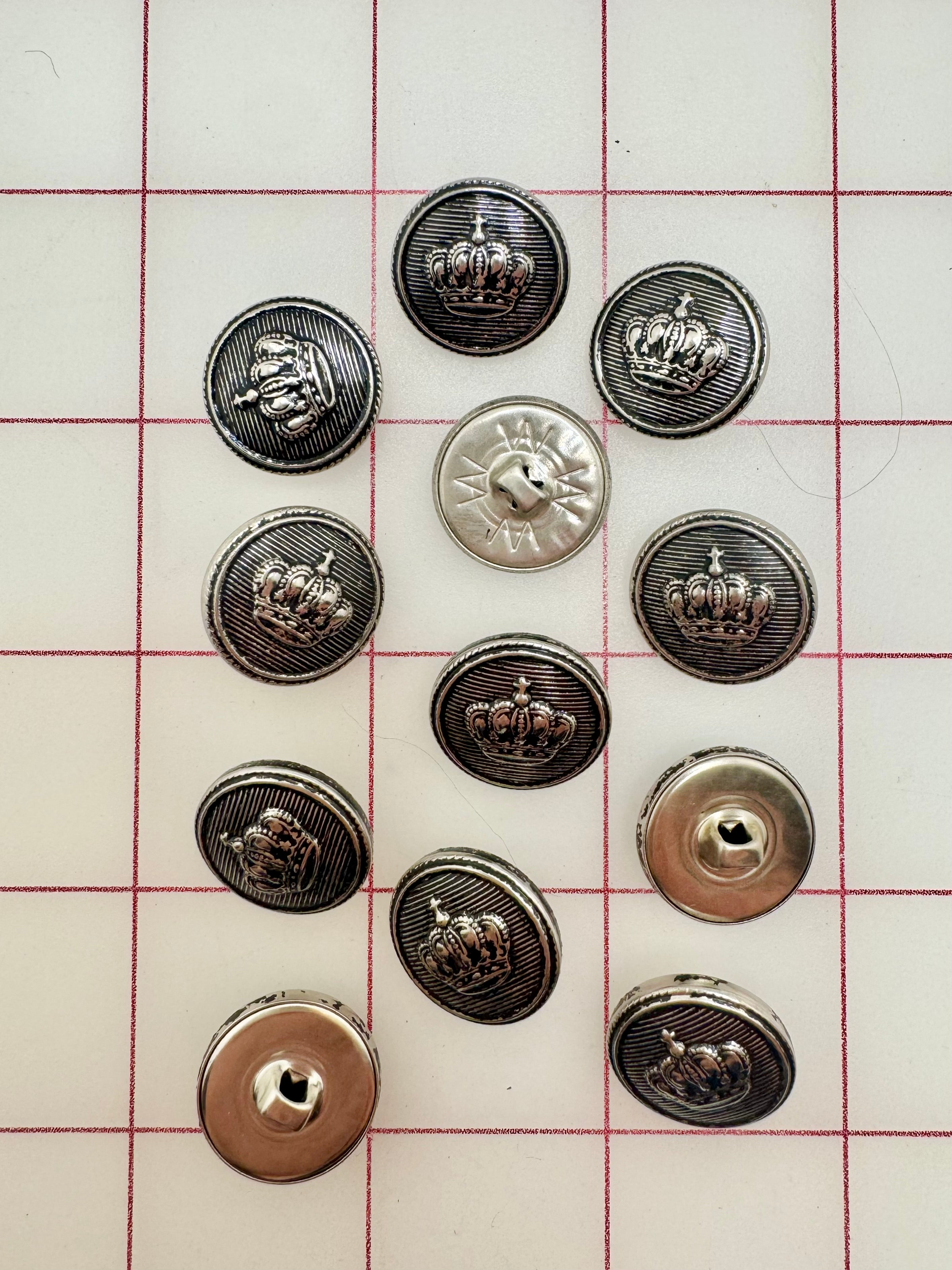 Priced per dozen. Top quality, crown-design, metallic-antique silver, buttons. Size 30L = 19mm, 3/4-inch.