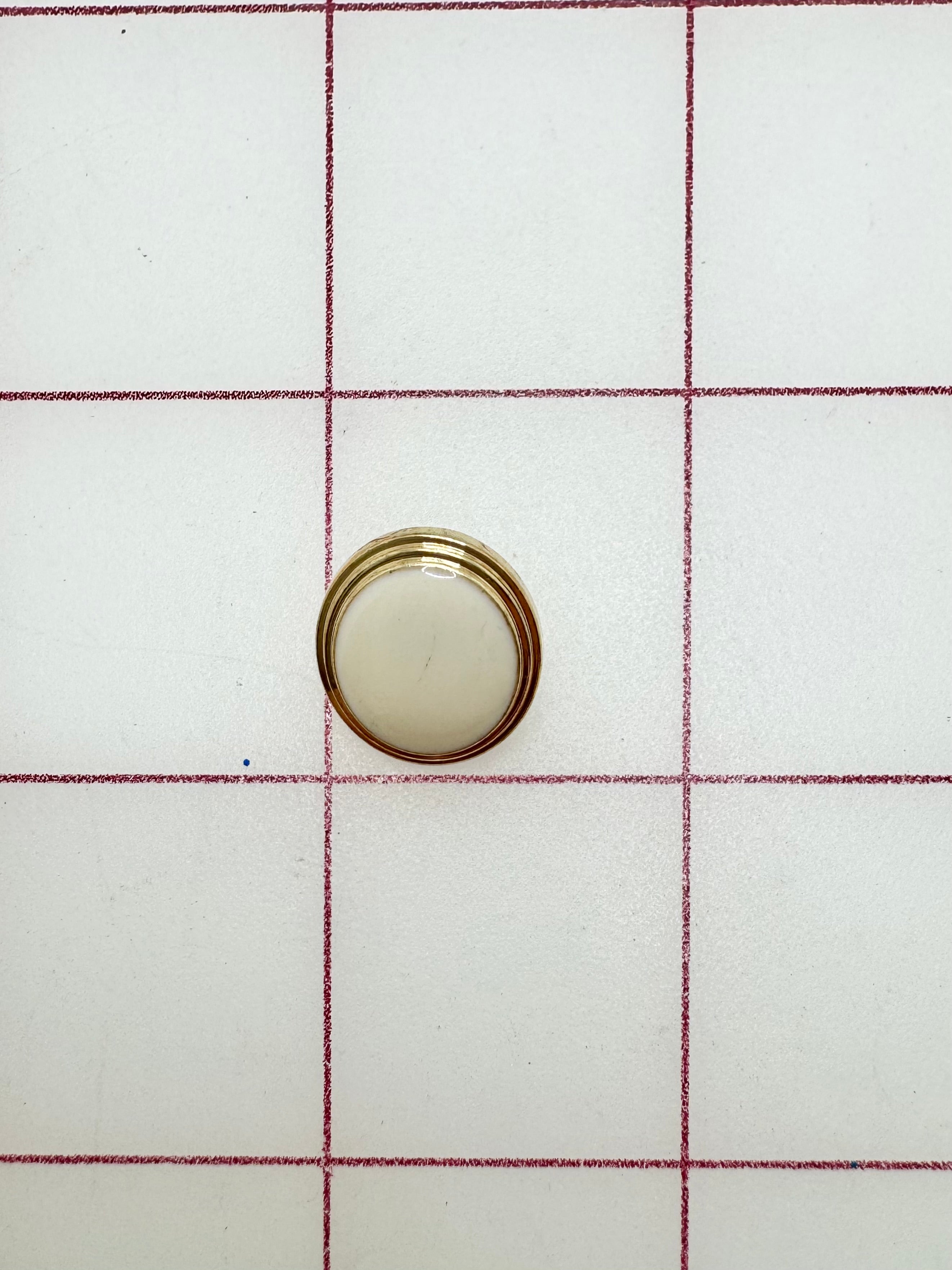 Priced per dozen. Metallic-gold, with cream centers buttons. Size 24L = 19mm, under 5/8-inch, 15mm.