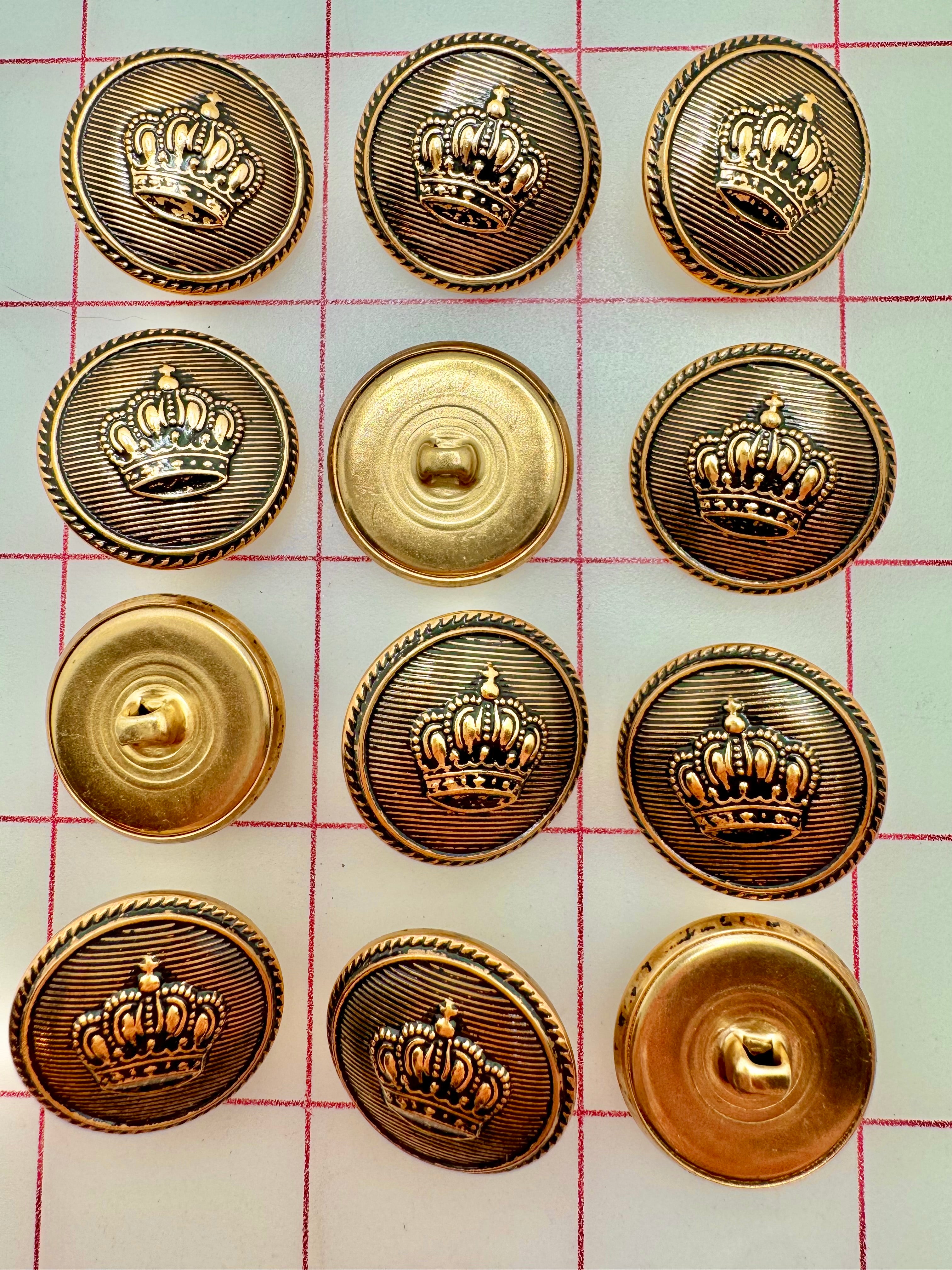 Priced per dozen. Top quality, metallic king's crown antique gold, imported Italian buttons. Size 36L = 23mm, approx. 7/8-inch.