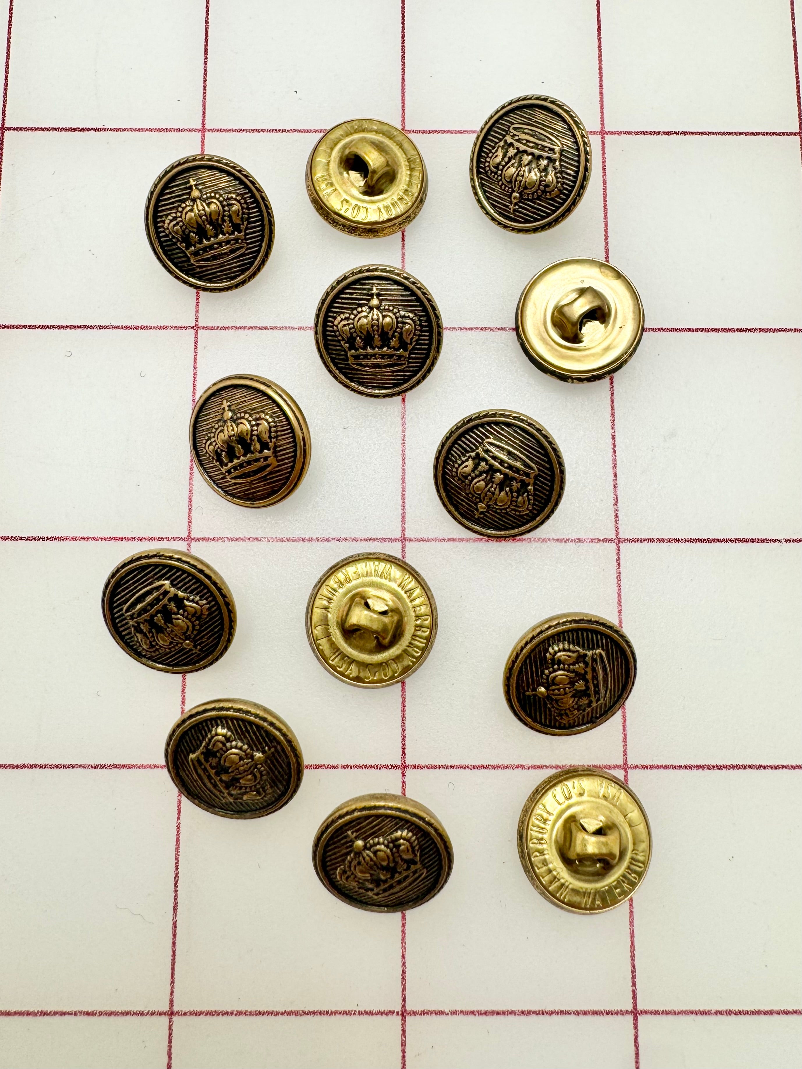 Priced per 13 pieces. Top quality, metallic king's crown antique gold, imported Italian buttons. Size 20L = 12.5mm, approx. 1/2-inch.