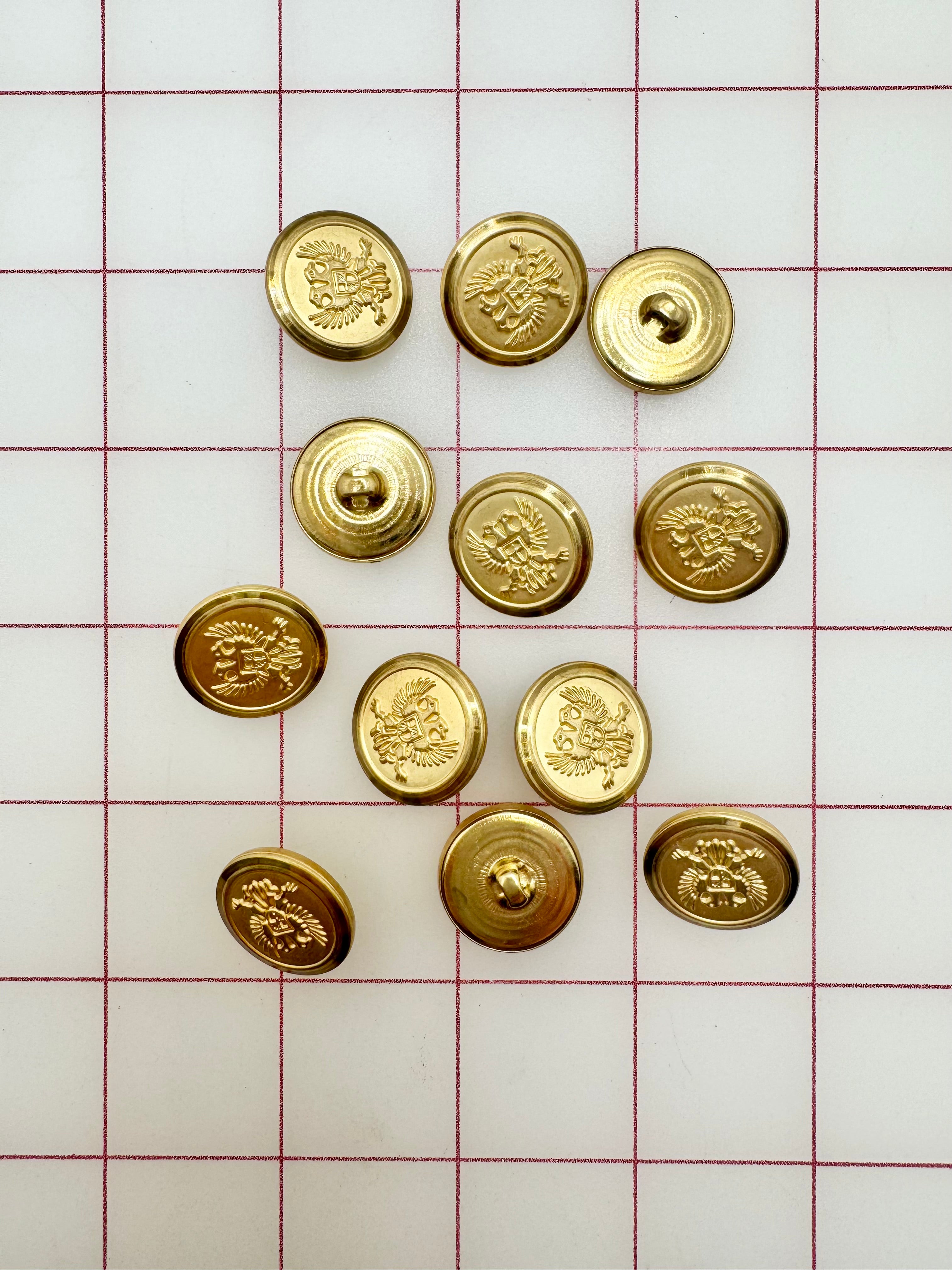 Priced per dozen. Top quality, double eagle crest-style, metallic-gold, imported Italian buttons. Size 30L = 19mm, 3/4-inch.