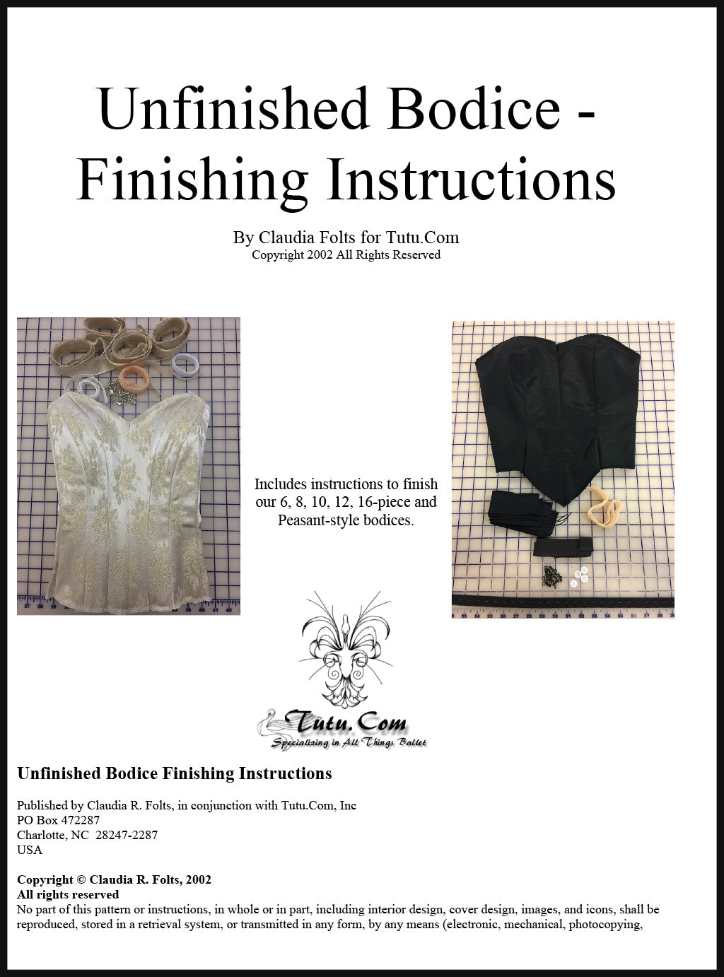 It contains size charts for all Tutu.com products; ballet tutus, bodices, dresses and patterns combined in one PDF file (14 pages).