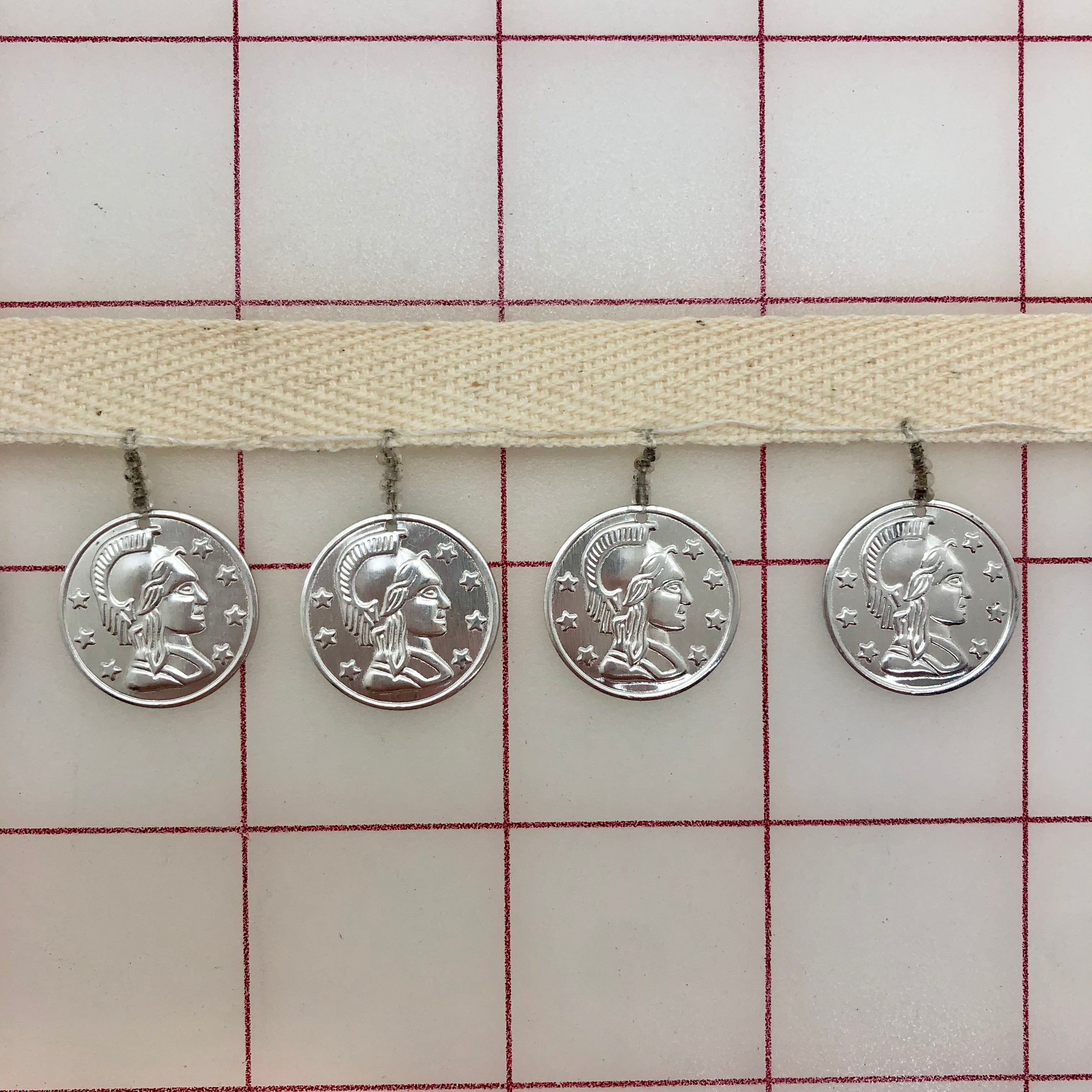 Priced per yard. Silver coins on half-inch wide ivory twill tape. Lightweight.
