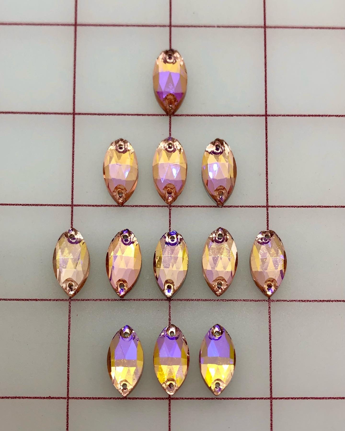 Priced per 6-pack.  9x18mm flat back Navette, or "cat's-eye"-shaped sew-on rhinestones. 20% discount per 12-pack (one dozen).  30% discount per 1/2 Gross (six dozen).