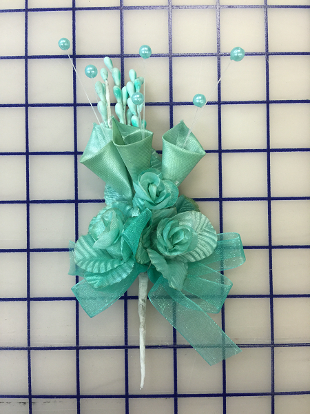 Priced per piece. Beautiful, aqua satin flowers with organza ribbon. Makes a beautiful side-of-the-bun headpiece!