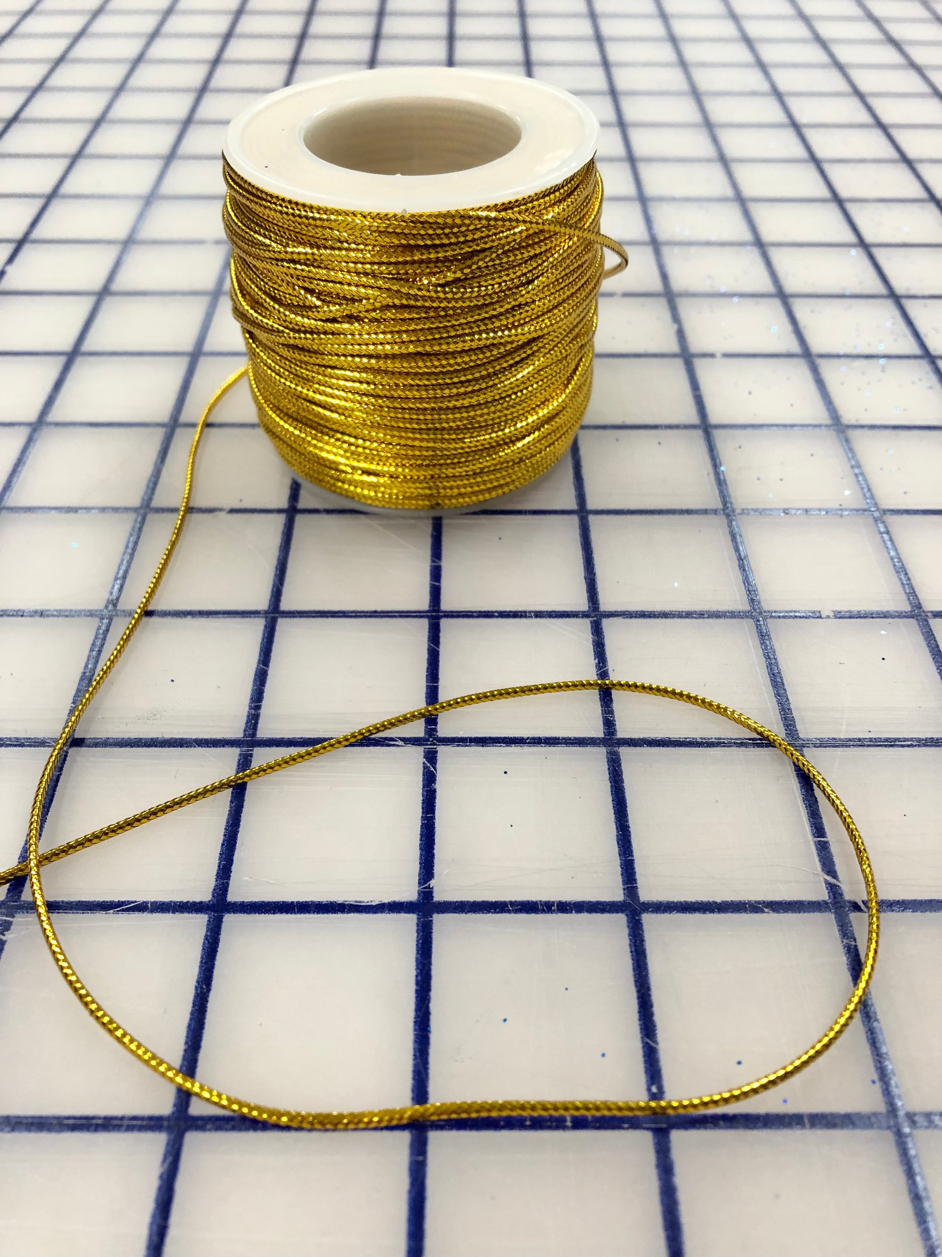 Priced per yard. Gold. Non-stretch, 2mm, approximately 1/16-inch, metallic cording.