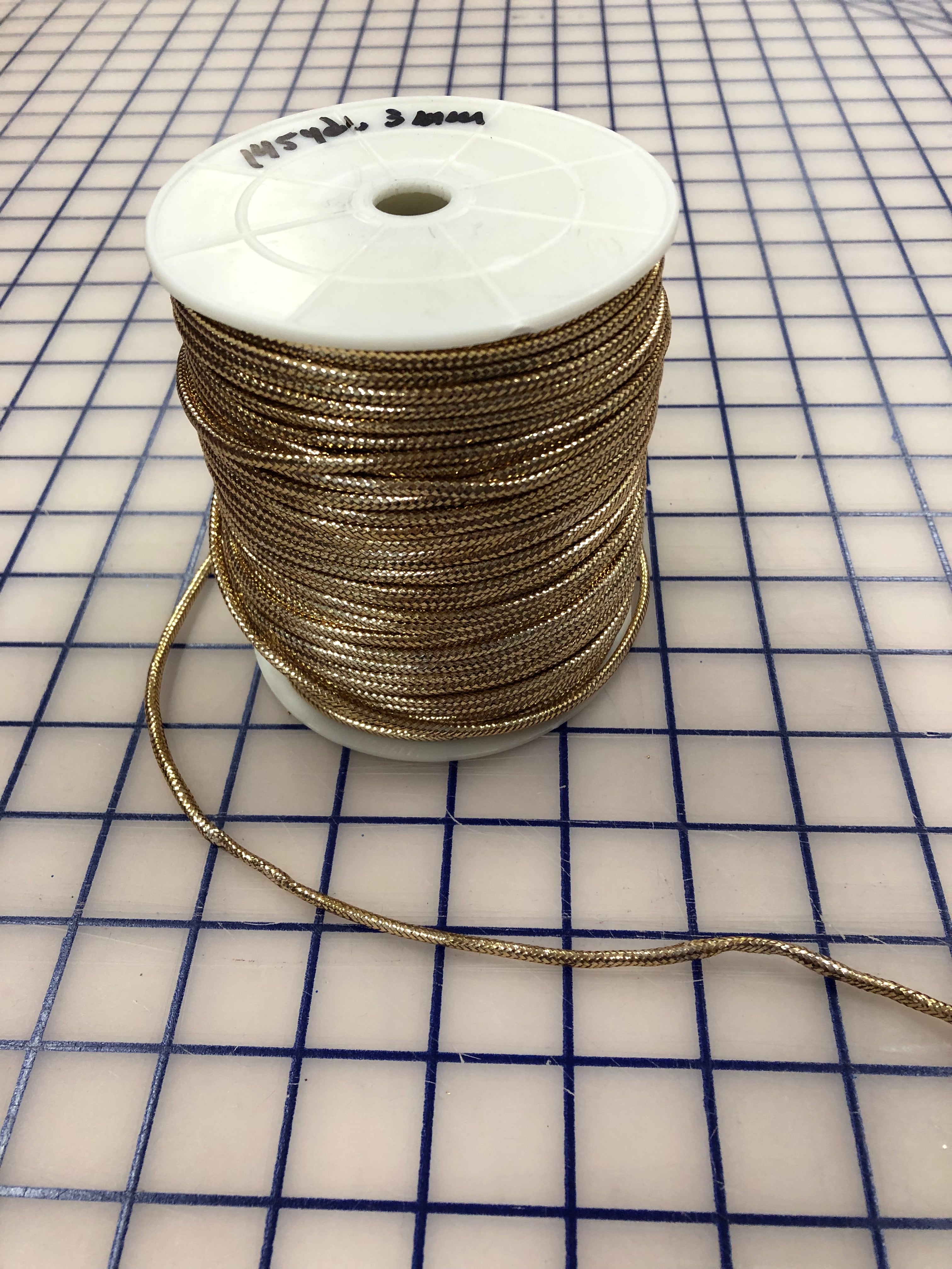 Priced per yard. Gold. Non-stretch, 3mm, approximately 1/8-inch, metallic cording. 40% discount on 145-yard roll. Economical!