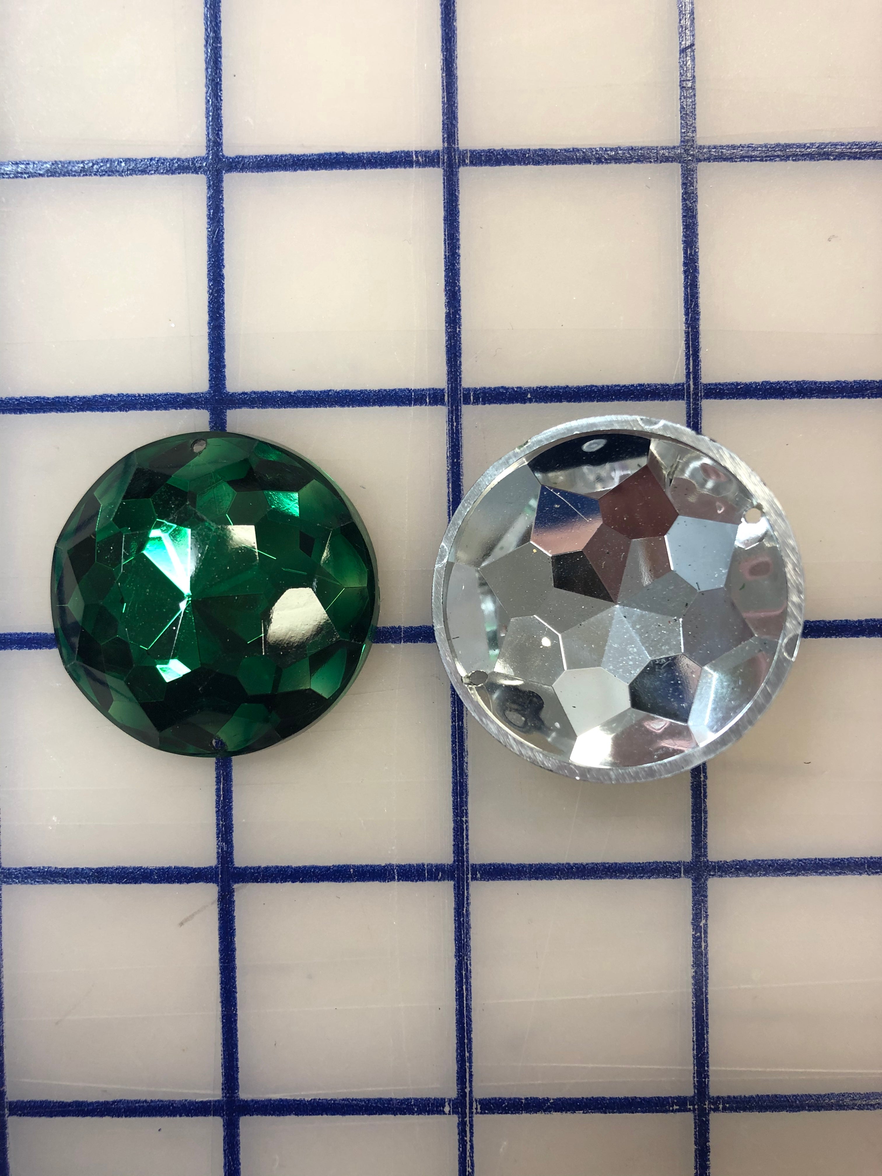 1.5-inch Large Emerald Round hollow-back Sew-On gems. Very lightweight. Perfect for embellishing headpieces and tutu plates and bodices. Picture shows both front and back inside of gem. 3-Pack.