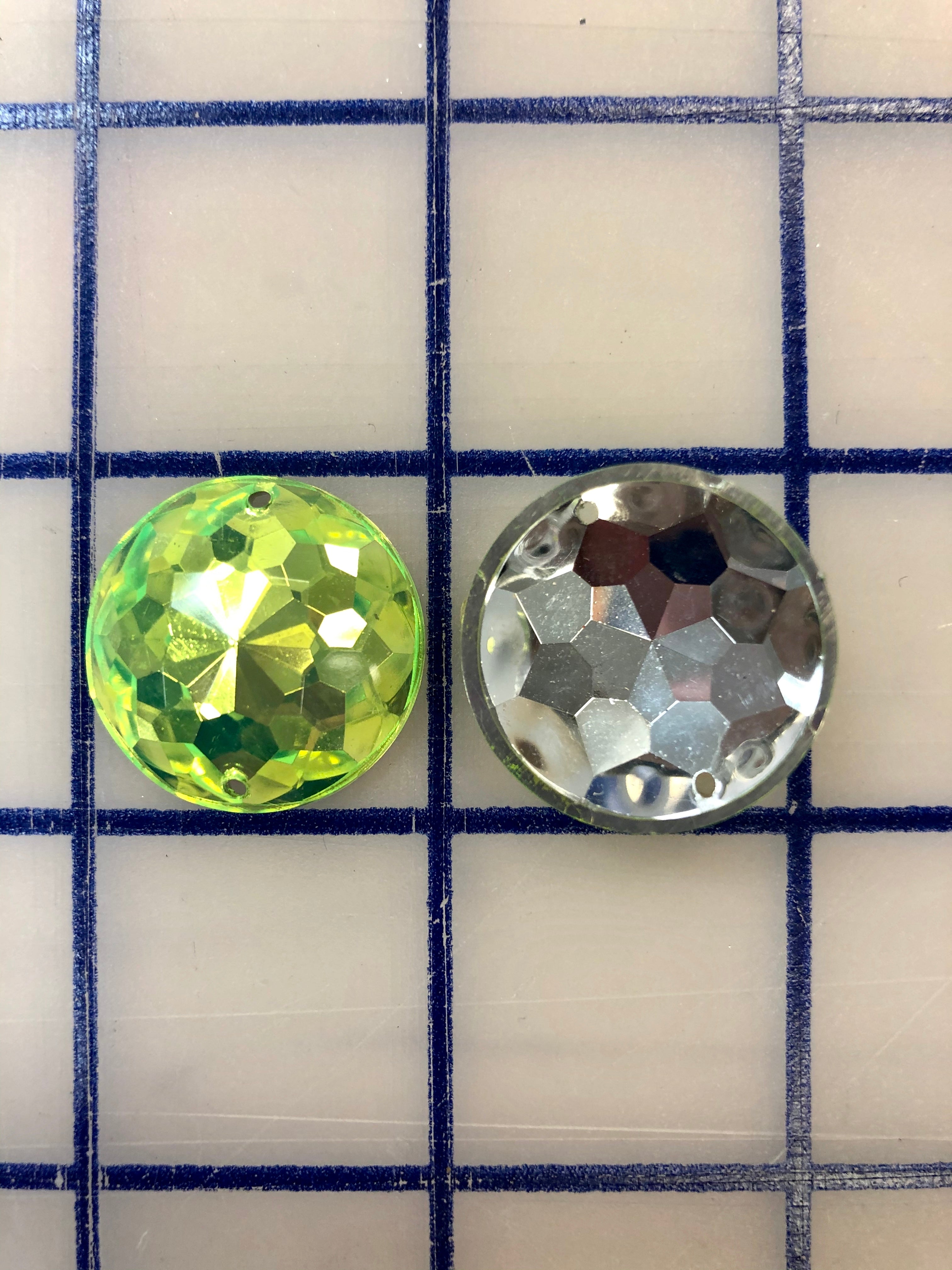 1-inch Small Peridot Round hollow-back Sew-On gems. Very lightweight. Perfect for embellishing headpieces and tutu plates and bodices. Picture shows both front and back inside of gem. 3-Pack.