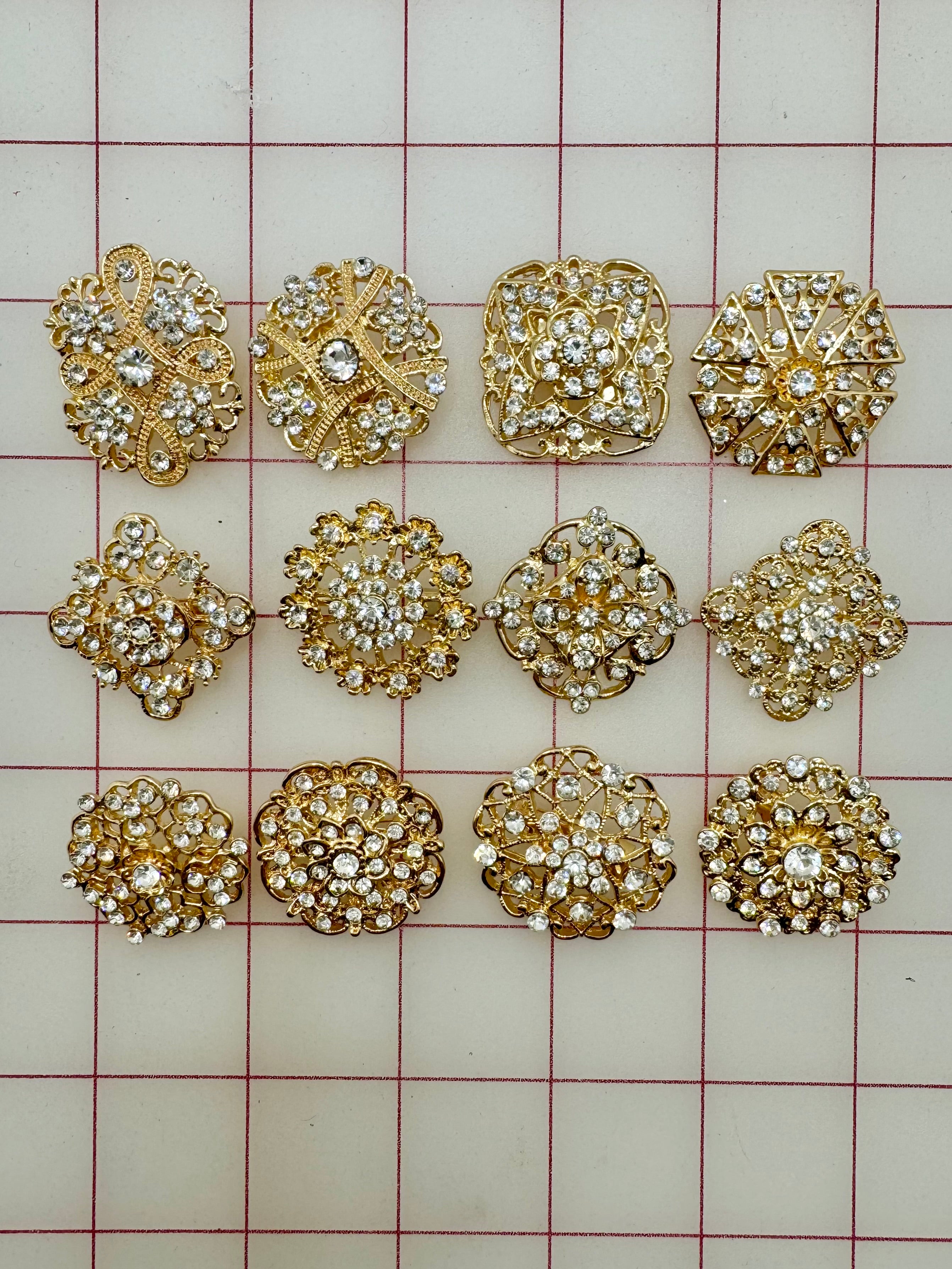 Priced per piece.  Beautiful, gold and crystal rhinestone brooches. Very lightweight. Twelve different designs.