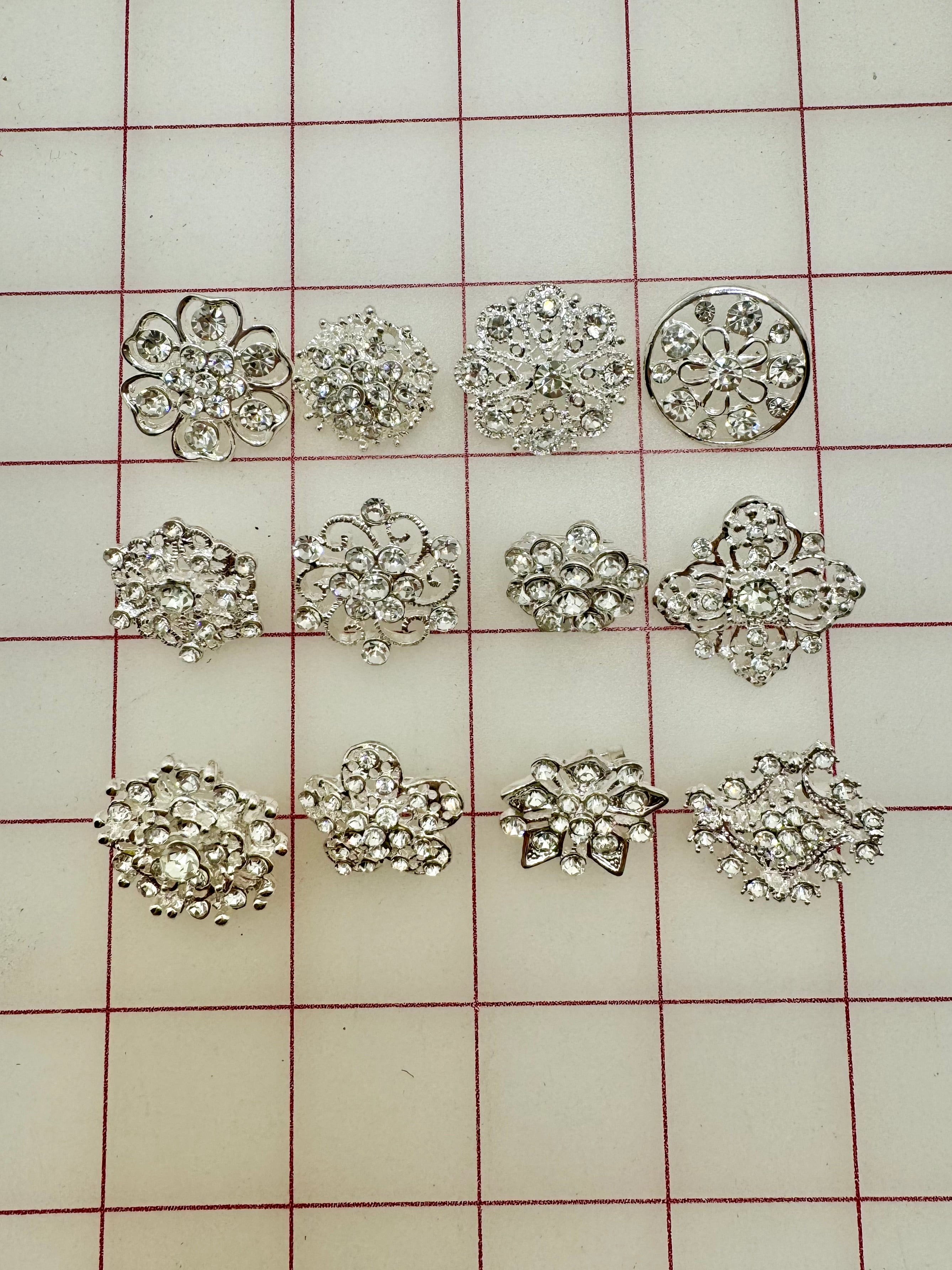 Priced per piece. Beautiful, silver and crystal rhinestone brooches. Very lightweight. Twelve different designs.