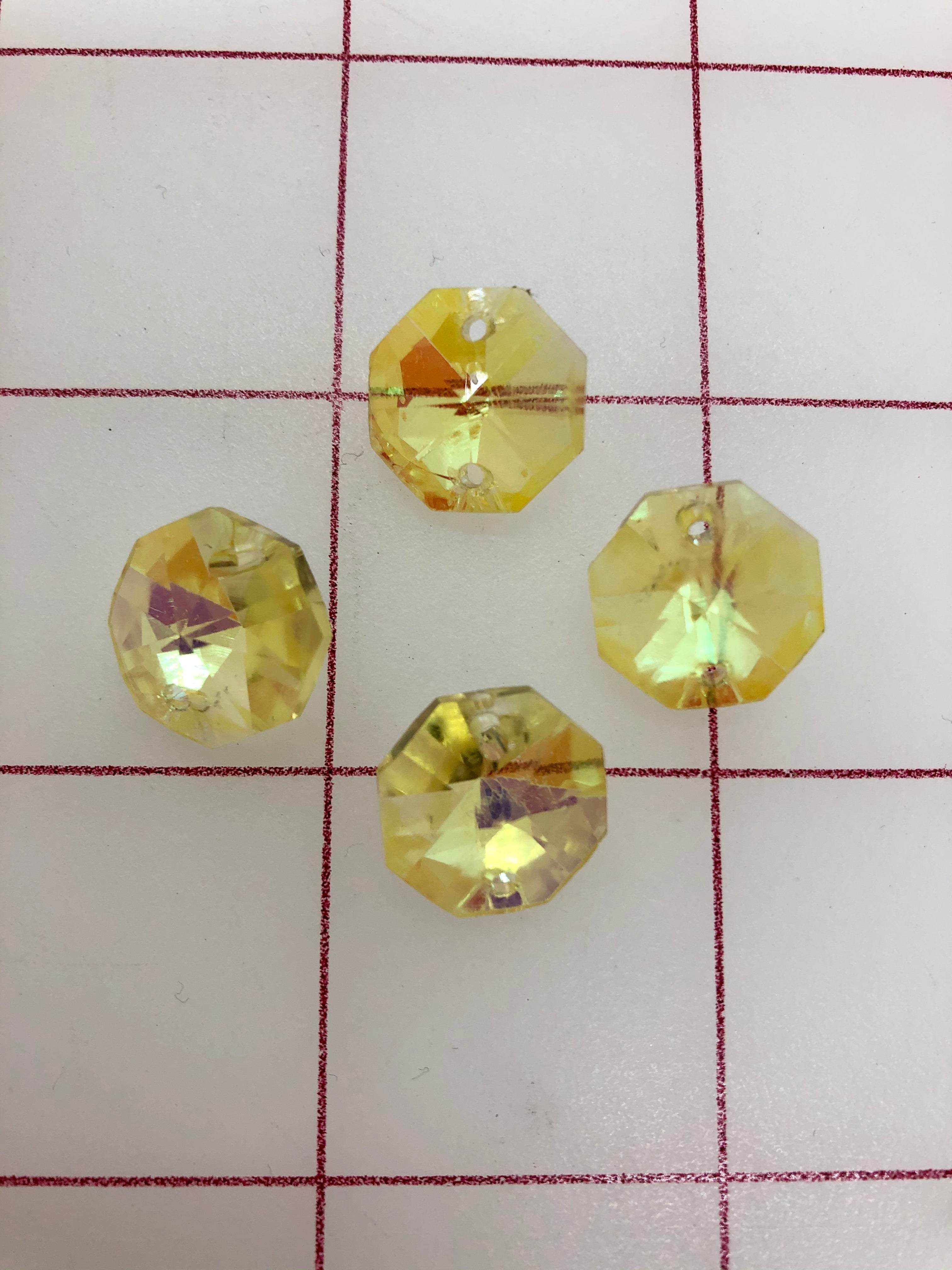 Priced per 4-pack. Yellow AB acrylic hexagonal sew-ons. Very lightweight. Perfect for embellishing headpieces and tutu plates and bodices. Close-Out.
