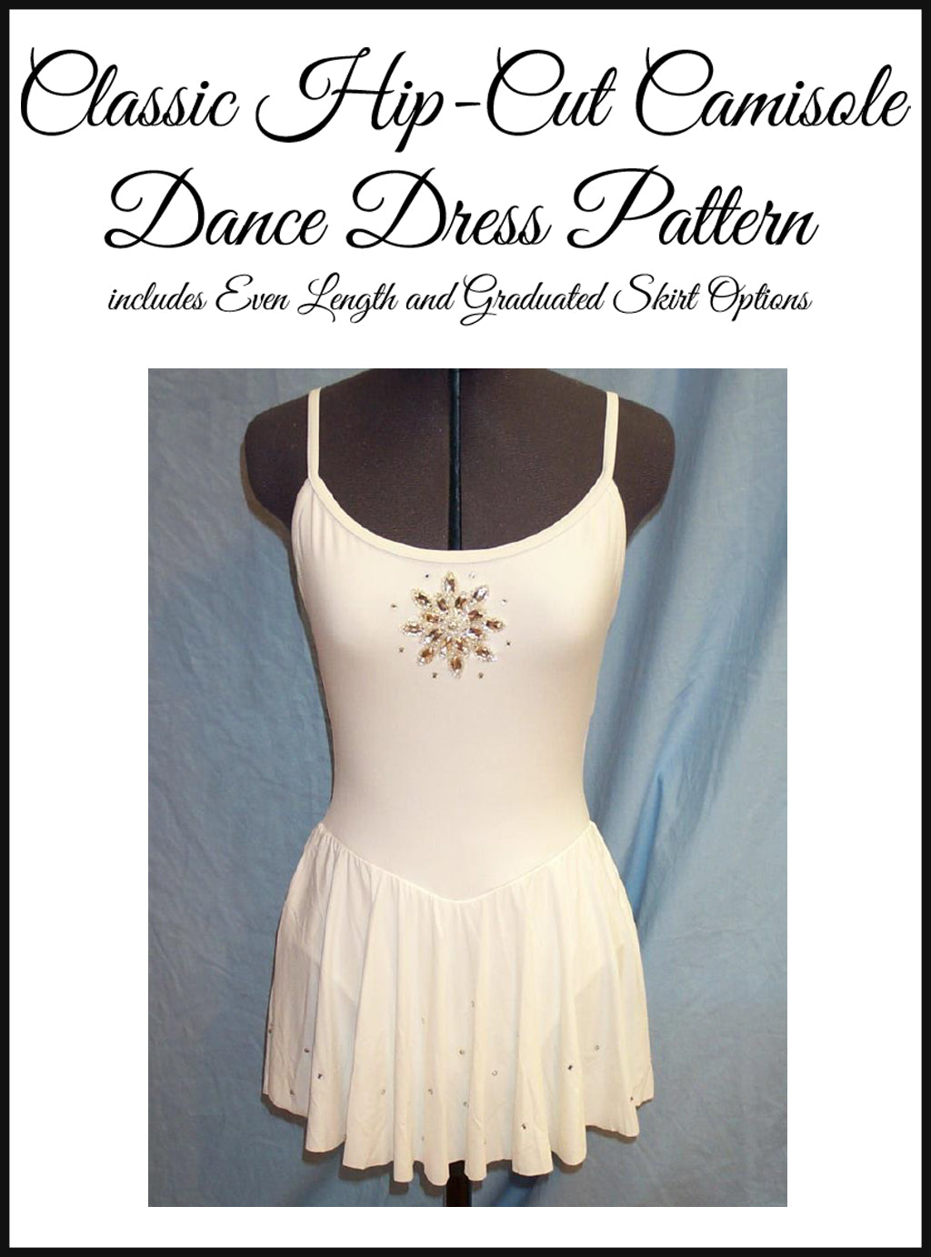 This leotard dress is perfect for spandex, with chiffon, glissenet, stretch mesh or double georgette for the skirt. The medium-low, softly rounded back accentuates the dancer's beautiful upper-back and shoulders. The hip-cut skirt drapes perfectly for a very flattering line. The pattern features two skirt designs: cut short and even (as shown), or graduated to two inches longer in the back (cascade). Multi-size. Instructions included.