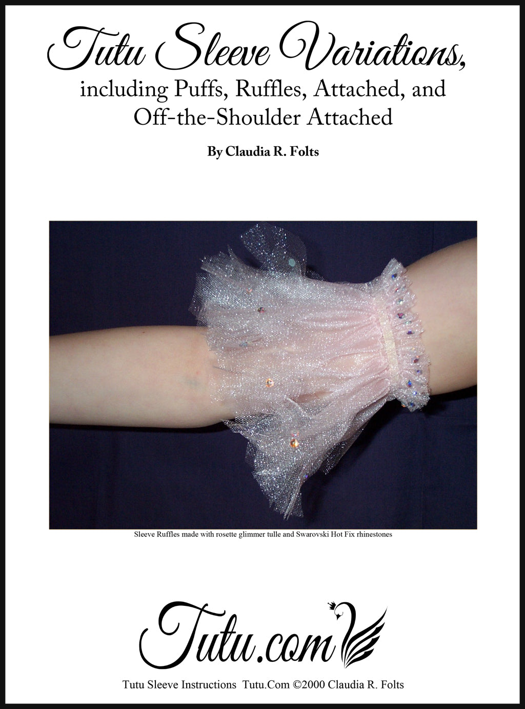 Set of four, different tutu sleeve patterns by Claudia Folts, to be made with tulle and/or chiffon. Sleeve puffs, sleeve ruffles, and both short and long sleeves attached to an elastic strap on the bodice. Instructions included.