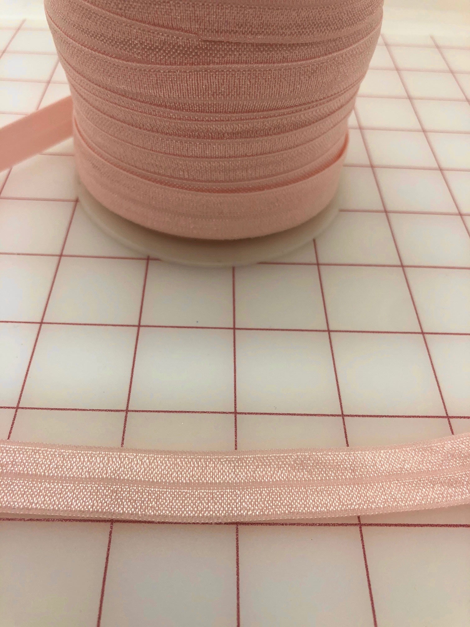 Priced per yard. Fold-over elastic is a great finish for the edges of leotards and other stretch costumes. Also great for masks. European Pink, 5/8-inch wide. 20% discount on 50-yard rolls.