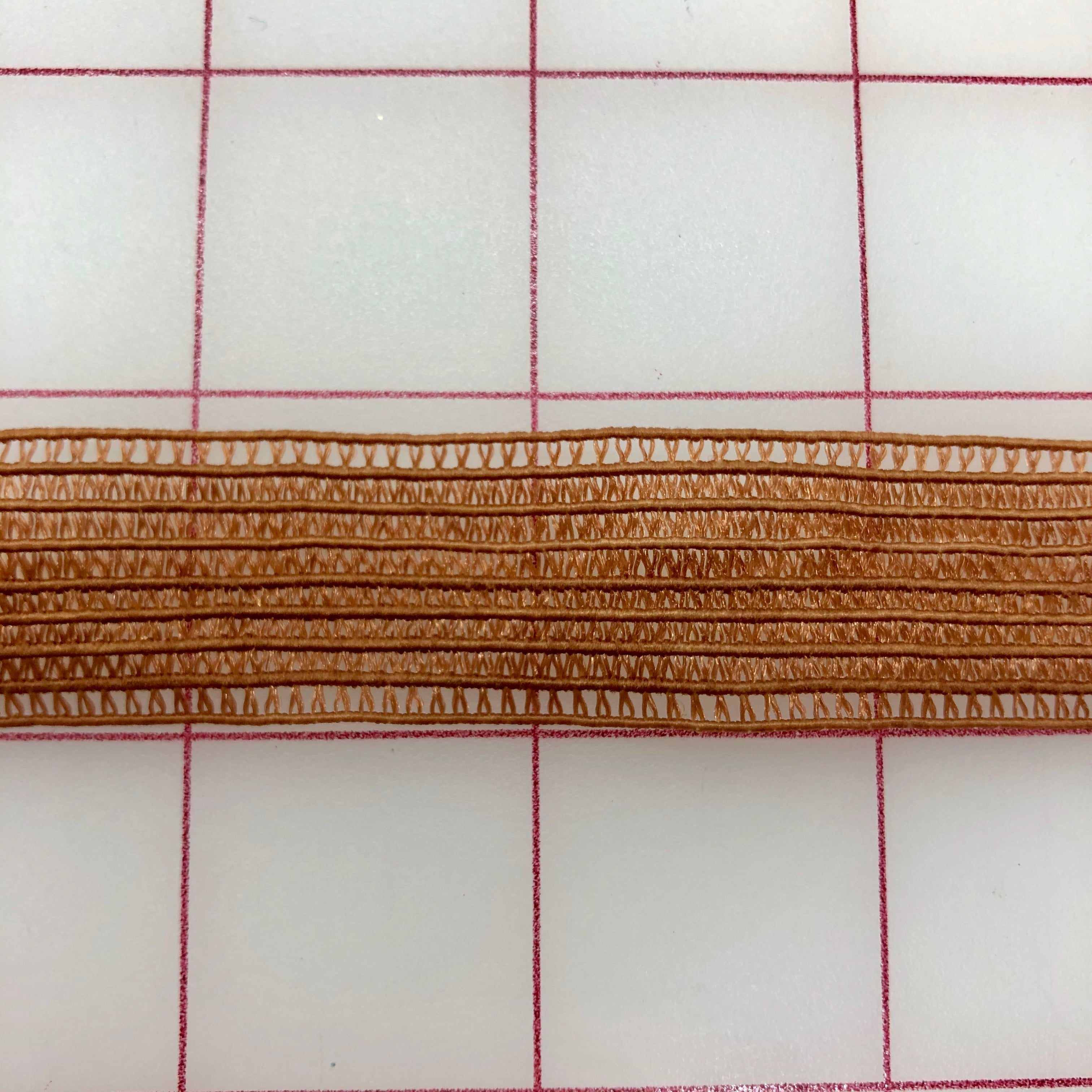 Priced per yard. Caramel invisible mesh elastic. 7/8-inch wide. Perfect for bodice shoulder straps for warm, brown skintones. Lighting shines through the small holes in the mesh and helps the elastic to blend with various warm brown skintones.