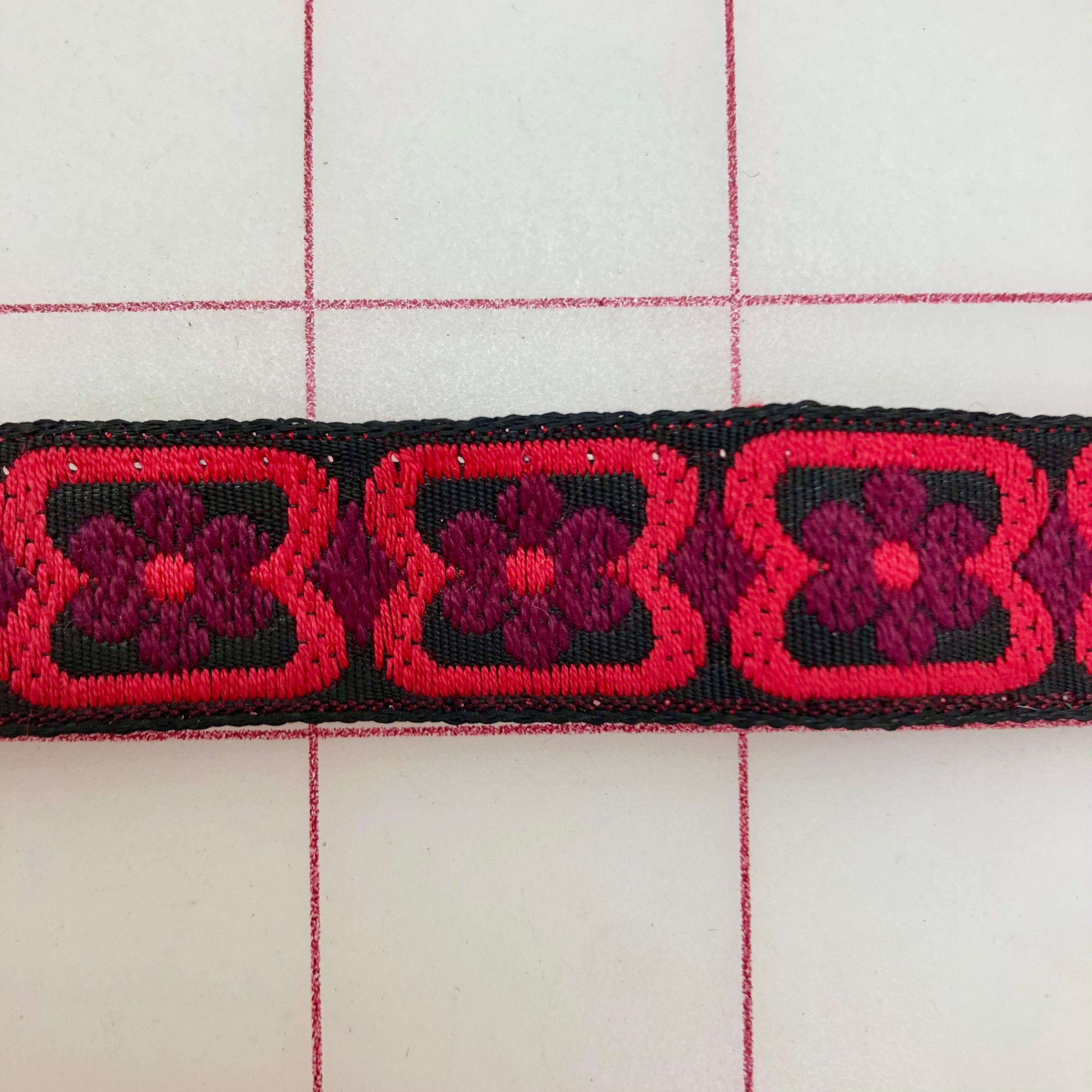Priced per 4.5-yard piece and 3.33-yard piece. Black and red embroidered ribbon trim. 5/8-inch wide. Close-Out. Cannot be re-ordered.