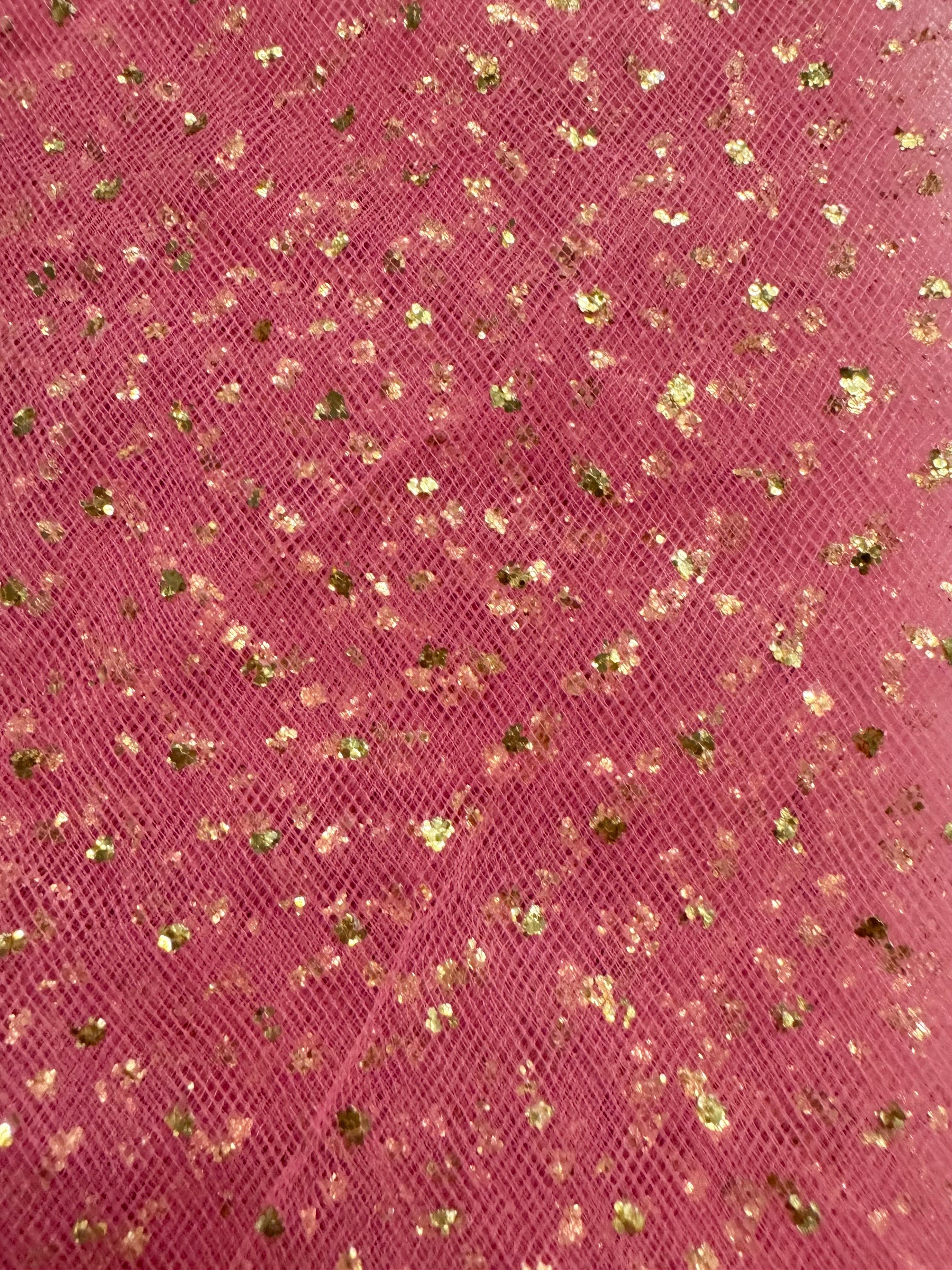Priced per yard. American Beauty/Gold, enhanced sparkle tulle. 54-inches wide.