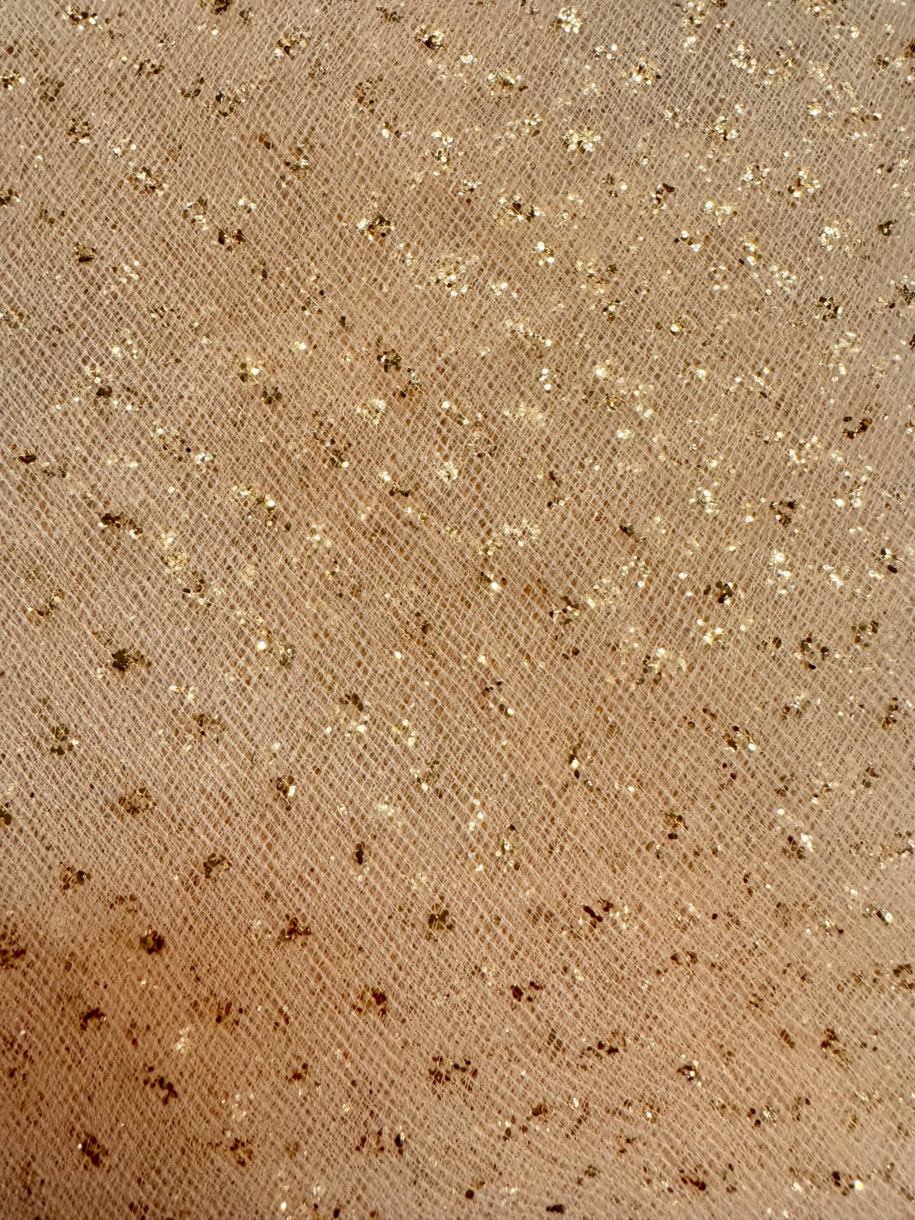 Priced per yard. Melon/Gold, enhanced sparkle tulle. 54-inches wide.