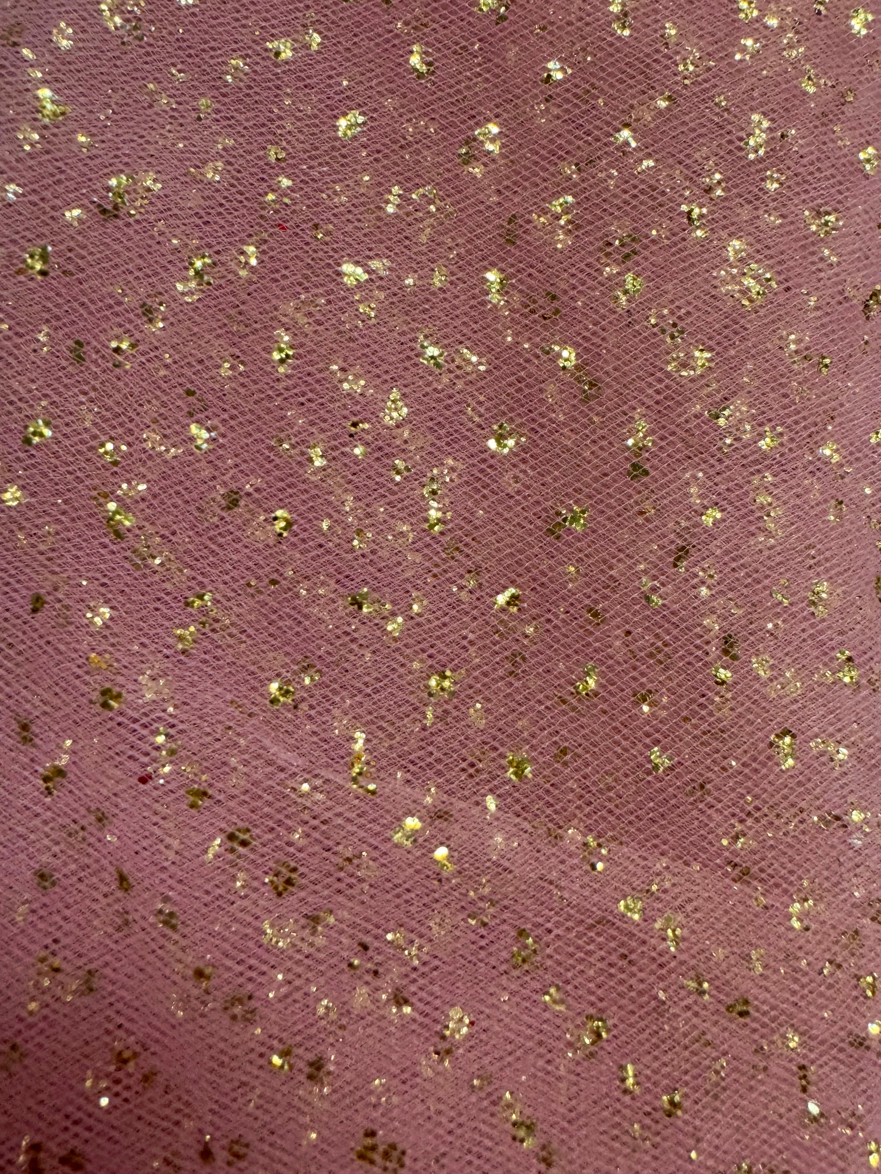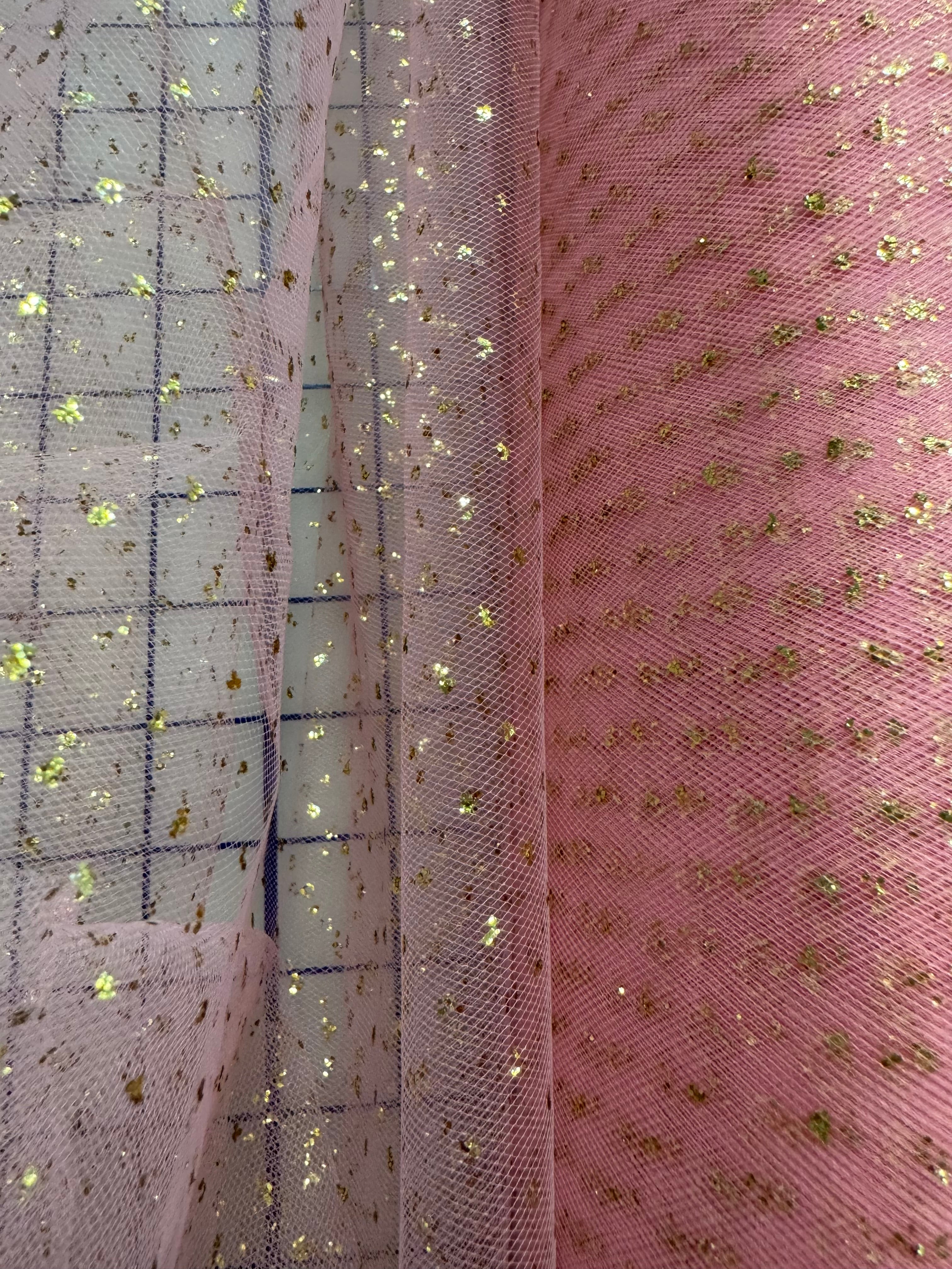Priced per yard. Paris Pink/Gold, enhanced sparkle tulle. 45-inches wide.