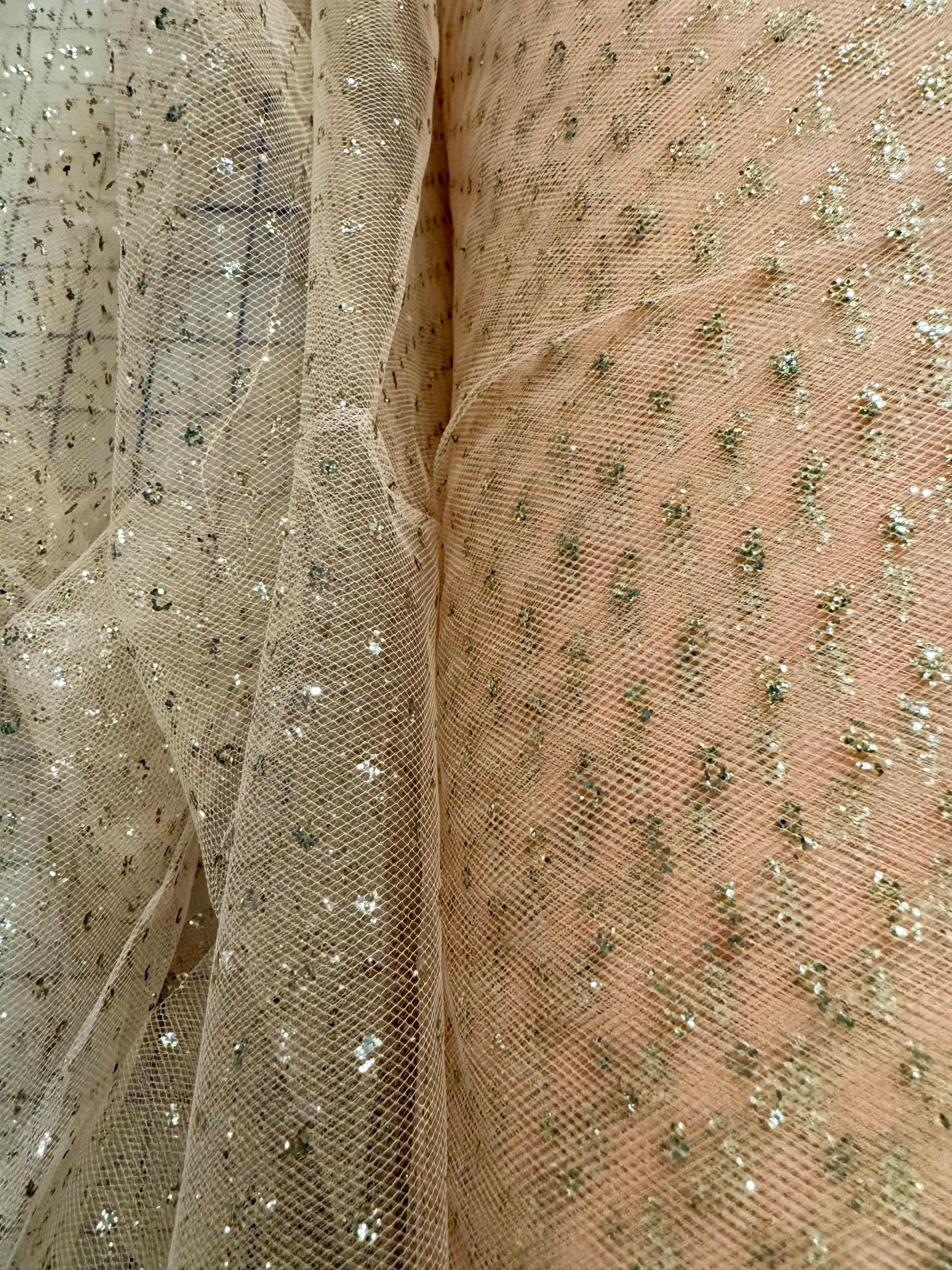 Priced per yard. Peach/Silver, enhanced sparkle tulle. 54-inches wide.