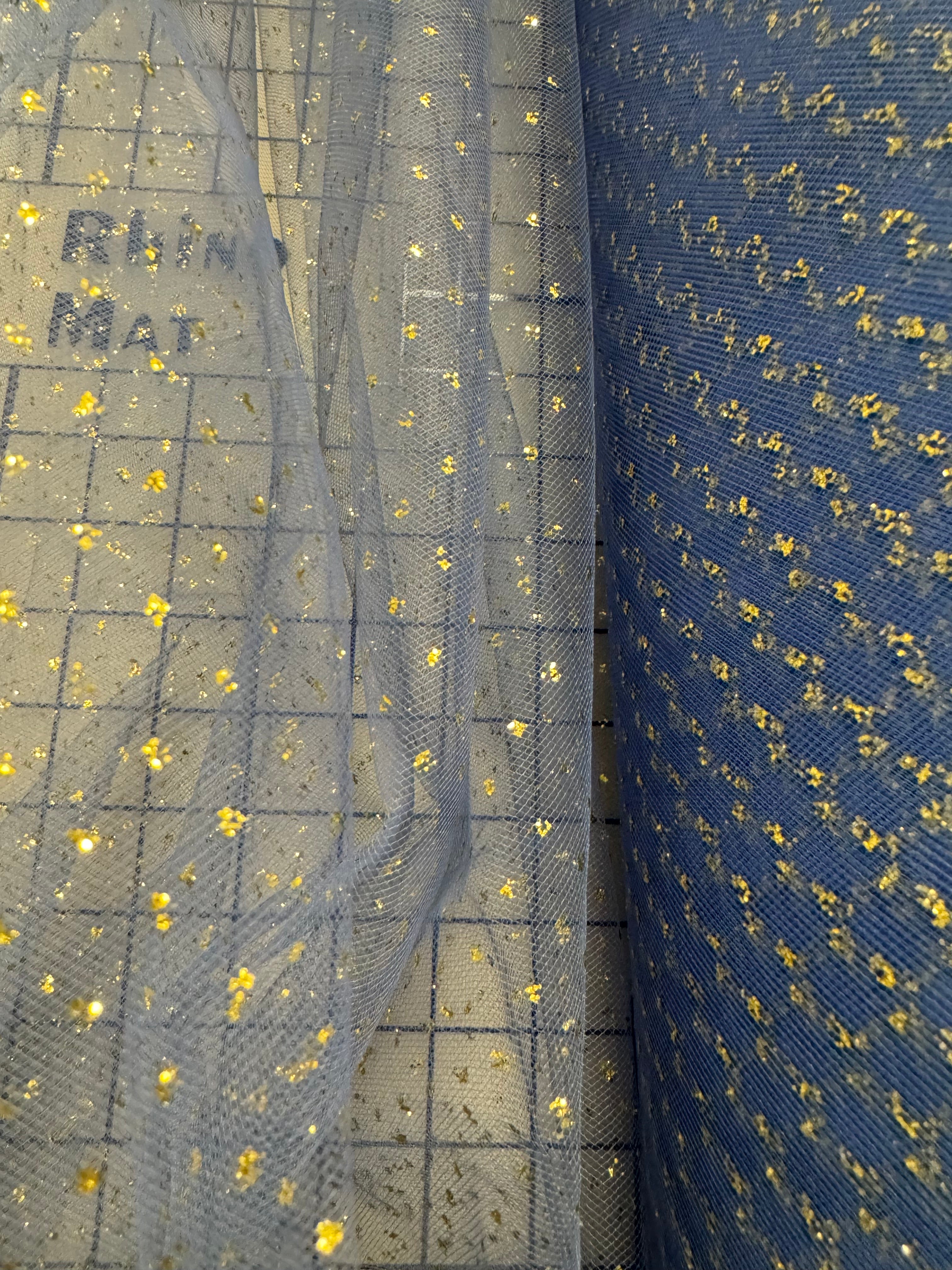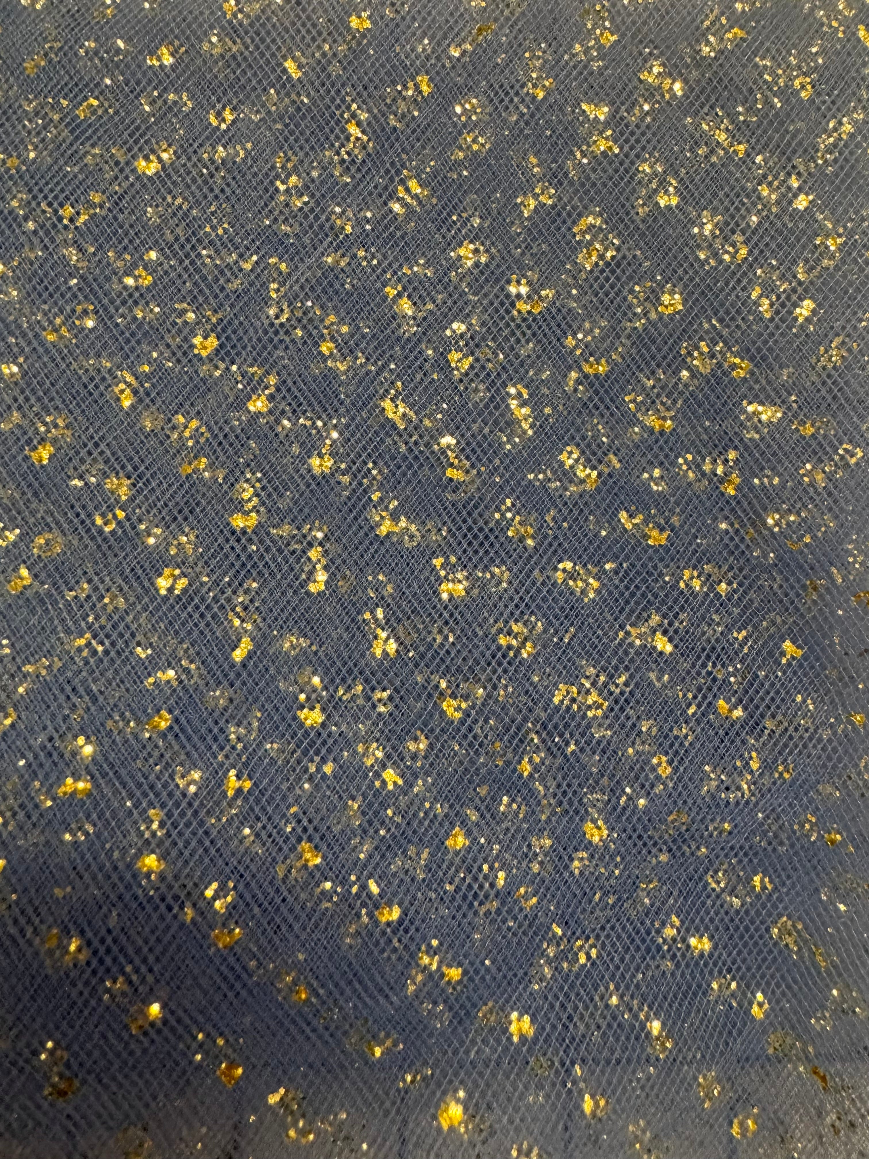 Priced per yard. Periwinkle/Gold, enhanced sparkle tulle. 54-inches wide.
