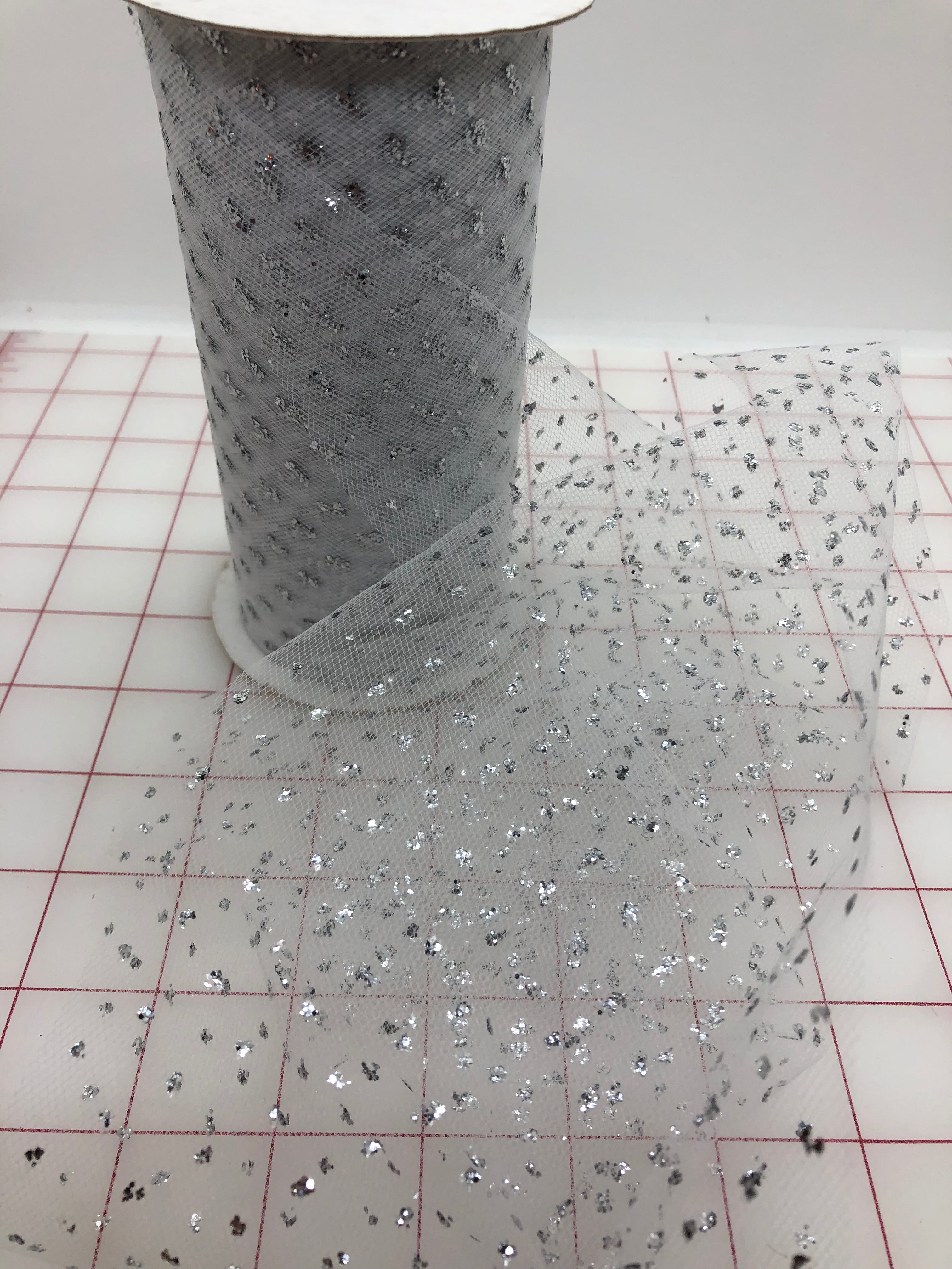 Priced per yard. White/Silver, enhanced sparkle tulle. 6-inches wide. This color mixes well with all the pink, peach, yellow, silver/grey, and gold tulles and nets. It also looks great with white and ivory nets and tulles.