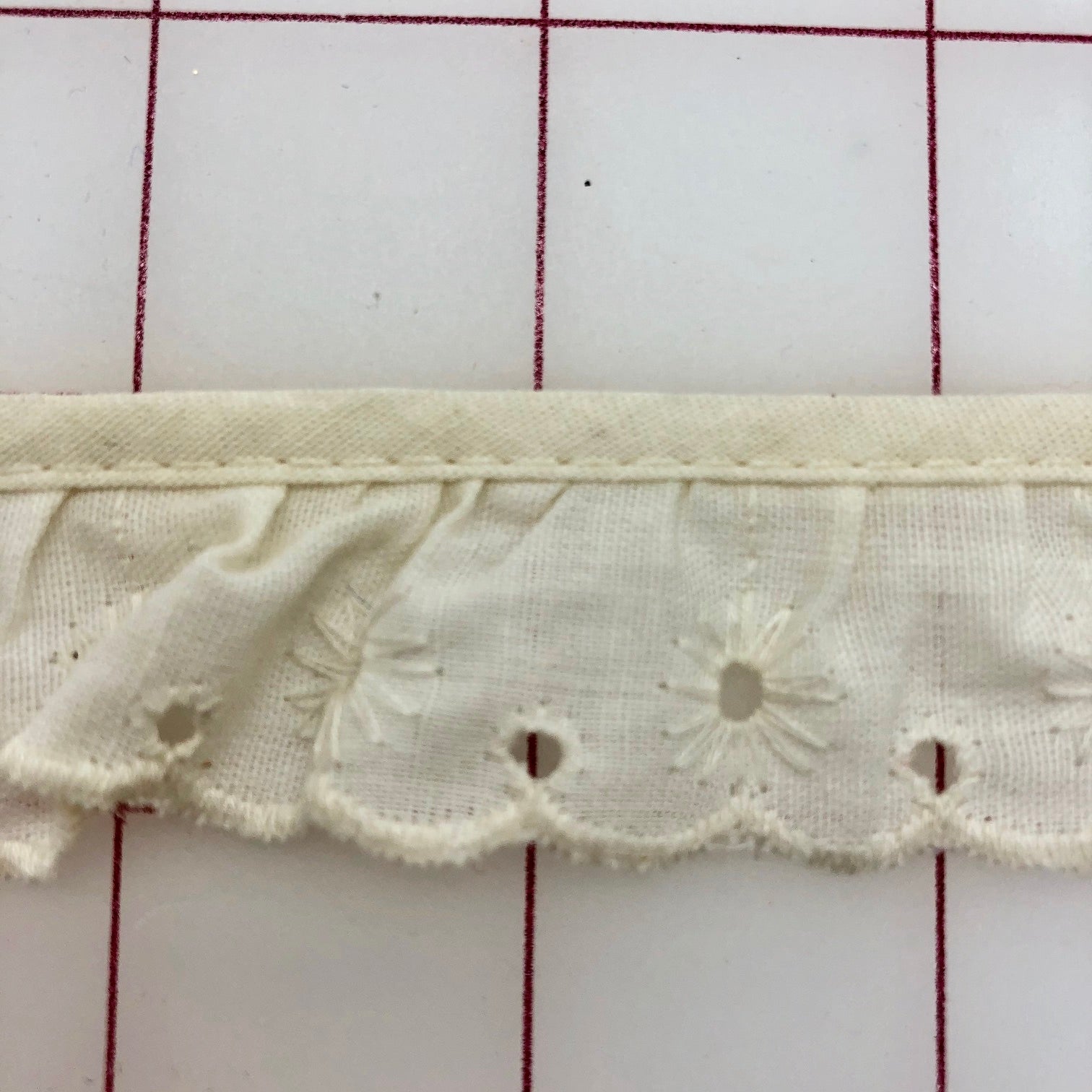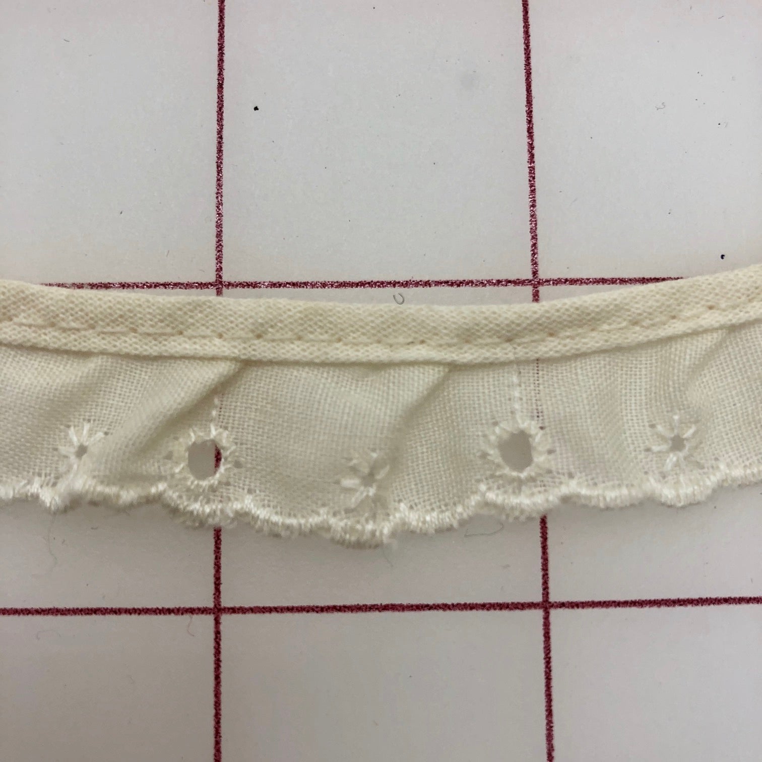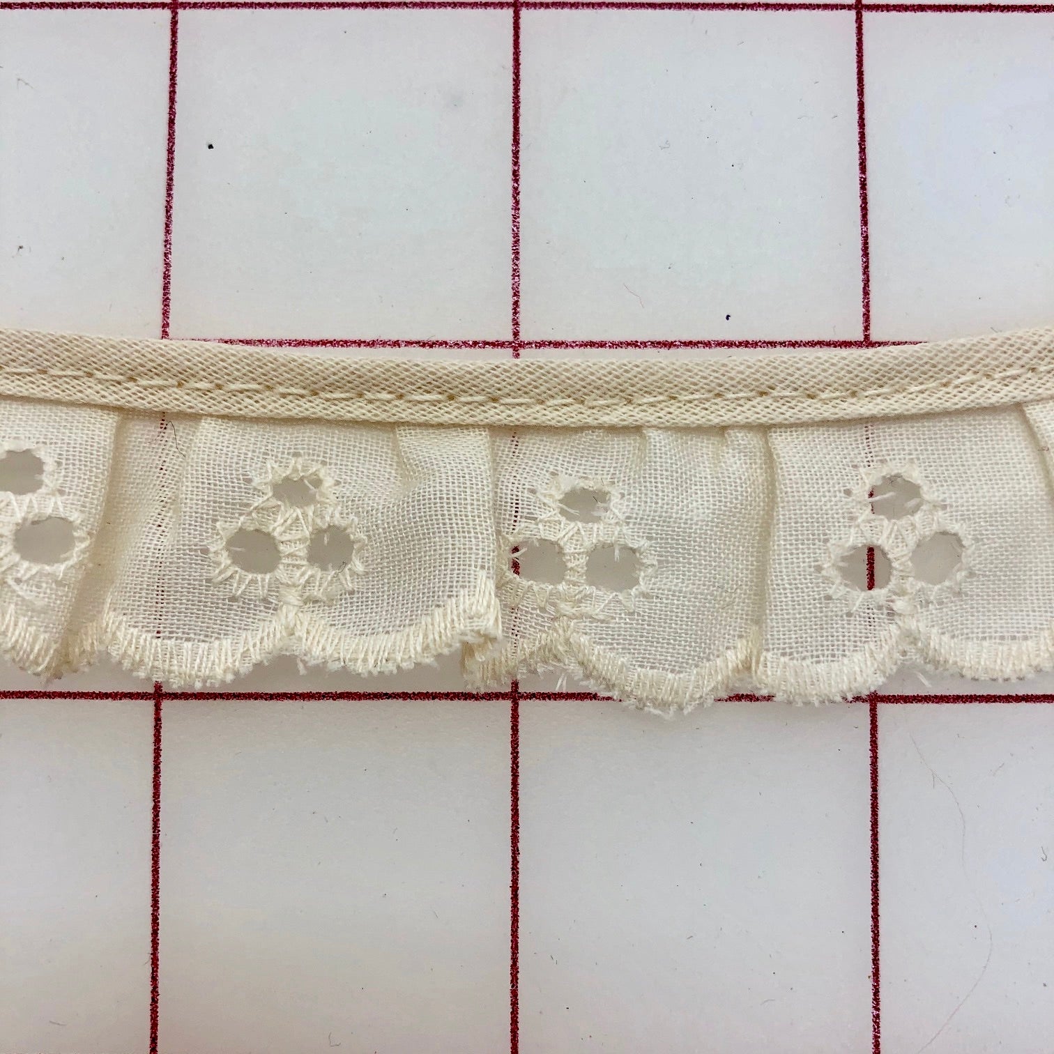 Priced per pack. Beautiful, delicate, eyelet trims. Four pieces - from a one-yard piece, to two 1.75-yard pieces, and one 2.875-yard piece fora total of 7.375 yards. Perfect for embellshing girls' pantaloons for the Nutcracker, and other ballet costumes. Cannot be re-ordered.