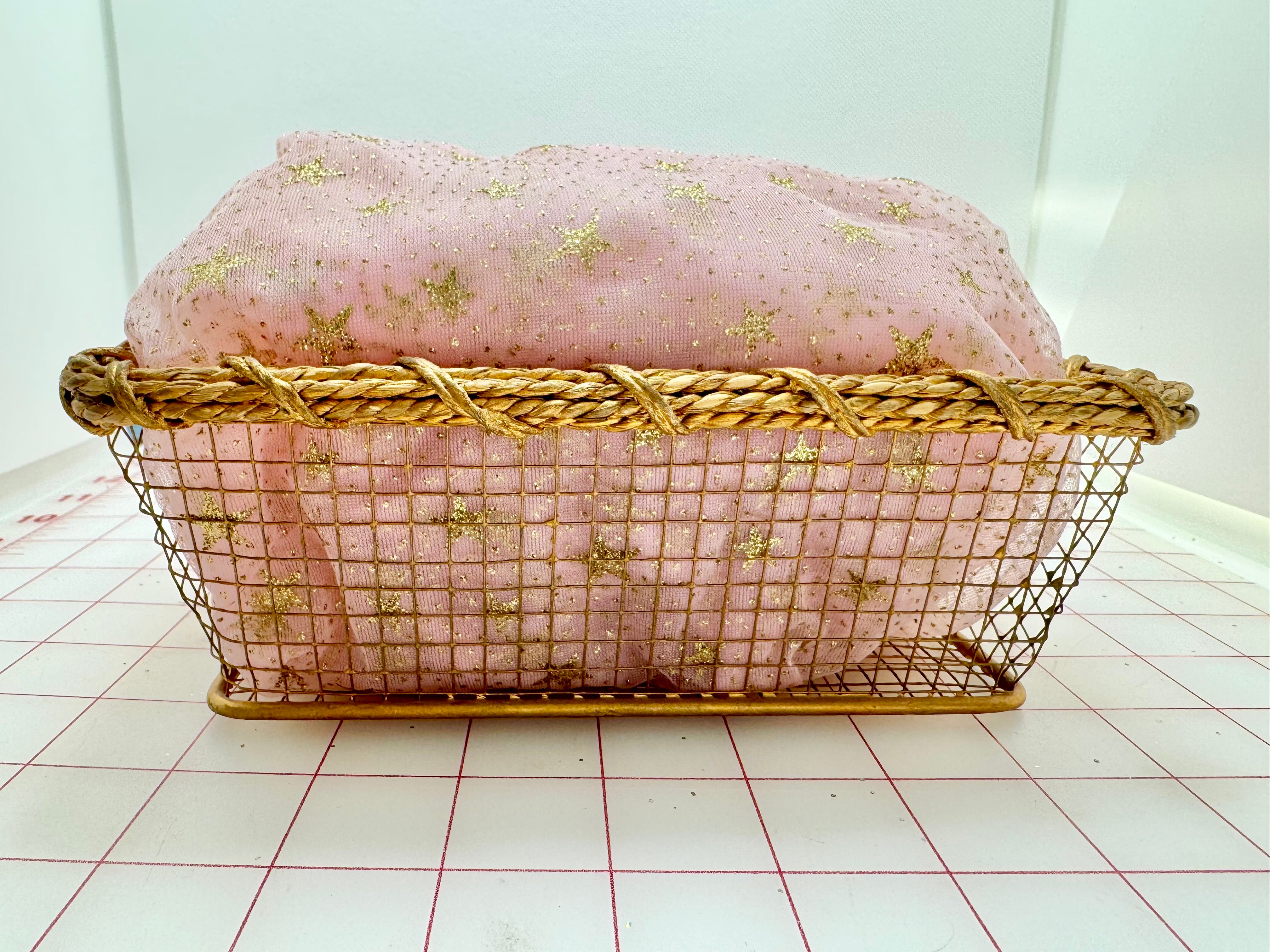 Basket comes with some pale pink organza with metallic gold stars (see picture). Tiara not included, but available. Search Sku# 730-0000-062002. For other tiaras, search "Manufactured Tiaras."