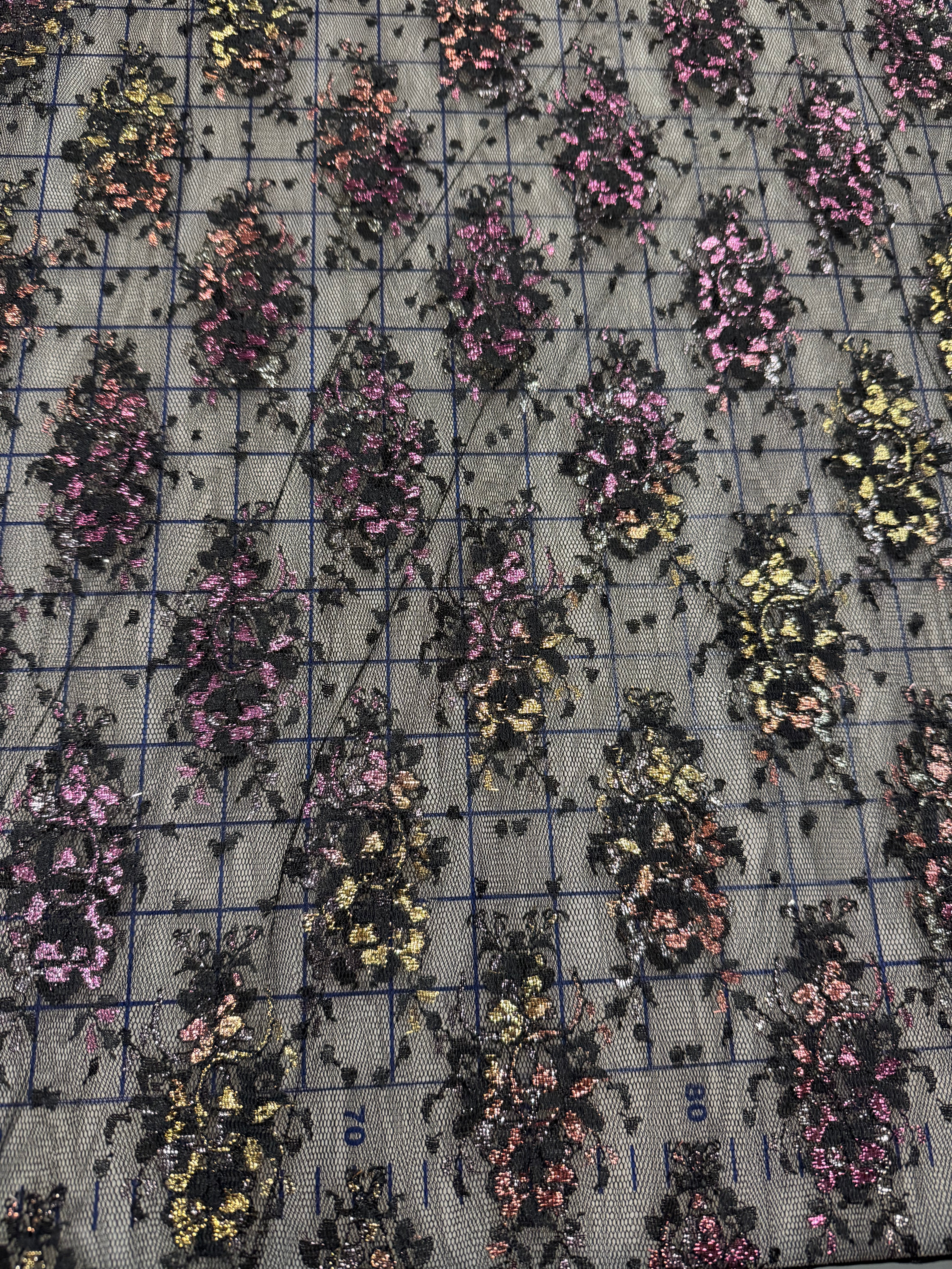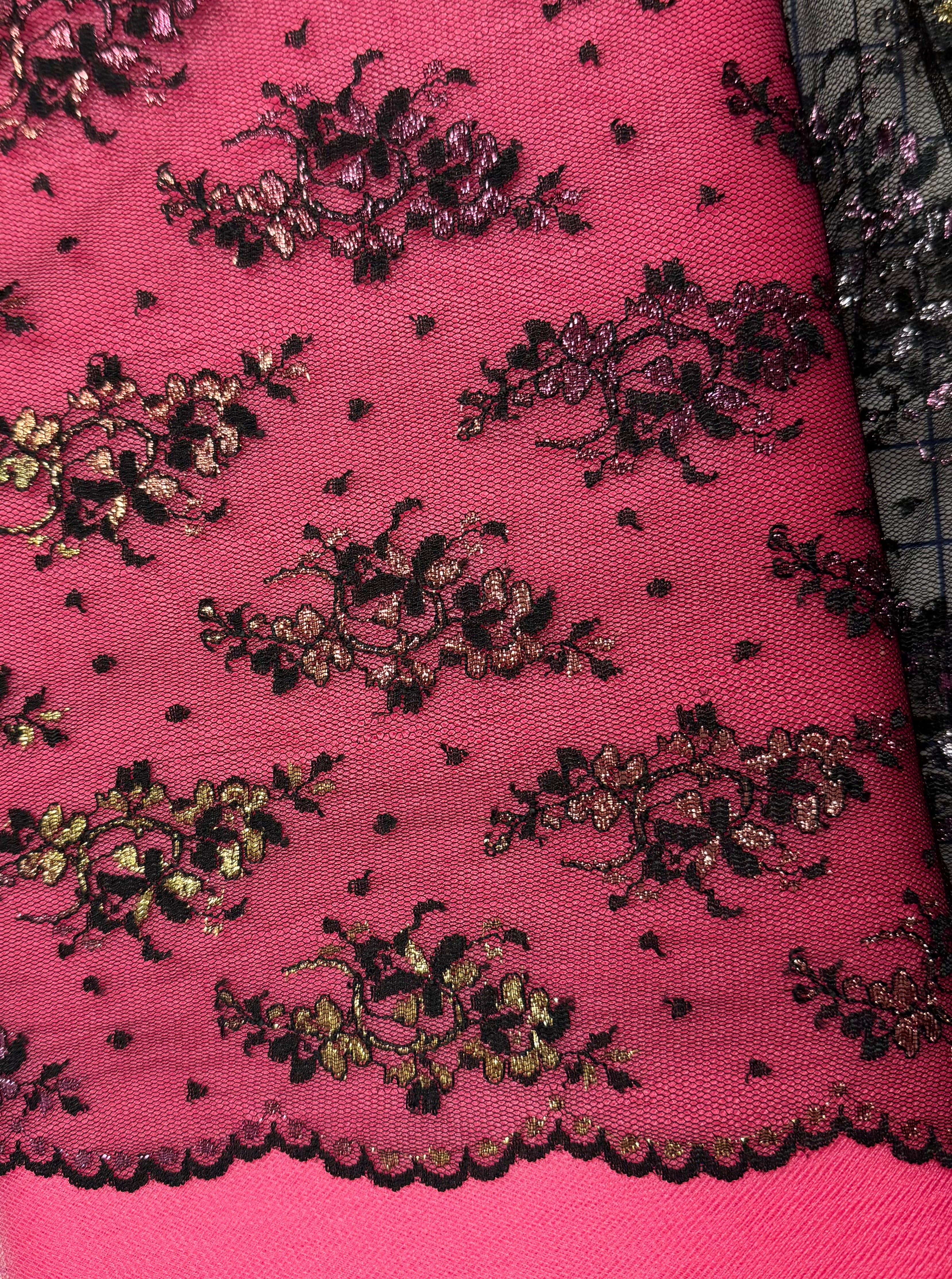 Priced per yard. Beautiful, delicate black lace with many motifs per yard in metallic gold, pink, silver, and copper. 5o-inches wide. Very lightweight. Some stretch across the width. mall scalloped border on each selvage.