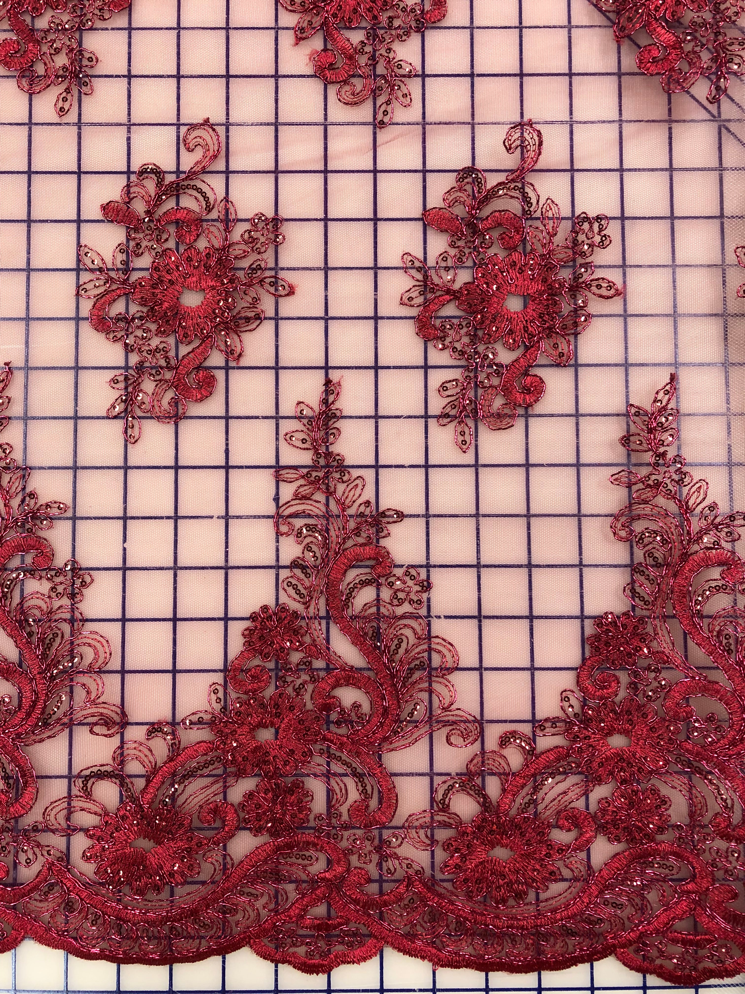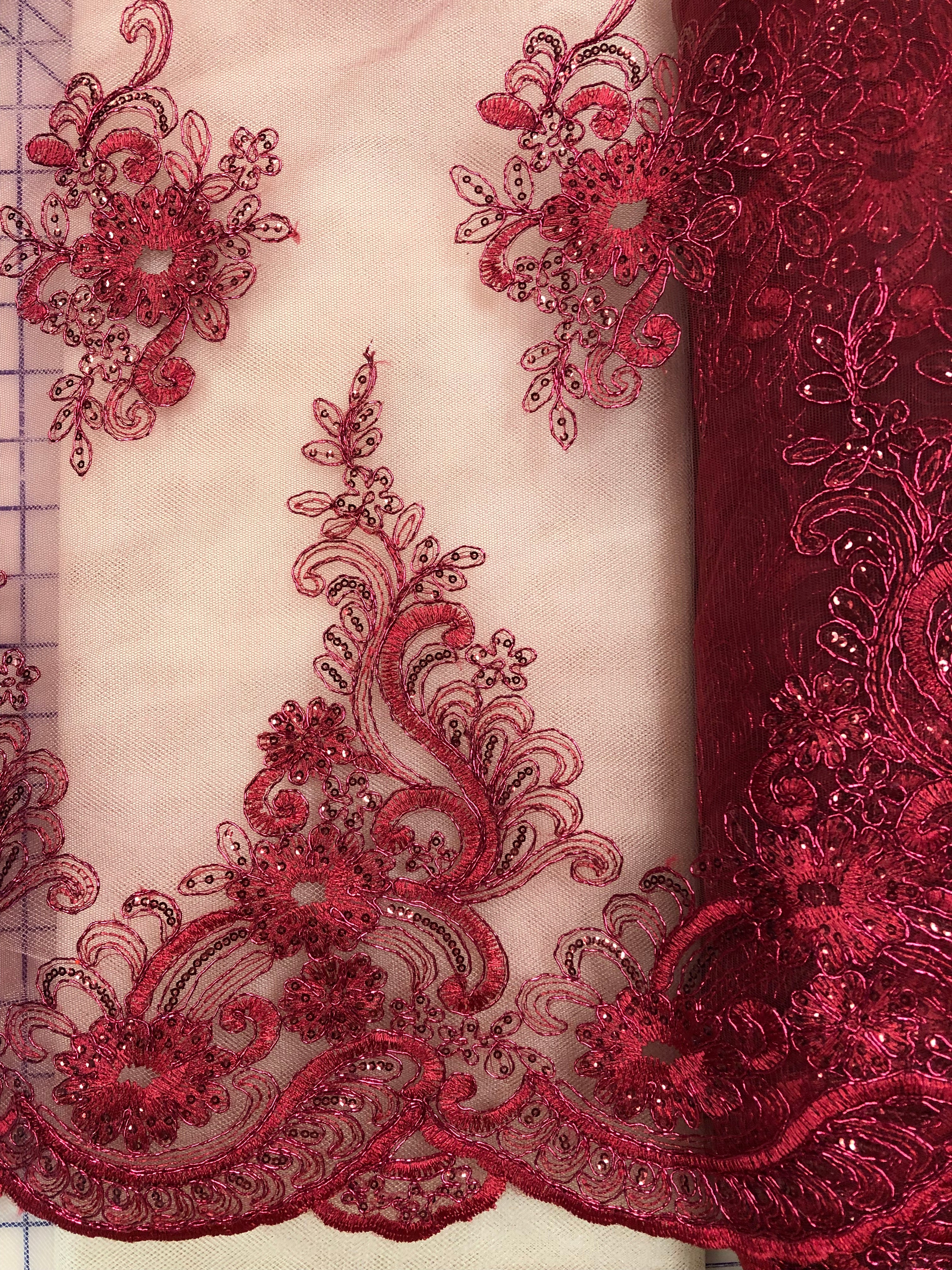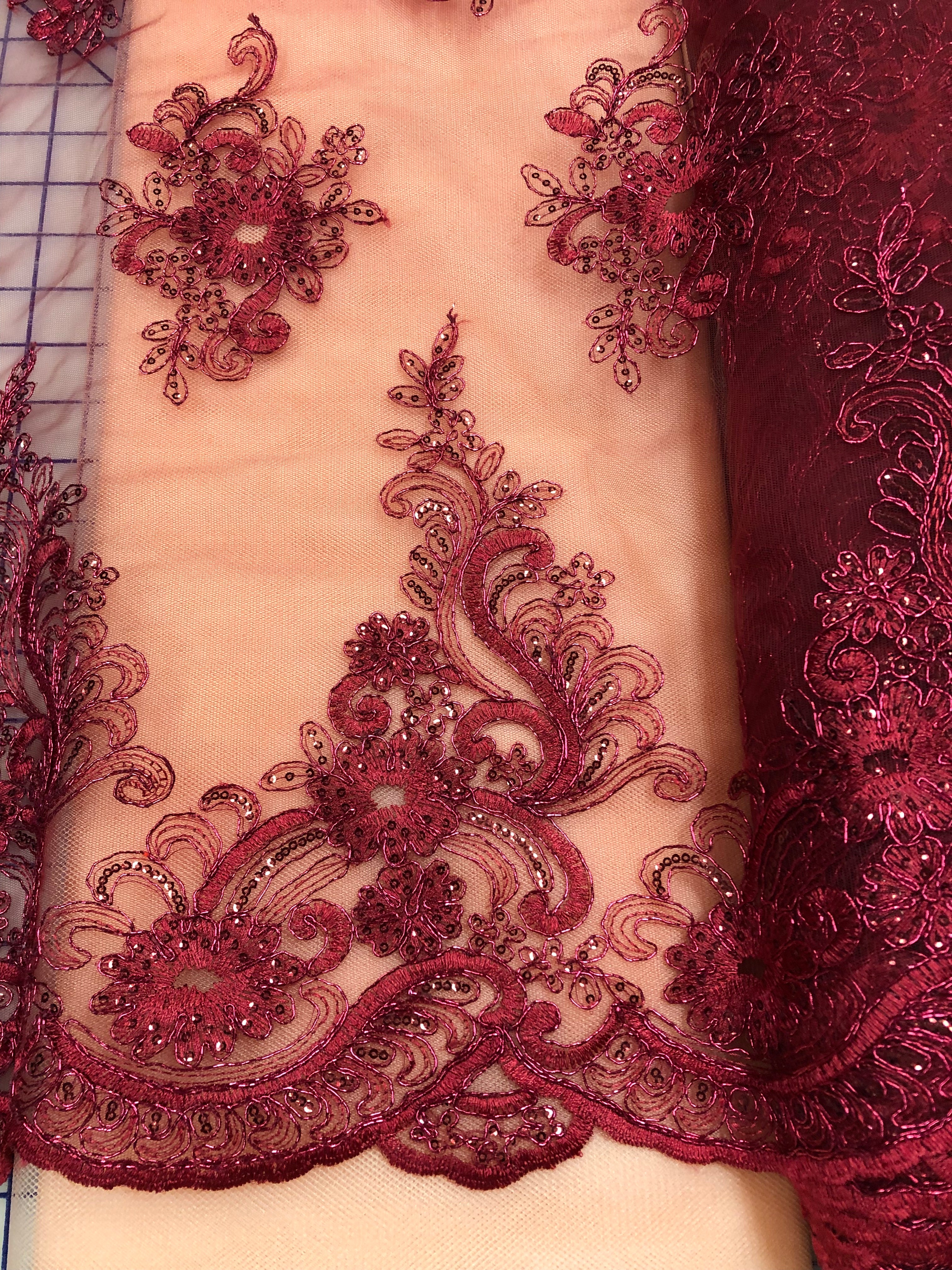 Priced per yard. Burgundy corded, sequined, border lace. 52-inches wide.