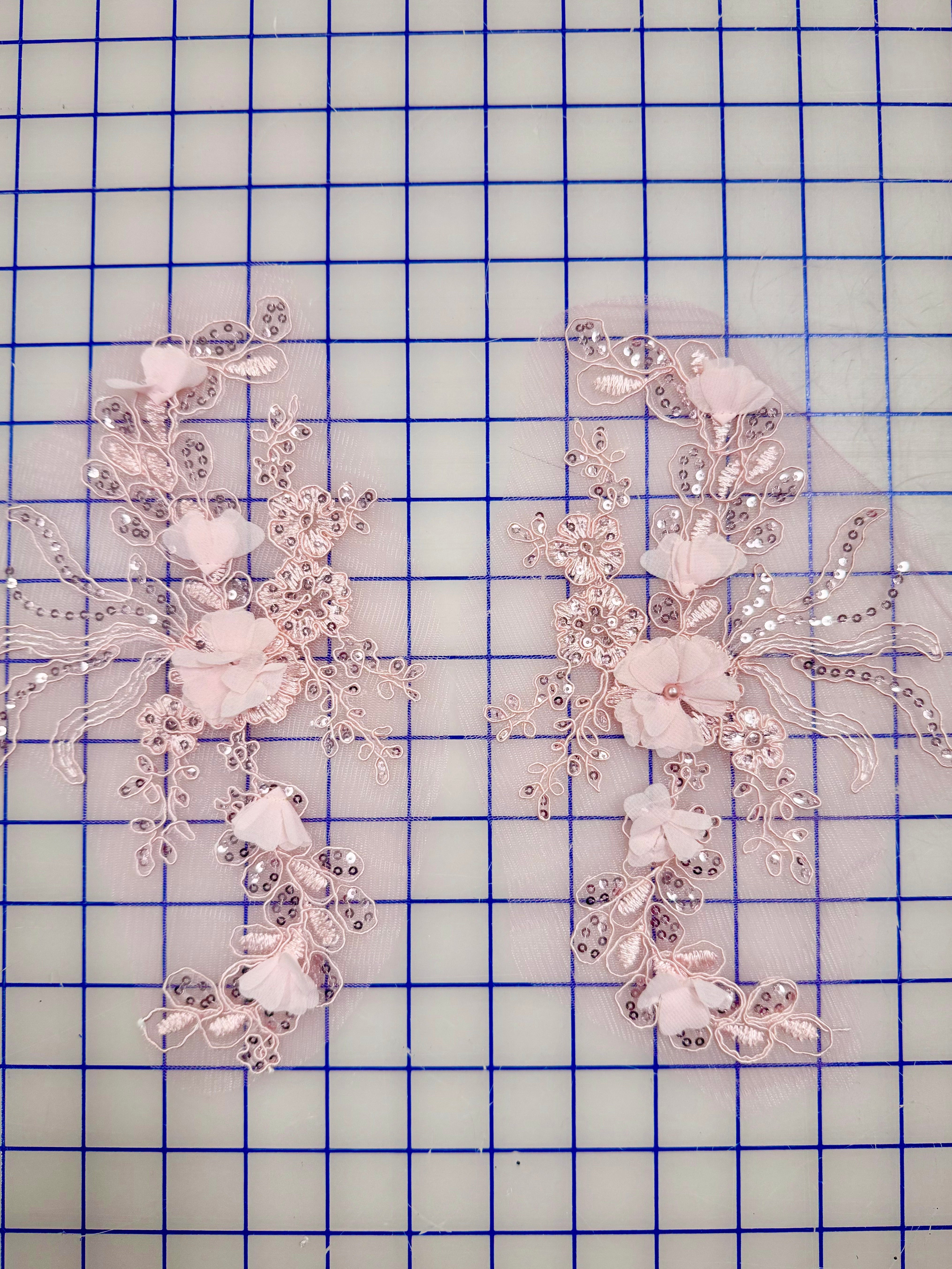 Priced per pair. Rose pink, corded, sequined, embroidered 3D lace applique pairs.